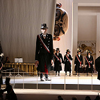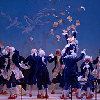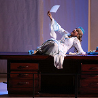 Прежде всего, скукой веет от сценического оформления (Маратра выступил и в качестве сценографа). Первая картина разворачивается на авансцене, в то время как во все зеркало сцены почти у оркестровой ямы висит голубой занавес, имитирующий небо с белесыми облачками: сам по себе симпатичный, он надоедает уже через пять минут. Смена его во второй картине на занавес цвета беленого холста с квадратной прорезью посредине, в которую вставлена скучная белая коробка – комната Розины, – ситуацию кардинально не меняет: занавес висит до конца акта, утомляя однообразием.