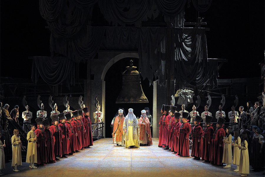 Мировая премьера «Бориса», как известно, состоялась в Мариинском, и театр сохраняет верность авторской редакции Мусоргского. В спектакле Тарковского использована вторая (сводная) версия, в которой в 1874 году и произошло рождение оперы для публики. В отличие от оркестровки Римского-Корсакова, оригинал звучит более камерно и совсем не помпезно, иногда «бедновато» и сухо, но, бесспорно, более выгодно для певцов – голоса всегда оказываются на первом плане, не тонут в оркестровом буйстве, у публики есть возможность понять каждое пропеваемое слово. Оркестр Валерия Гергиева, для которого Мусоргский – русский композитор номер один, звучит исключительно бережно по отношению к вокалу, а по основному «интонационному настрою» – щемяще-пронзительно, страдальчески, если не молитвенно.