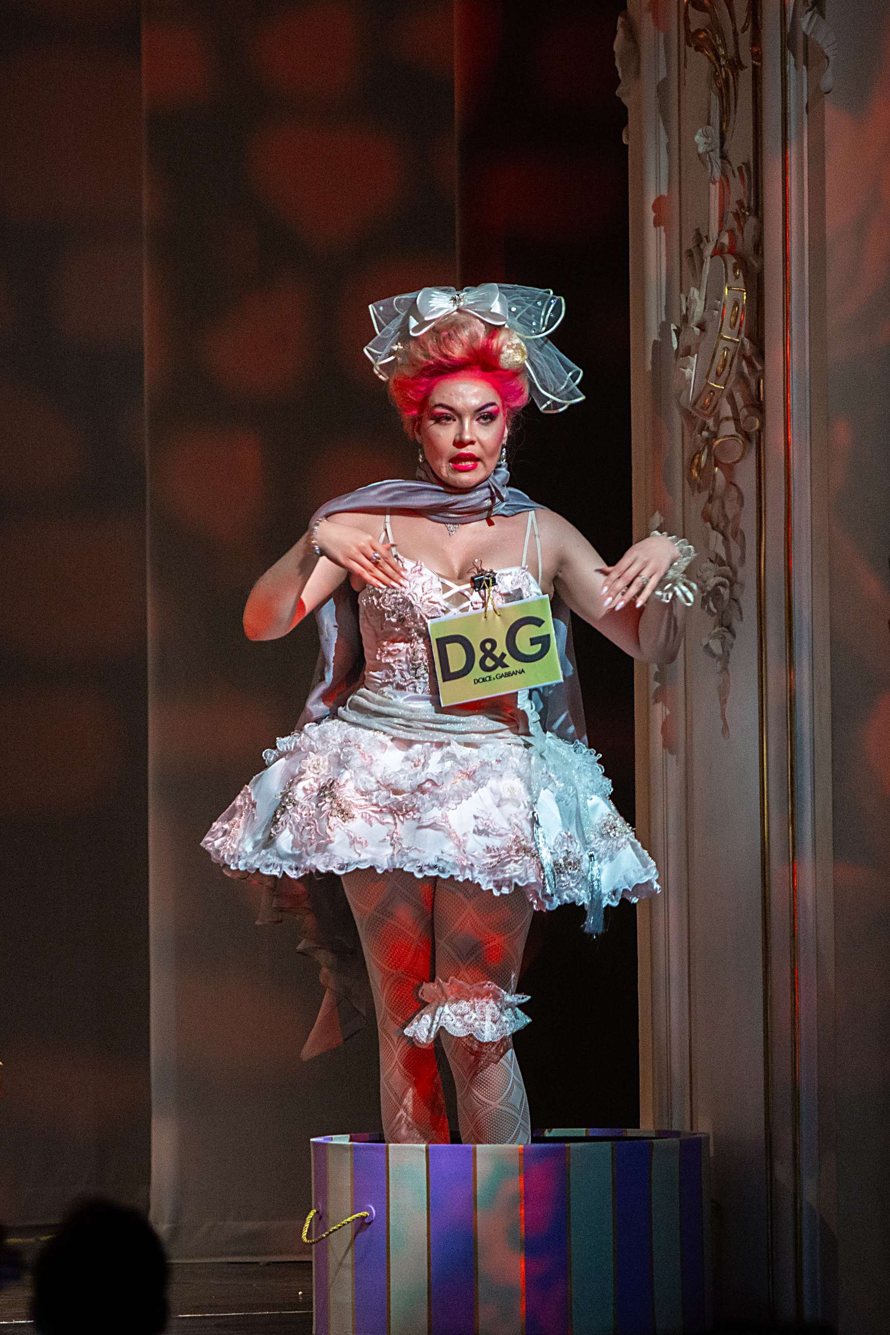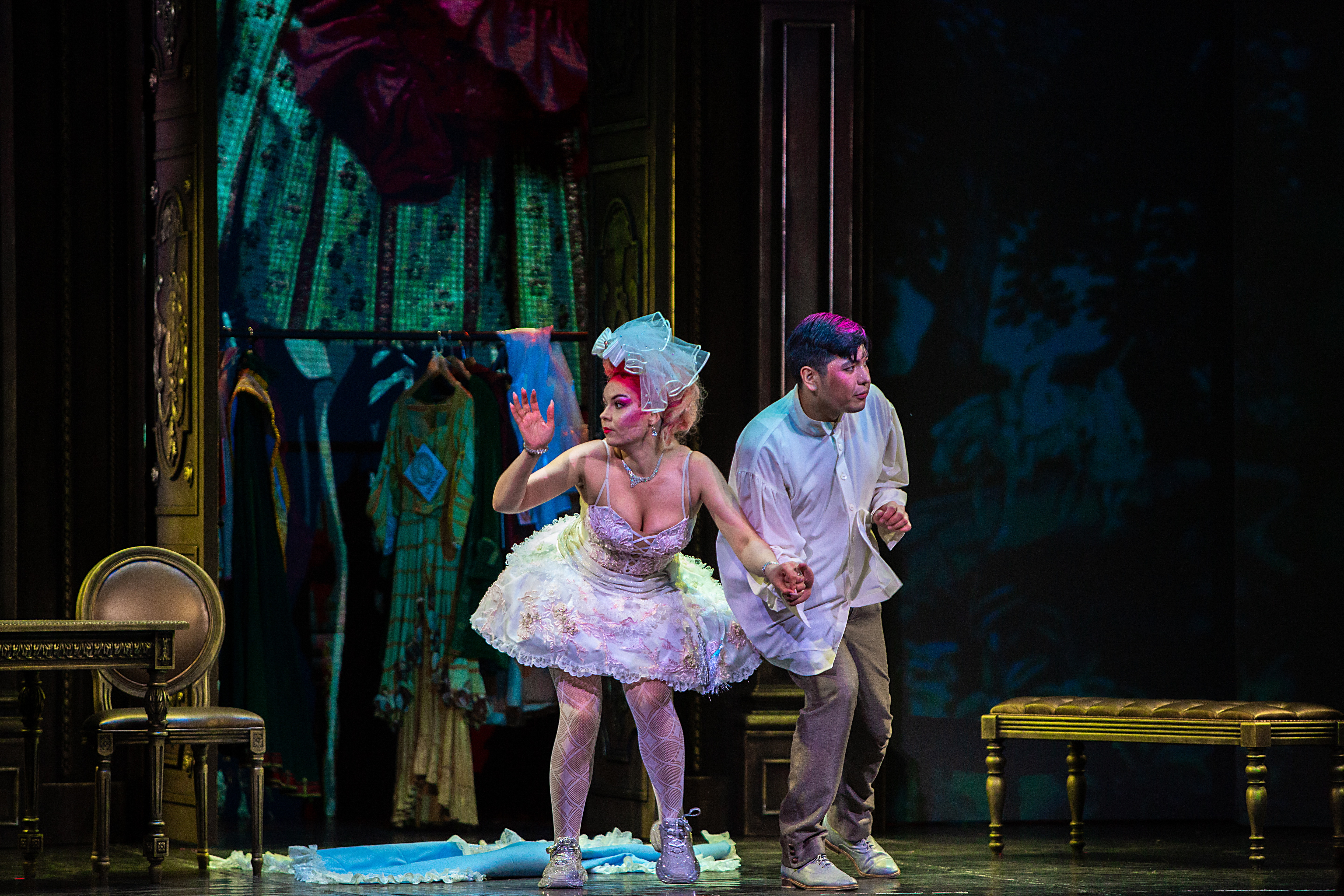 При этом художник Вячеслав Окунев вписал действие в раму как бы барочного театра. Например, прически с высокими начесами немыслимых цветов у дам, наряды, отсылающие к моде XVIII века и одновременно пародирующие ее, выпячивая все ее странности и несуразности. В целом костюмы отличает не просто эклектика, а невероятный фьюжн, сопрягающий заведомо несочетающееся, – кринолины в розочках и кроссовки в серебряных стразах у главной героини Каролины. Центральный элемент сценографии – массивная резная дверь-портал, за которой скрывается бесконечный гардероб дамских платьев – «сокровища» капризных Лизетты, Каролины и Фидальмы. Видео-арт Георгия Савельева заменяет привычные декорации, в первом акте помещая действие в кущи сада, вот втором – возвращая в обтянутую гобеленами залу, ближе к финалу «роняя» и «разбивая вдребезги» массивную люстру в проеме портала, а в самом конце демонстрируя в нем же роскошную картину в стиле аллегорической живописи барокко. Естественным продолжением этого визуального ряда служит квазибарочный декор зала театра барона фон Дервиза, в котором проходят спектакли «Санктъ-Петербургъ Оперы».