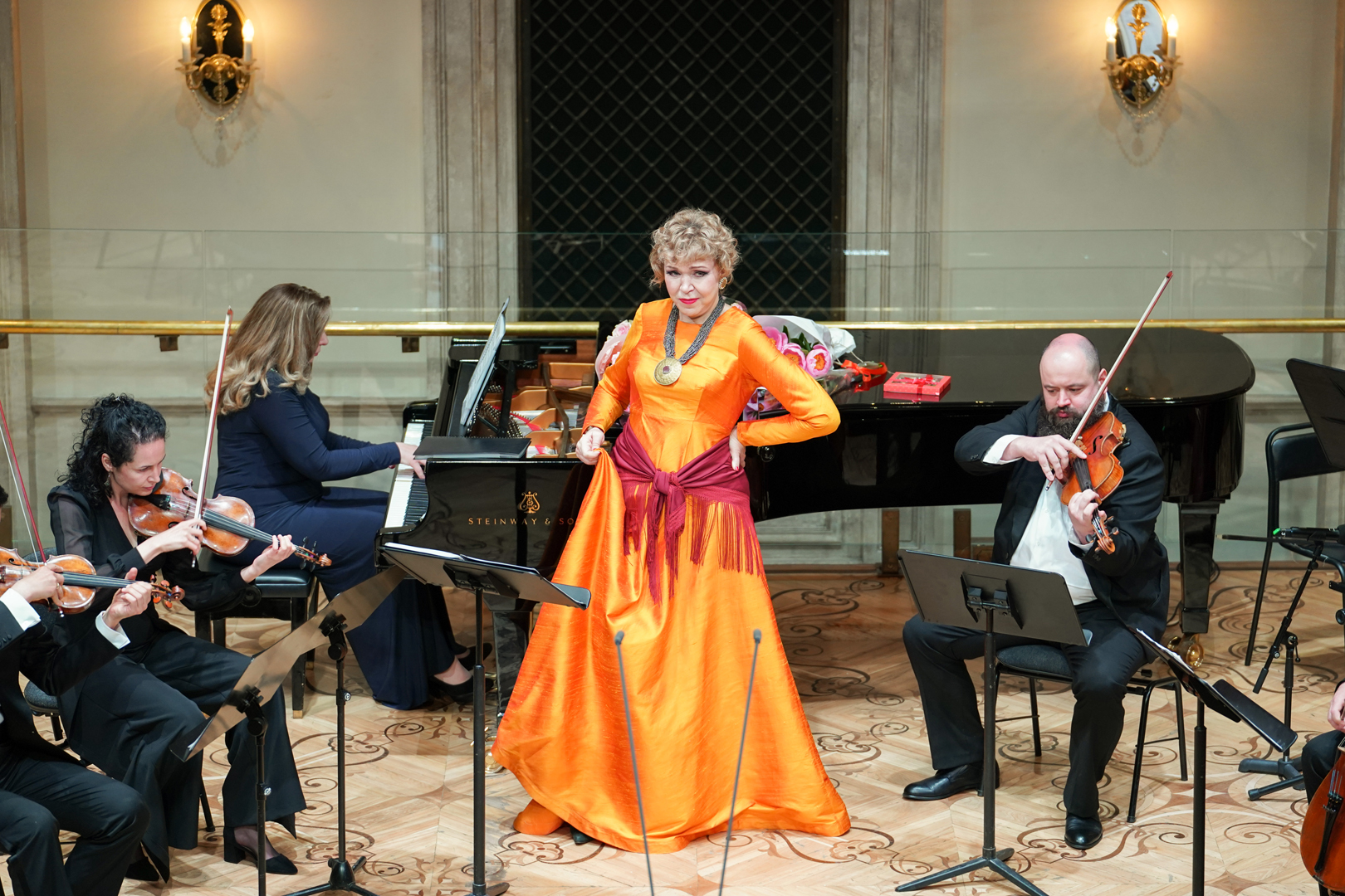 Все это мастерица вокала и яркая актриса Дурсенева с блеском продемонстрировала в Бетховенском. Глинка, Мусоргский, Рубинштейн – антология русской классики соседствовала с западными шедеврами из разных «гардеробов»: Малер, Россини, Дворжак, Сен-Санс, Леонкавалло, Де Фалья. Стилистическая пестрота уместна на юбилее – певица показывала голосовые и артистические возможности, их широчайшую палитру: колоратурный Арзаче контрастировал томной соблазнительнице Далиле, а меланхолическое «Не искушай» – характерной «Мавританской шали». Эта мозаика была объединена неоспоримой культурой пения, свободой сценического бытия и уникальной красотой звучания необычного голоса, в котором и патока, и бездны, и материнская доброта, и пугающая тайна.