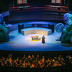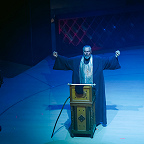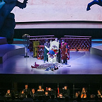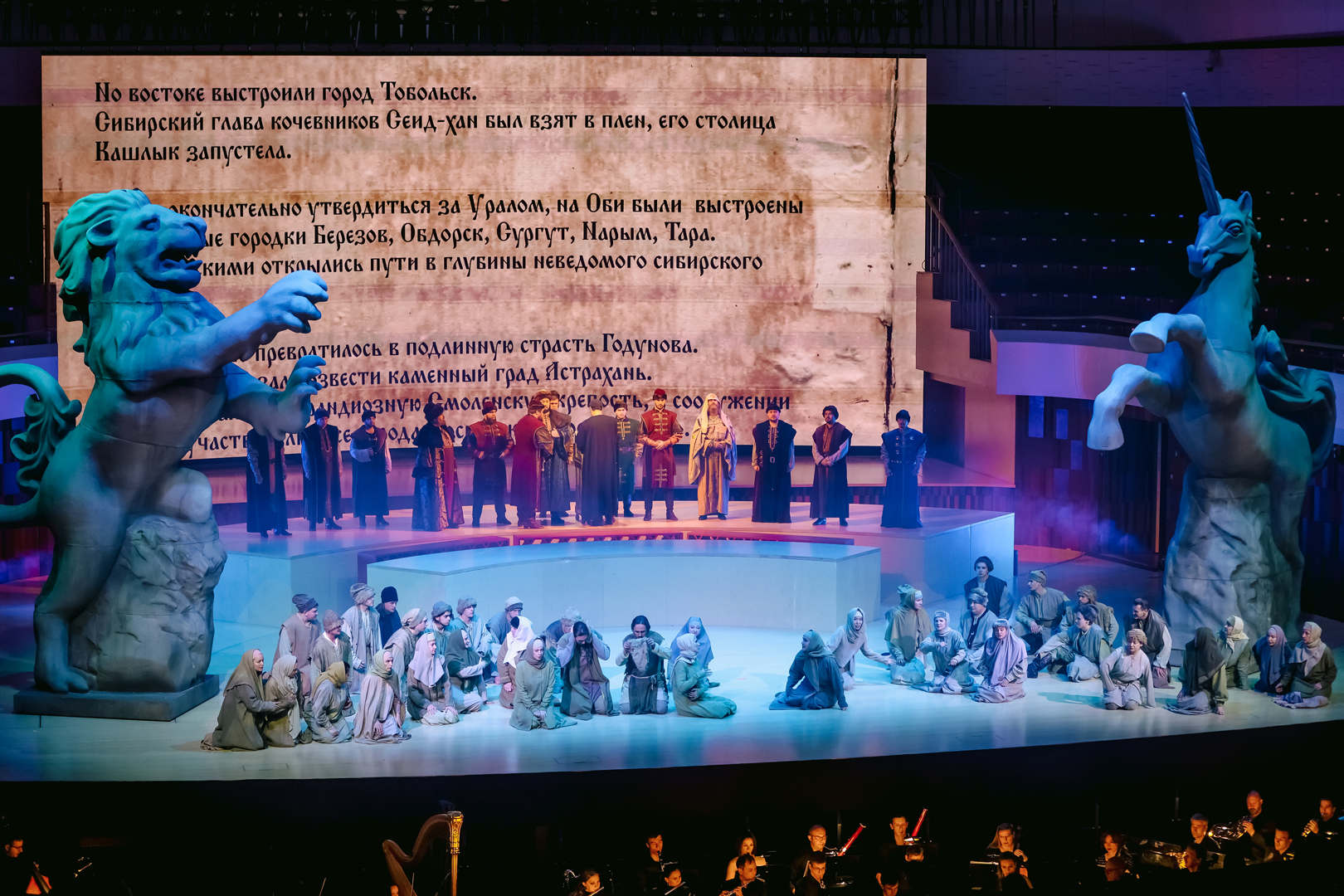 Концертный зал для реализации столь масштабного полотна, как «Борис», – не самый лучший вариант, даже если это такой технологичный зал, как «Зарядье». В нем открыли оркестровую яму, орган завесили экраном для видеопроекций, в сцене у Василия Блаженного с колосников спустили гигантский тканевый полог – на него проецировали изображение Покровского собора, – который при появлении царя ниспадал, обнажая внутреннее пространства храма и «приглашая» толпу напрямую пообщаться с правителем; в сцене в Боярской думе полукругом поднялись хоровые станки, превратив царский совет в подобие римского сената.