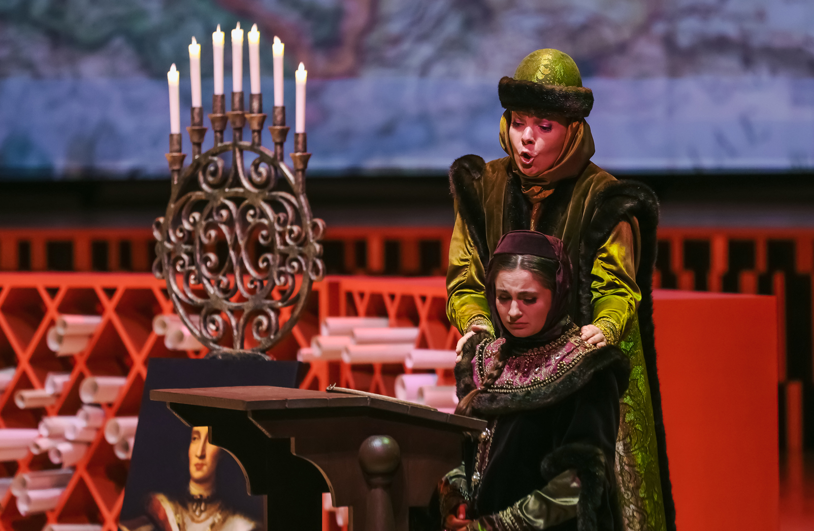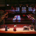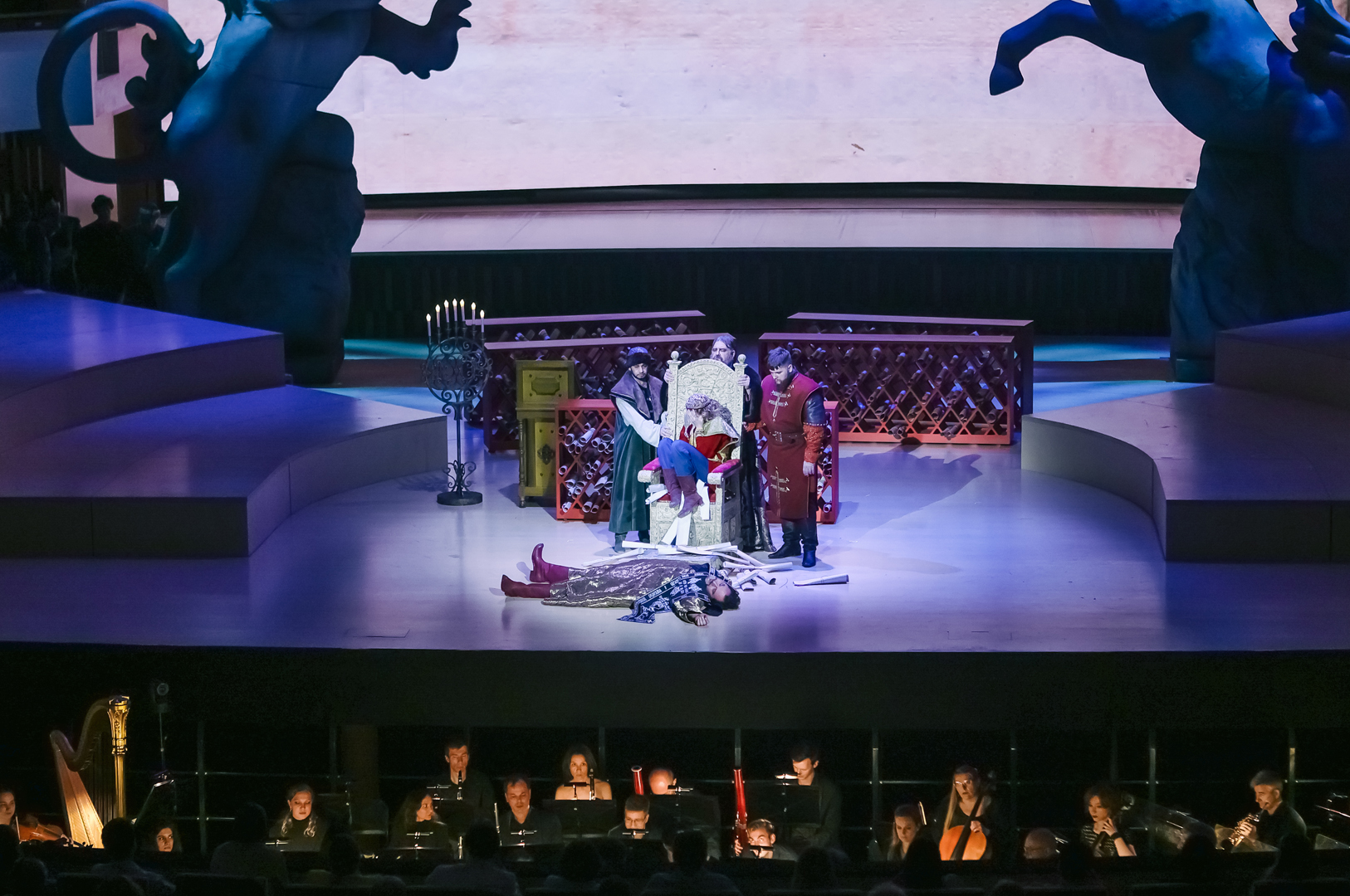 Какая-никакая символика в спектакле все же была. Полукругом расставлены красные шкафы-перголы: в их бесчисленных углублениях – свитки. Идею можно интерпретировать так: Борис – царь просвещенный, все у него учтено и под контролем, мудростью свой ум он просветил, того же желает как своим детям, так и народу в целом. Можно и иначе прочитать: Борисово царство – мир доносов и интриг, подложных грамот и фантастических небылиц, которым охотно верит толпа. С этим все более-менее ясно. Но как только публика входит в зал, лишенный занавеса, она видит две исполинские фигуры – льва и единорога. Символы многозначные, имеют место в различных культурах, в том числе и в русской традиции, однако для подавляющего большинства самый очевидный ответ – это герб Великобритании, англо-шотландского союза. Какое отношение заморская держава имеет к Смутному времени – сиди и гадай, тем более что бесконечно ползущие по экрану титры однажды упомянут поздравление королевы Елизаветы царю Борису с восшествием на престол, то есть факт признания британской короной новой русской династии.