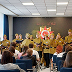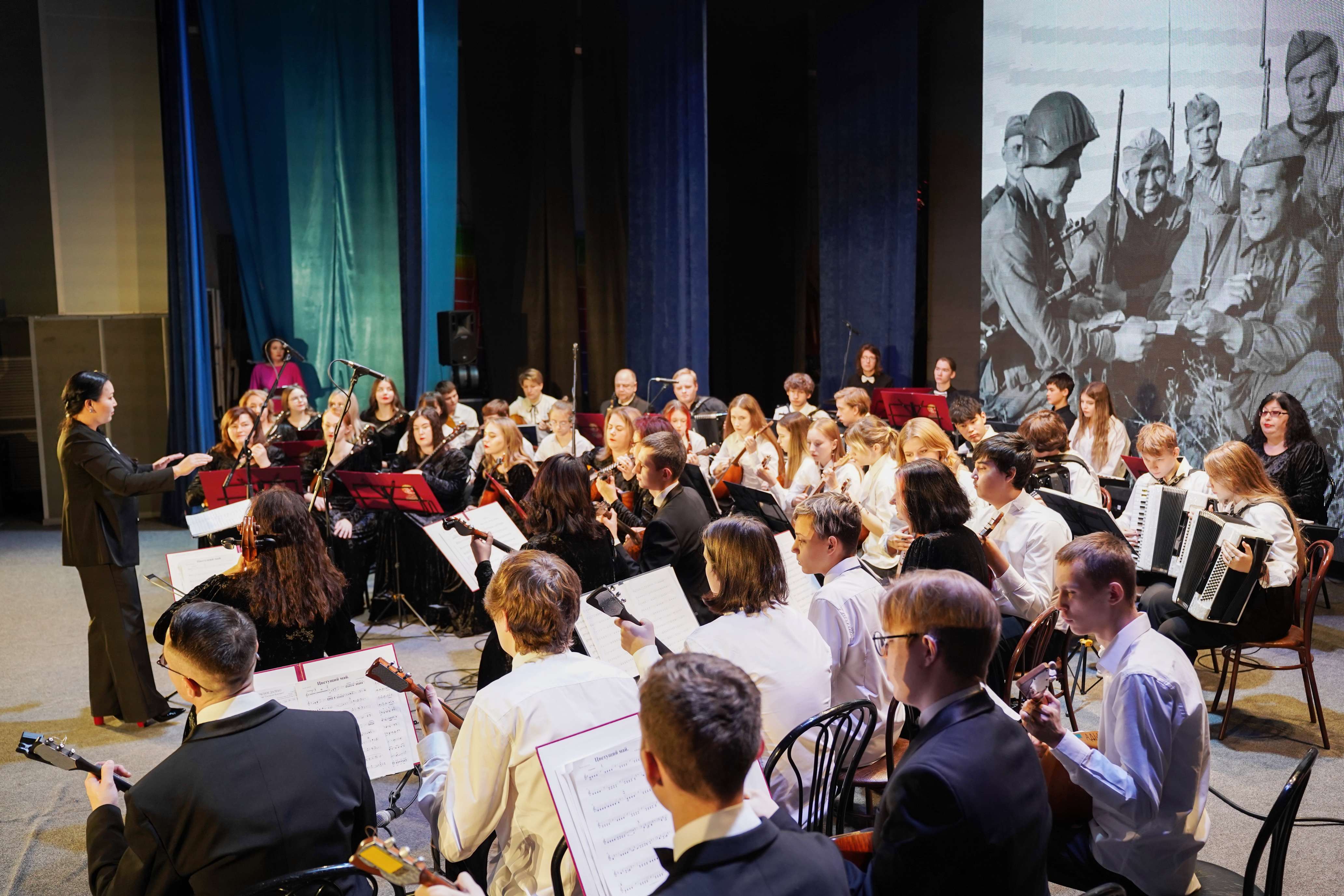 В год 80-летия Великой Победы юные музыканты оркестра внесли свой вклад в празднование великой даты. «Вахта памяти» - так называлось общегородское мероприятие, на котором коллектив выступил совместно с хором ветеранов, вокальным ансамблем Филиала Якутского музыкального колледжа (училища) им. М.Н. Жиркова и артистами ГКОЯ. Такое мероприятие проводится ежегодно для учащихся старших классов всех школ города. Зал был полным, ребята слушали очень внимательно, и это было особо ценным.