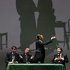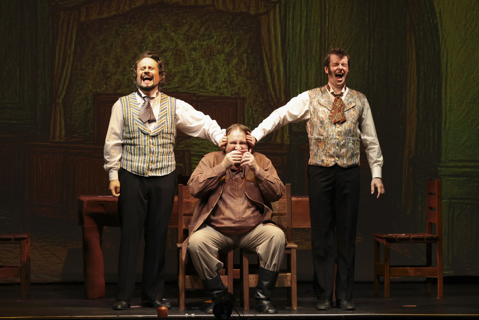 Но за пределами этих схожестей пропасть между двумя сочинениями открывалась огромная. «Женитьбу» автор не инструментовал, а в «Игроках» — изобретательнейший, остроумный, расписанный для тройного состава оркестра «текст», полный головокружительного драйва. В сравнении с этаким пиршеством опыт Мусоргского (в данном случае в оркестровке Наговицына) — милые музыкальные посиделки. И эти посиделки Дзамболат Дулаев, Руслан Бабаев, Ульяна Бирюкова провели блестяще, разве что пока не избавившись от излишней, возможно, премьерной, ажитации, из которой вытекал некоторый пережим. «Игроки» обещали испытания пожестче. Басовитым слугам, подающим голос не каждую минуту, — что. А вокалисты-игроки могли скоро подустать в азартном беге по нотам, перманентных поисках новых красок, изнуряющих вычерчиваниях изгибов прихотливой фразировки — и подустали, не исключая самого яркого и стабильного из них, Азамата Цалити, певшего заводилу шулеров Утешительного. Однако оркестр, который вел дирижер Айрат Кашаев, летел к финалу, не сбивая дыхания и не путаясь в калейдоскопе темпов, настроений, жанровых крайностей. И долетел. Напомним — к тому, чего в шостаковических «Игроках» нет. А в спектакле есть, и даже в двойном выражении.