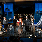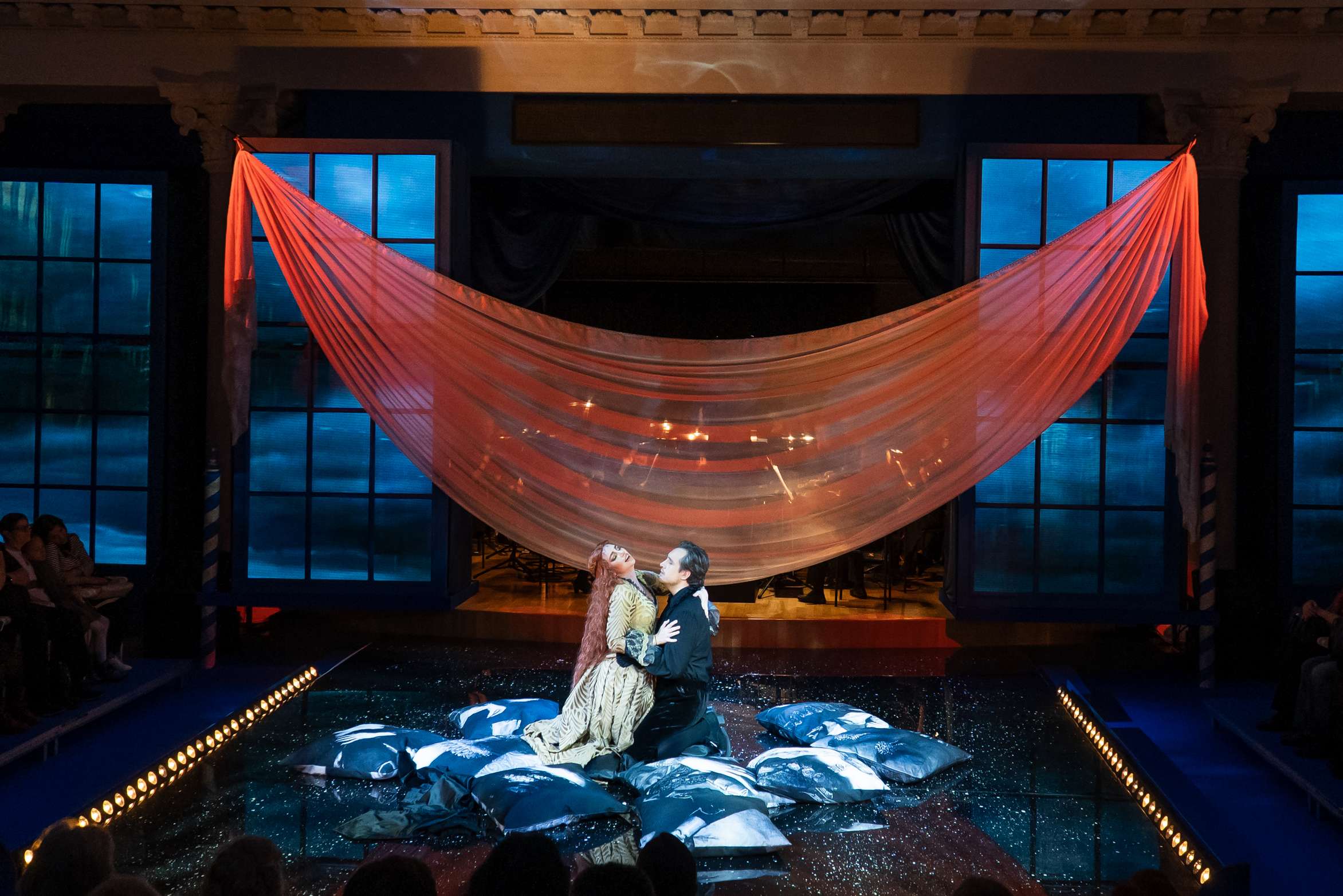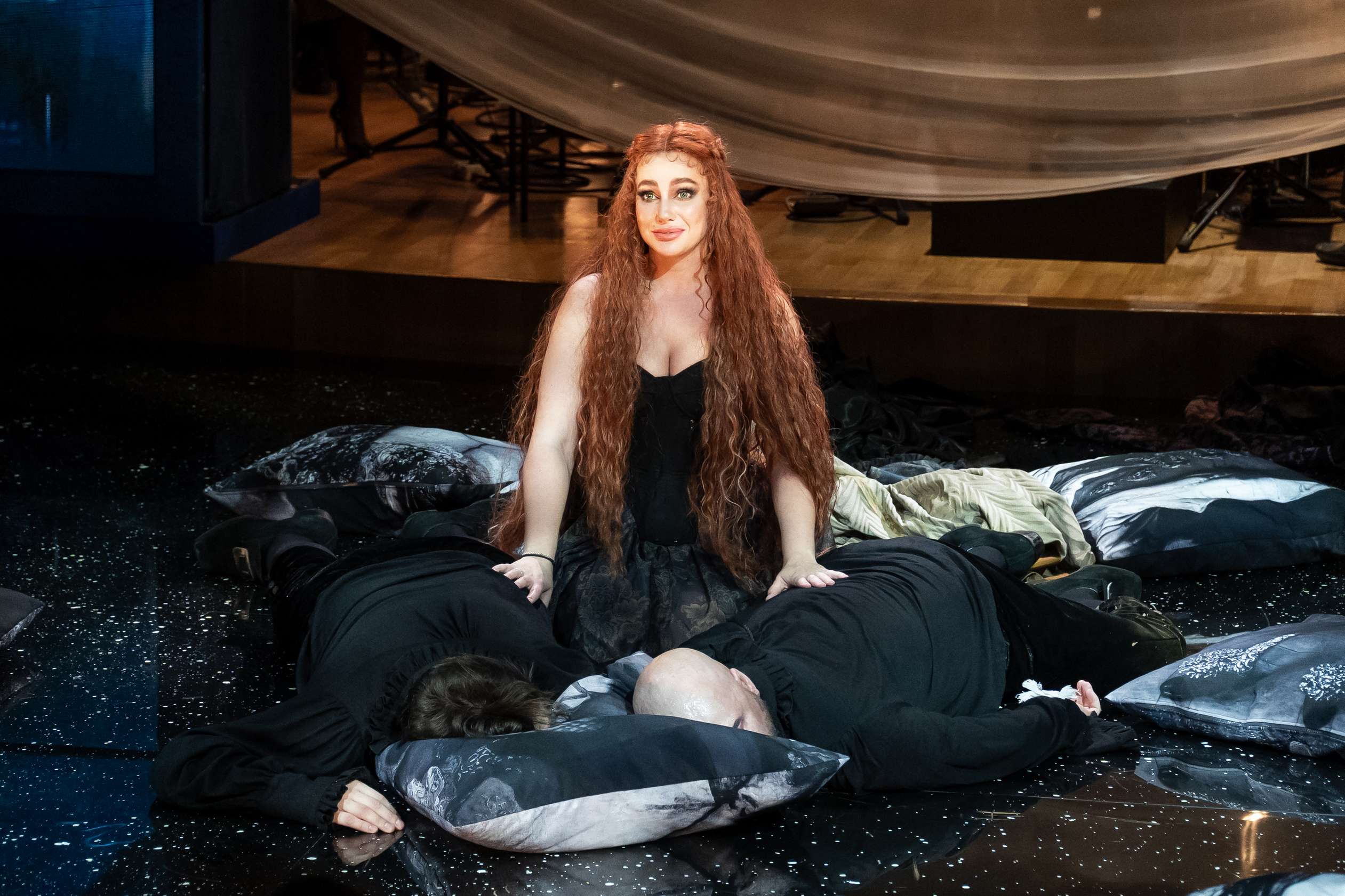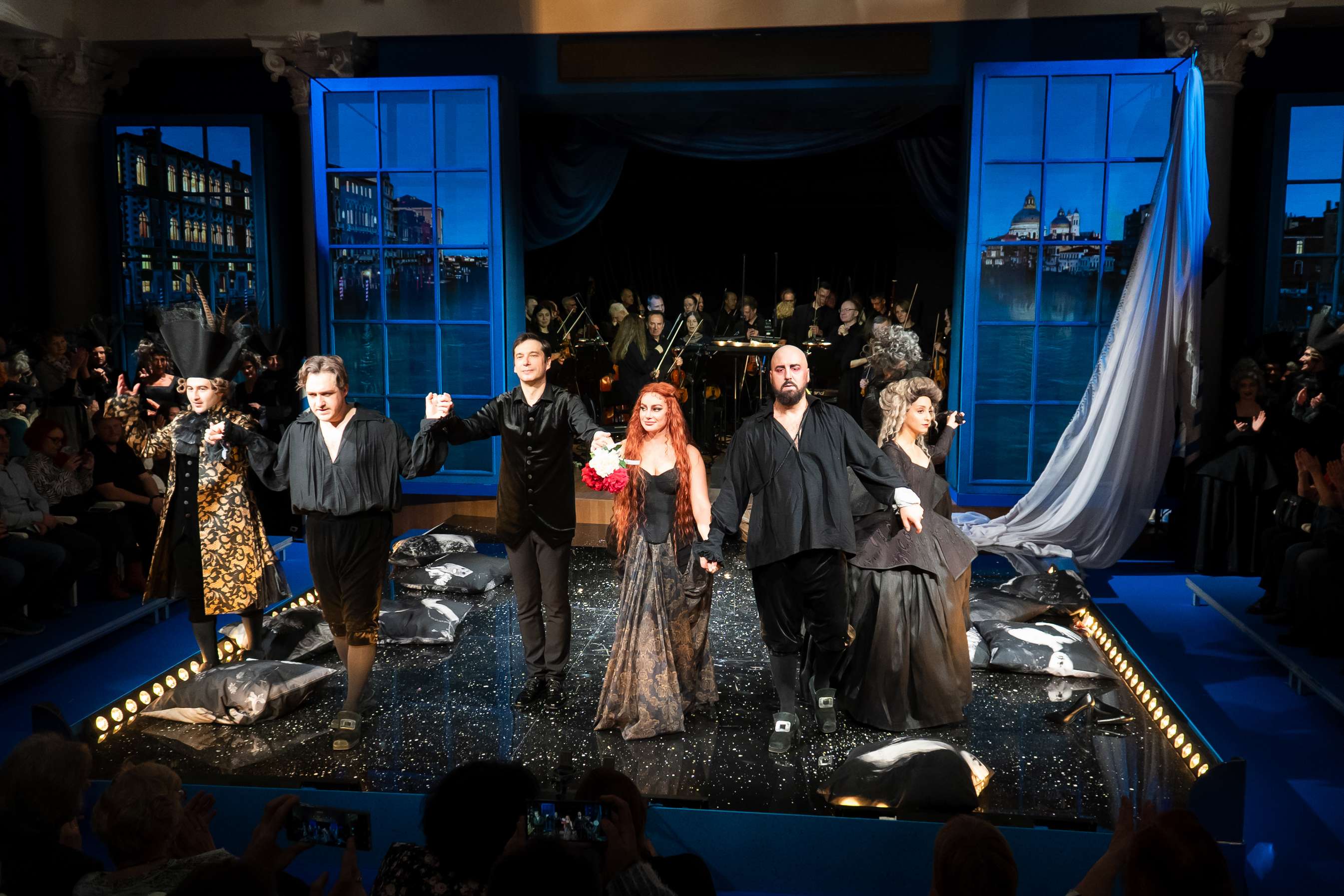 Режиссер Илья Ильин не перемудрит с мизансценами. Художник Ростислав Протасов подпустит символизма — раскинет за «окнами» Венецию (куда и отсылает оригинальный сюжет), сделав акцент на ее водах с намеком на омут, в котором известно кто водится, а в «доме» на черный помост набросает черных подушек с изображениями белых рук и лиц, что явно неспроста: это след тех, кто до того почивал здесь в объятиях ненасытной Маддалены. Сама героиня — рыжая, в пышных ренессансных одеждах, в каких выводила ее в своей пьесе фон Ливен. Лицом — на загляденье, пусть и прикрыто оно несколько натужно «маской» демонического. Голосом тоже красавица, мастерством — притом что партия сумасшедшая по диапазону и экспрессии — почти идеал. Такова была, по крайней мере, Ольга Толкмит, одна из четырех исполнительниц титульной партии. В «супруги» ей дали Давида Посулихина, мастерски погружающего в нирвану своими истаивающими фальцетными верхами и выразительностью в изображении каждого изгиба чувств. В «любовники» определили брутального Дмитрия Янковского. Совершенству его сценического образа мешало одно: певец буйствовал с первой до последней ноты. Объяснение как будто находилось: его персонаж определенно был в аффекте, доведенный чуть не до сумасшествия спонтанными явлениями загадочной особы, которую за власть над собой называет колдуньей, — но большего разнообразия красок хотелось бы. Хорош был, наконец, оркестр под управлением Валерия Кирьянова — стройный, пряный, знающий свое место (то бишь перманентно памятующий о балансе вокальных и инструментальных сил). Но ко всей этой красоте полагался еще и эффектный бантик, довершающий облик постановки.