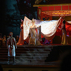 Еще один сюрприз – постановочная стилистика спектакля. На весьма небольшой сцене театра режиссер Николай Покотыло в содружестве со сценографом Эрихом Вильсоном, художницей по костюмам Татьяной Кондрычиной, хореографом Дмитрием Пимоновым и световиком Сергеем Шевченко создал пленяющее красотой сказочное действо, классическое в своей основе, повествующее о традиционном Китае (или наших представлениях о нем). В центре, чуть в глубине, на невысоком ступенчатом подиуме – изящная пагодообразная беседка с неизменными драконами на углах крыши, по бокам от нее – две трибуны, на которых располагается любопытствующий плебс, за ними же время от времени прячутся пришельцы из Татарии (Калаф, Тимур и Лиу). Все просто, компактно, но необходимые акценты расставлены – у публики полное ощущение, что она заглянула за стены знаменитого Запретного города. Меняются задники, напоминающие традиционную для Поднебесной живопись тушью по шелку, – они не только добавляют экзотики, но и «реагируют» на события: в остродраматические моменты изображения становятся инверсионными, как на фотонегативе.