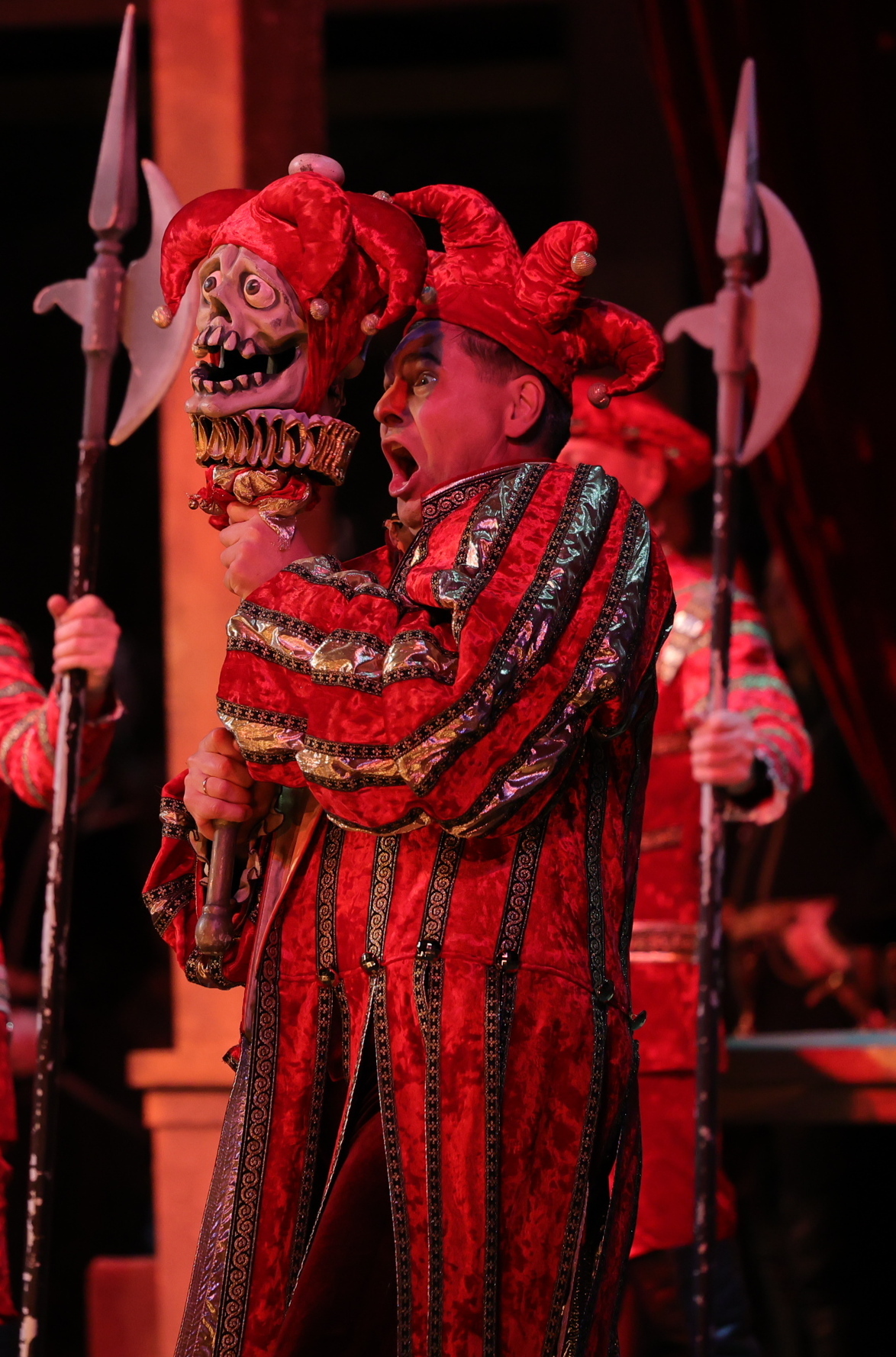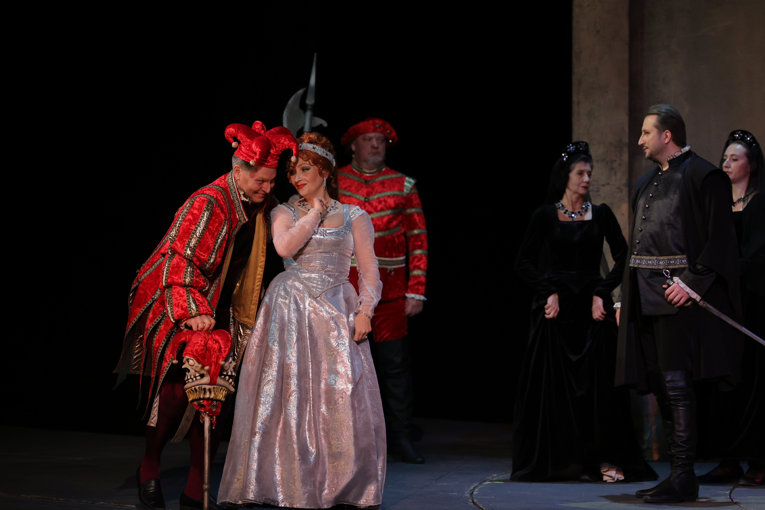 «Риголетто» – постановка эстонца Неэме Кунингаса в соавторстве с финской художницей Анной Контек (2014). Темный, мрачный спектакль (художник по свету Людмила Кунаш) своим «колером» настаивает на фаталистской трагедийности сюжета. Редкие яркие пятна в нем больше похожи на следы крови: шутовской костюм титульного героя в неизменном колпаке с бубенцами, накидка, в которую кутается обесчещенная Джильда, ядовитое платье Маддалены – все это ярко-красного цвета, цвета ненависти, преступления, жестокости, вечной тревоги. В костюмах массовки и второстепенных героев (камзолы, плащи, ботфорты) доминирует беспросветно черный, конституирующий тягостный, почти похоронный контекст. Дворец Герцога – не столько роскошная резиденця, сколько«гнездо мафиозного клана». Светлое платье дочери шута тут абсолютно инородно – как и сам ее образ, как и ее нелепая любовь к негодяю.