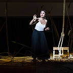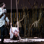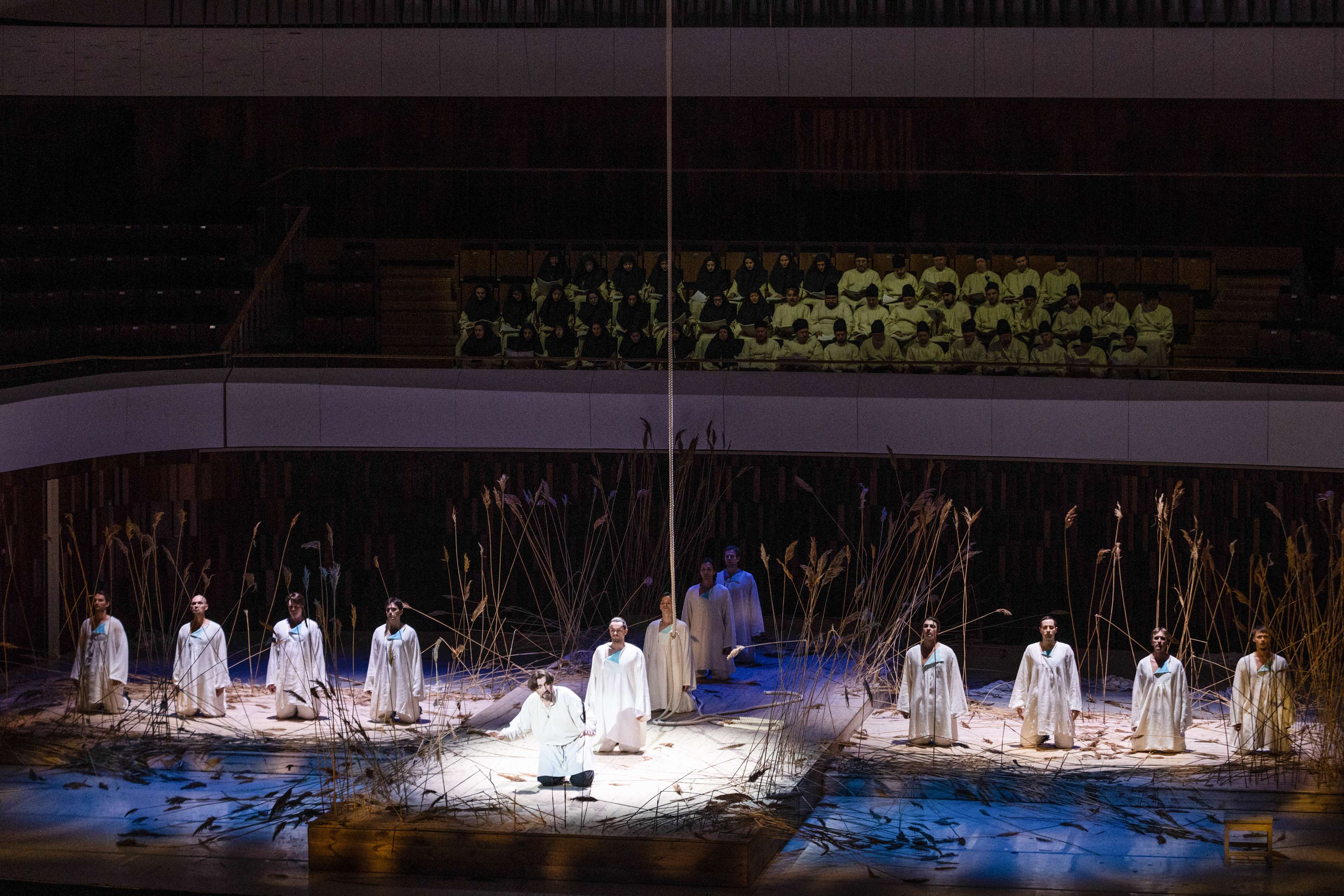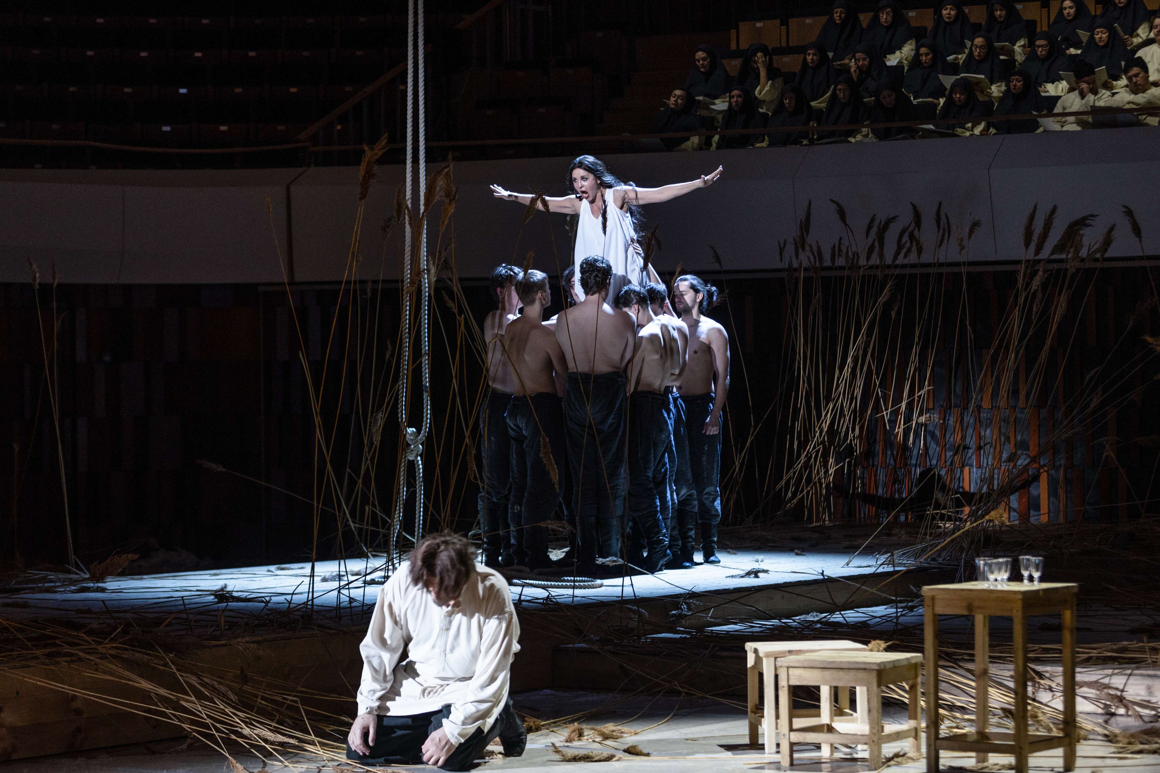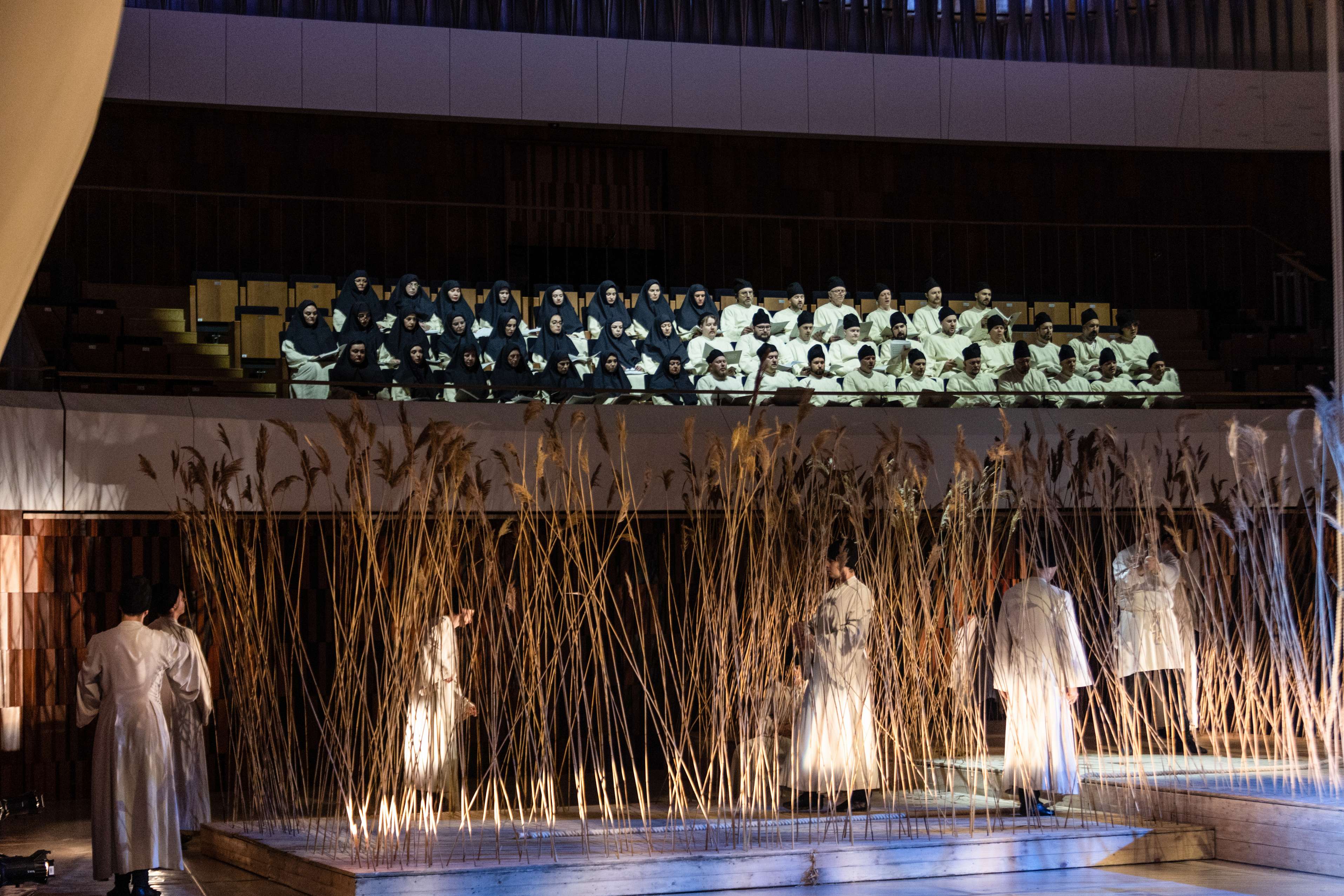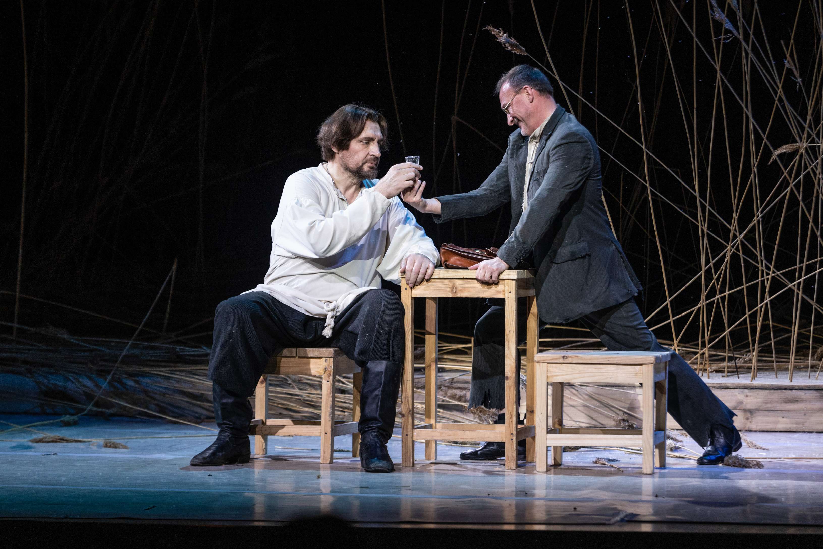 Все, что напридумывал художник Александр Орлов, будет в строку. Вот помост в виде креста, очерченный по краям рядами сухого тростника (это про то, что мы на Валааме). Но стебли скоро от набегов иноверцев сломаются, и тихий хруст под ногами артистов будет слышен на протяжении всего спектакля. Кто б мог представить, что этот звук войдет в музыкальную ткань оперы, как родной! И веревка, спускающаяся из-под сценического поднебесья, сколько раз доскажет нужное: то она татарский аркан, то смертная петля, манящая героя, то паутина, в которой запутается несчастная, брошенная Князем цыганка Груша. Даже хор, одетый по-монашески и рассаженный в зрительских рядах над сценой, окажется словно частью какой-то древней иконы или фрески, с которой сонм святых глядит на мающихся человеков. Но, конечно, не просто глядит, а тихо плачет, утешительно воркует, предупреждает о чем-то страшном, и всё — на том невероятном музыкальном языке, который, кажется, никому не может быть понятен, кроме русских. Однако ж чего только не бывает на свете: выплавлялся этот язык, чтобы перво-наперво поговорить с заокеанской публикой (заказ был от Лорина Маазеля и его Нью-Йоркского филармонического оркестра).