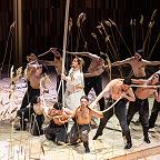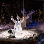 Оркестр в яме. Дирижера нет. В полной тишине почти тенями поплывут на сцену монахи, чтобы приступить к своим послушаниям — ловить рыбу (без удочки), копать огород (без лопаты), косить траву (без косы), само собой, молиться. Пластические, в замедленно-завораживающем темпе этюды сразу возьмут внимание на себя. А потому почти шоком будут вдруг зазвучавшие из ямы оркестровые пиано. Как, кто дал отмашку? Ясно, что Гергиев. Но его выхода мы не видели, и чтобы оркестранты кого-то приветствовали, не слышали. Дирижера как физического персонажа будто бы не было, и получалось удивительное — музыка изливалась, подобно свету небесному, сама по себе. Второе чудо спектакля: этой музыке ничто не вредило. Щедрин писал оперу исключительно для концертной сцены, и когда Гергиев, сначала в «правильном» формате исполнивший опус в Мариинском, через год решил делать спектакль, даже воспротивился: не разрушить бы хрупкий мир «Странника». Но не разрушили.