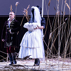 В придачу к нужной температуре ума и заинтересованному взгляду у режиссера Алексея Степанюка имелось и такое достоинство, как стоическое сопротивление искусу неторопливые музыкальные «разговоры» как-нибудь поцветистее разукрасить. И это сопротивление по большей части оборачивалось победой. Оставить публику наедине с музыкой он не боялся, что чуть не революционный шаг в эпоху режиссерского театра. В динамических щедринских апофеозах — цыганском танце и сцене пленения героя благополучно избег иллюстративности, руководствуясь принципом: пою не то, что видимо, а то, что имеет отношение к настроению, каким хочу заразить зрителя. Решился пригласить в спектакль девочку в голубом платочке и с ее помощью чуть-чуть переписать лесковский оригинал, да к лучшему. В повести герой, Иван Северьянович, вспоминает свою жизнь уже послушником Валаамского монастыря. В спектакле он только сейчас, на наших глазах, прощается с ней, чтобы, в последний раз выговорившись, выплеснув все страсти, смириться и принять монашеские одежды из рук самой Девы Марии. А это Она в обличье девочки в голубом платке явится ему. Почему в том нет сомнений? Потому что голубой в православной традиции — Богородичный цвет. И потому что ее явления просто требовала опера как противовеса некоему Магнетизеру, в котором угадывался мелкий бес. За созданием этого образа немного потеряет режиссер чувство меры, выставив на потеху задрипанного мужчинку в мятой шляпе, при галстуке, но без рубашки, и с бухгалтерским портфелем, полным питейных принадлежностей. Не упустить бы сквозь смех, что это по его указке понесут героя ноги к пропасти, куда ухнут и вверенные ему большие деньги, и он сам вместе с Грушей (только она-то — телом, а Иван, столкнувший ее с обрыва, ухнет душой в ад). Однако как не тянул на себя одеяло этот персонаж, девочку в голубом платке он не затмил и поэтически-тонкой графике спектакля сильно не навредил — в отличие от другой сцены, где на специально вытащенной кушетке будут миловаться Груша в полунеглиже и Князь в бархатном домашнем костюме. Но это — единственный минус, который перевешивали во весь ход действия разные плюсы (включая тщательность выписки режиссером ролей и блистательное их исполнение Олегом Сычевым, Андреем Поповым и Екатериной Сергеевой) — да и перевесил окончательно финал.