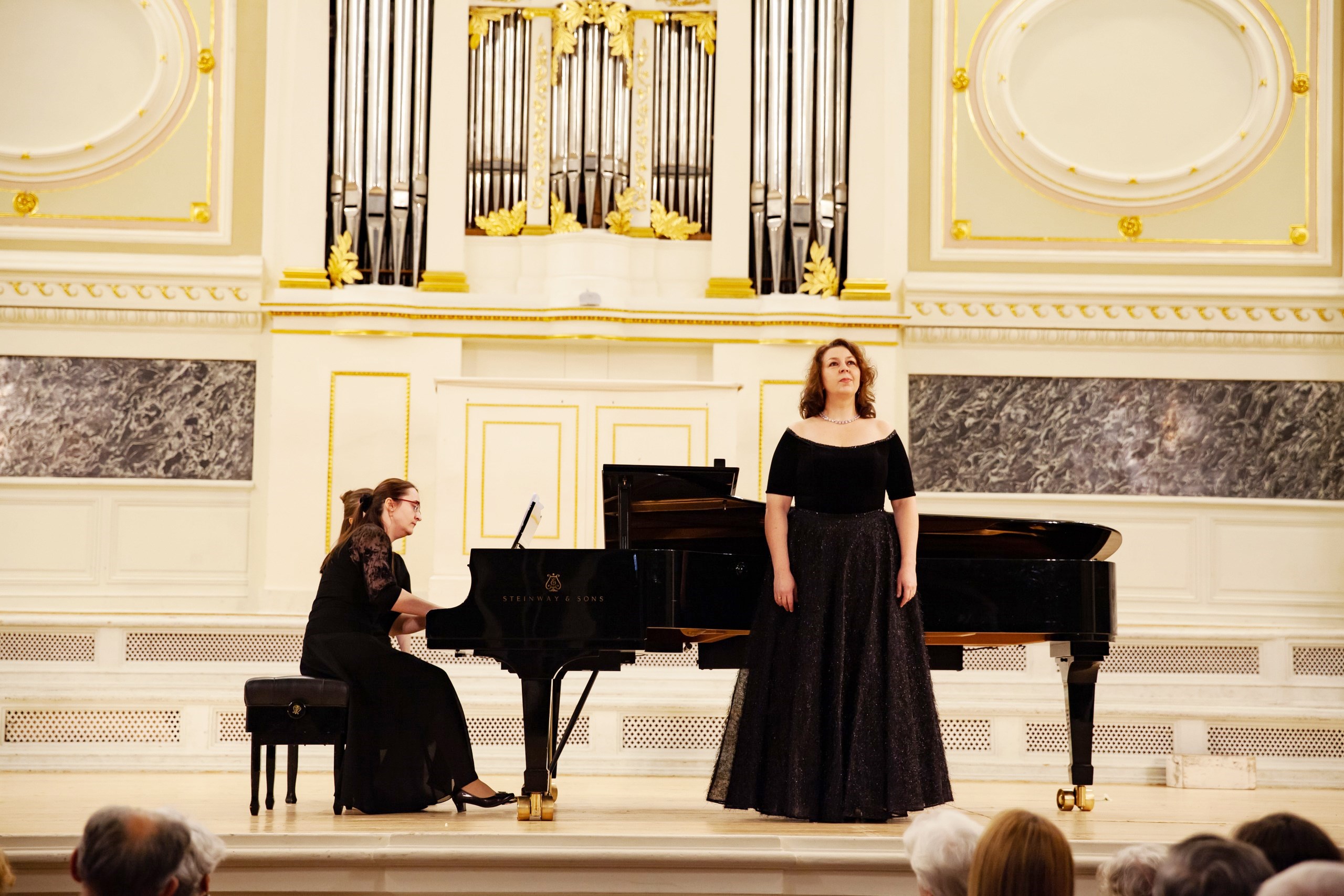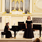 Еще в советские времена, когда проводились социалистические соревнования между отделами по очень разным показателям – активность, участие, выпускники и другие достижения – фортепианный отдел становился победителем. В награду преподаватели получали туры в Прибалтику, на Валаам, что только укрепляло силы пианистов. В школу возвращались выпускники, преподаватели приводили своих детей. Таким образом возникли музыкальные династии в 2-3 поколения. Сейчас в школе работают одиннадцать выпускников фортепианного отдела: четверо из них приняли участие в концерте. Концертмейстеры Анна Анисимова (выпускница класса Г.И.Шевченко) в дуэте с виолончелисткой Ульяной Абрамовой (учащаяся класса О.А.Малаховой) исполнили виртуозную пьесу К. Давыдова «У фонтана» (как тут не вспомнить фонтан-шутиху Петергофа!), а Лидия Шаховская (класс Н.А.Волошиновой) в ансамбле с певицей Анной Писаревой – приподнято-праздничный романс Чайковского «День ли царит». Анна Писарева – тоже выпускница фортепианного отдела (класс Т.В. Лещенко), ныне старший преподаватель вокала Российского государственного института сценических искусств. Преподаватели фортепиано Марина Климова и Наталья Соломко обратились к теме Петербурга – теме, без которой немыслим концерт петербургской школы, чтящей традиции. В их фортепианном дуэте прозвучал вальс «Петербург» Сергея Баневича из одноименного балета-фантазии по мотивам романа Андрея Белого.