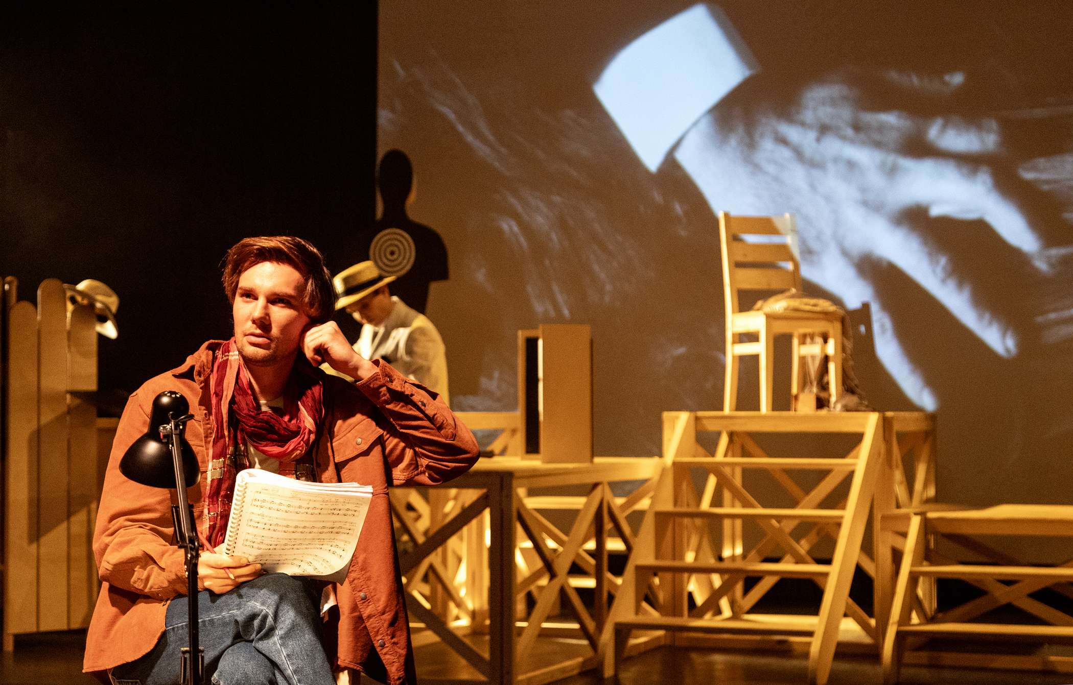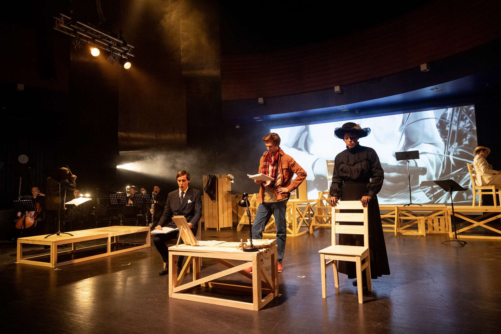 На небольшом пространстве Малой сцены Фомичева и сценограф Станислав Фесько размещают деревянные мини-платформы – подиумы, на которые периодически взгромождаются персонажи и «прокламируют» свои тексты, словно с трибуны. Часто они поют по нотам, с пюпитров, поскольку постановка заявлена в формате семи-стейдж. Костюмы Натальи Осмоловской слегка отсылают к эпохе итальянского драматурга (особенно женские), но в целом вневременны, условно современны. В целом сценическое пространство представляет собой мир закулисья, в котором идет живой театральный творческий процесс, – принцип театра в театре изначально заложен в пьесе Пиранделло и воспроизведен в опере Ламберта.