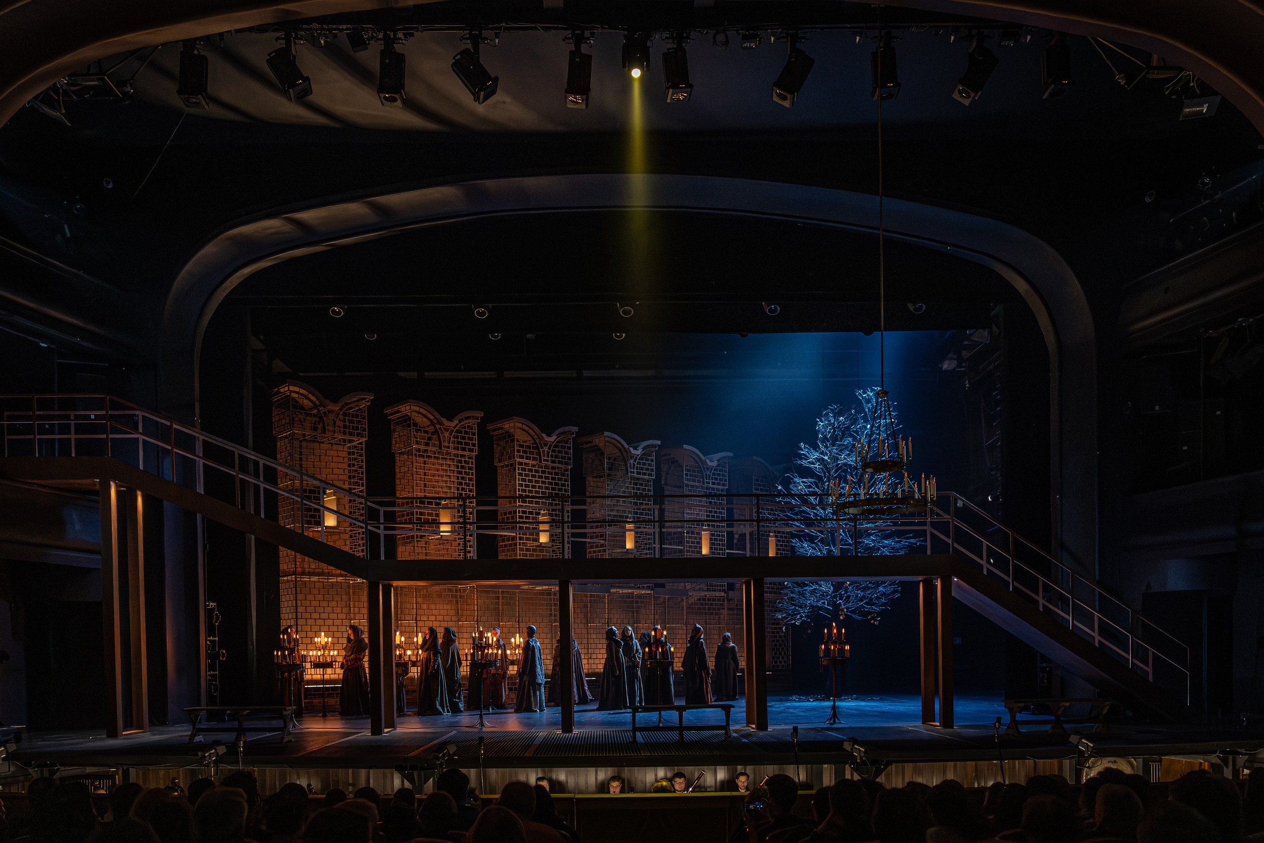 Его одели в крылатку из позапрошлого века, богемные шляпу и шарф, уместные и в наши дни, приклеили щегольскую бородку-эспаньолку и дали в руки керосиновую лампу. Найдутся в костюмной партитуре Марии Даниловой и другие фантазии (вроде высоких боярских шапок на подневольных опричниках), и другие белые вороны (типа охранников Грязного в кожаных полупальто и кубанках). Но облик Бомелия говорил громче всего: не стоит тебе, зритель, застревать в 1572 году, коим промаркировано действие оперы, наш труд — не исторический экскурс, зри шире. А шире — деревянный помост как второй уровень сцены, простой стол со скамьями да люстра-паникадило, какая пристала храму, но до жилых домов в XVI веке еще не добралась. Что хочешь, то и играй в этом маловыразительном, исторически индифферентном пространстве. Разве что белые зубцы Новодевичьего монастыря, в красном свете превращающиеся в кремлевские, — не пустой сценографический звук. В Кремле венчали на царство, в Новодевичий ссылали опальных цариц, и Марфе это предупреждение: жди венца, но как бы не стал он терновым. Большего по части подтекстов из декорации Зиновия Марголина (эффектность приобретшую только благодаря художнику по свету Александру Сиваеву) не вытянуть.