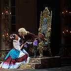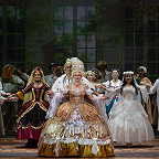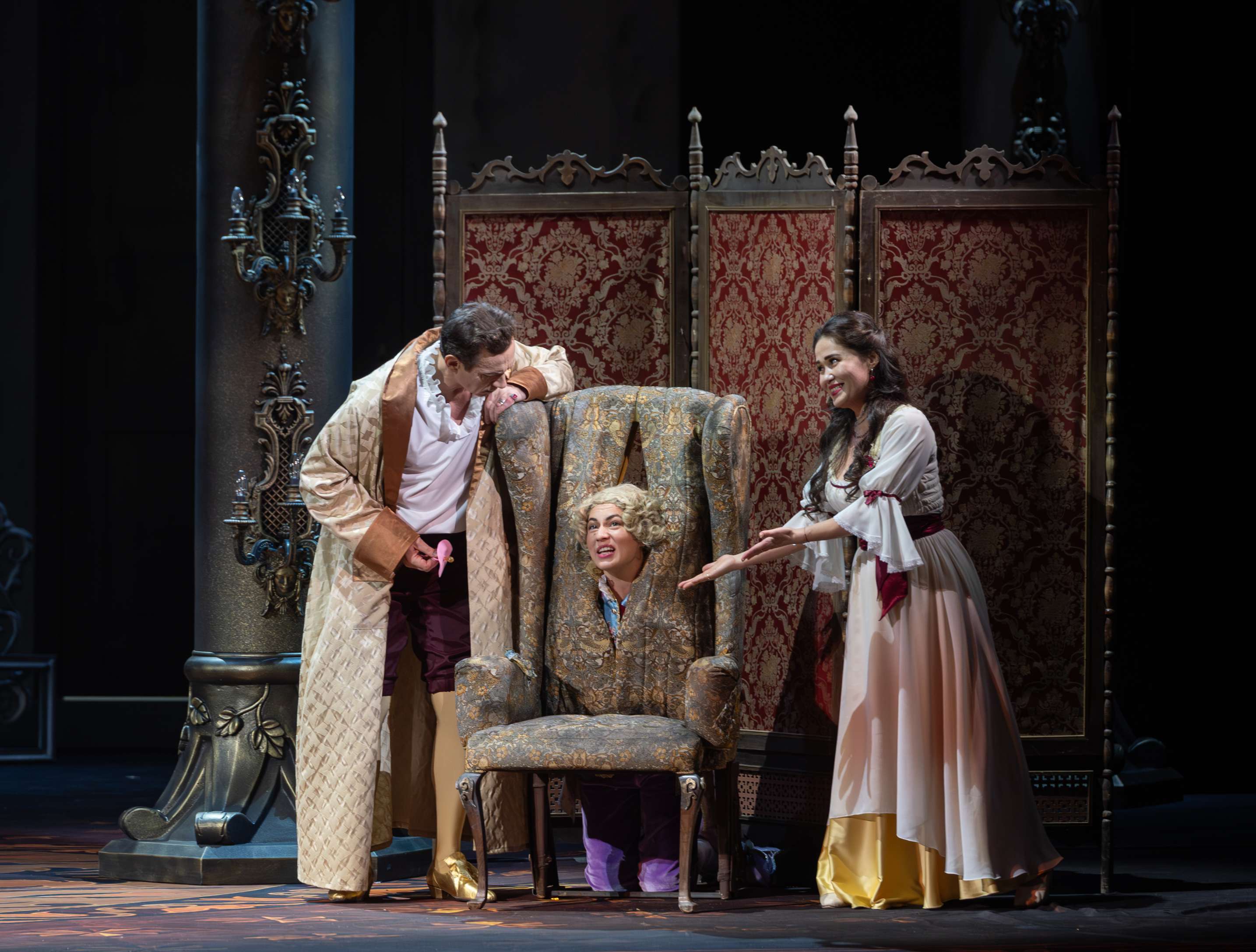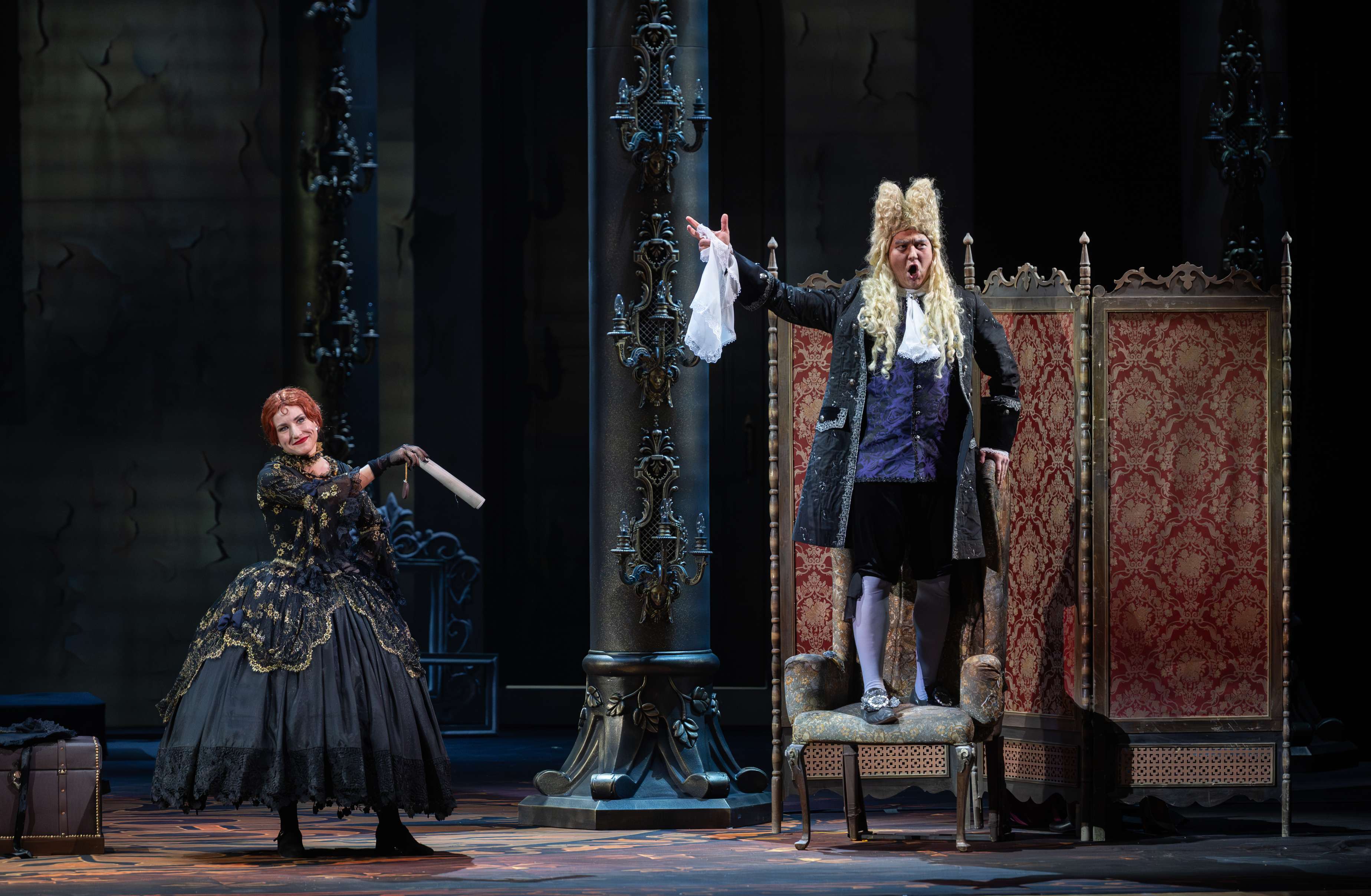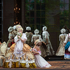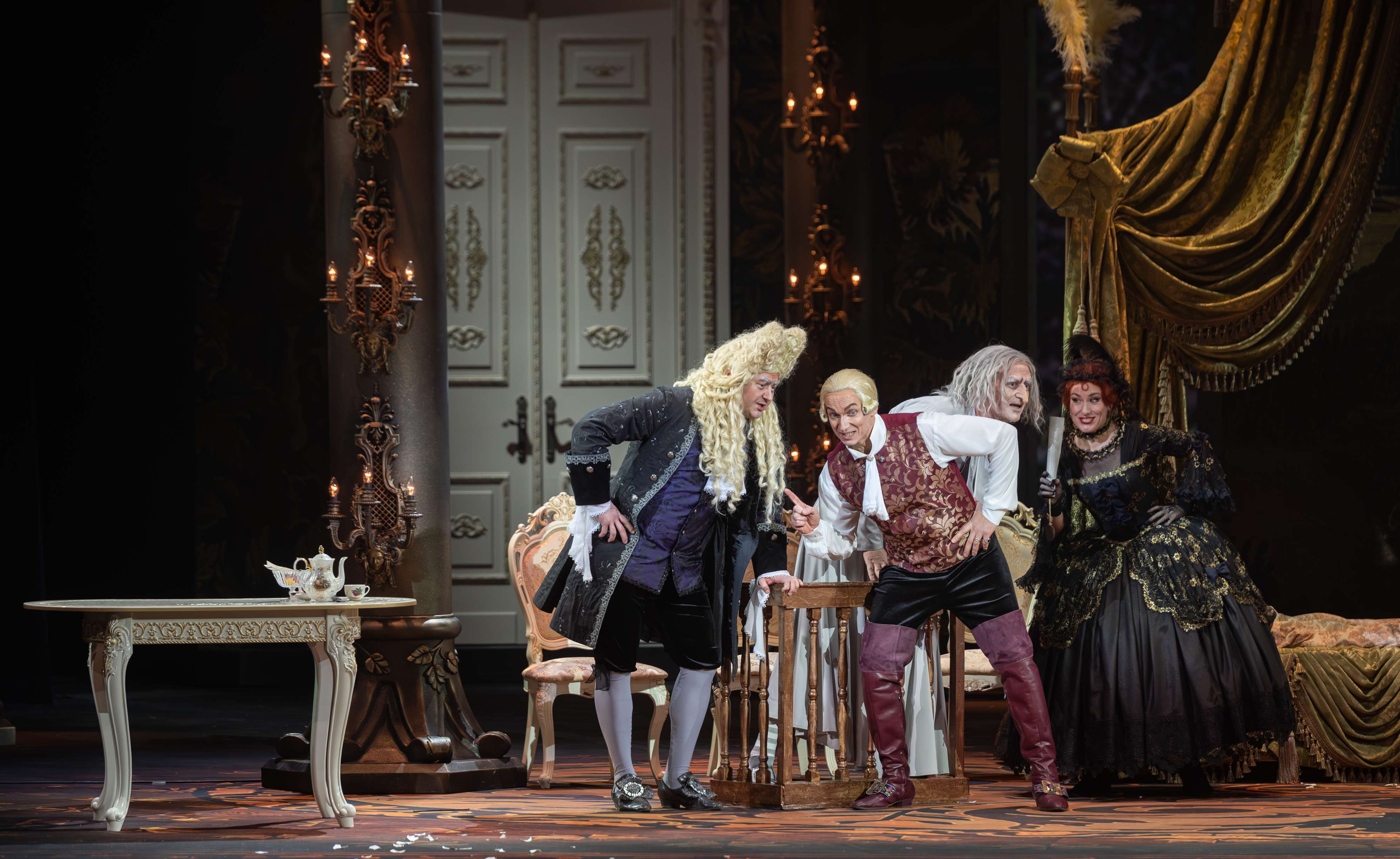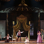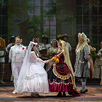 Режиссером выступил Юрий Александров, многажды ставивший Моцарта в разных местах и разной стилистике, в том числе и «Свадьбу Фигаро»: сегодня в Мариинском театре можно увидеть его классический вариант в оформлении сценографа Вячеслава Окунева, многолетнего творческого партнера Александрова. Вместе они сделали и спектакль для Казани, во многом другой, нежели петербургский. Витиеватая аркада и барочный альков над кроватью Графини — вроде похожи: присмотришься — нет, все иначе, с иными оттенками. Костюмы пышны и соответствуют нашим представлениям об эпохе рококо, в каких-то цветовая гамма перекликается с «мариинским прототипом», в иных совсем новая.