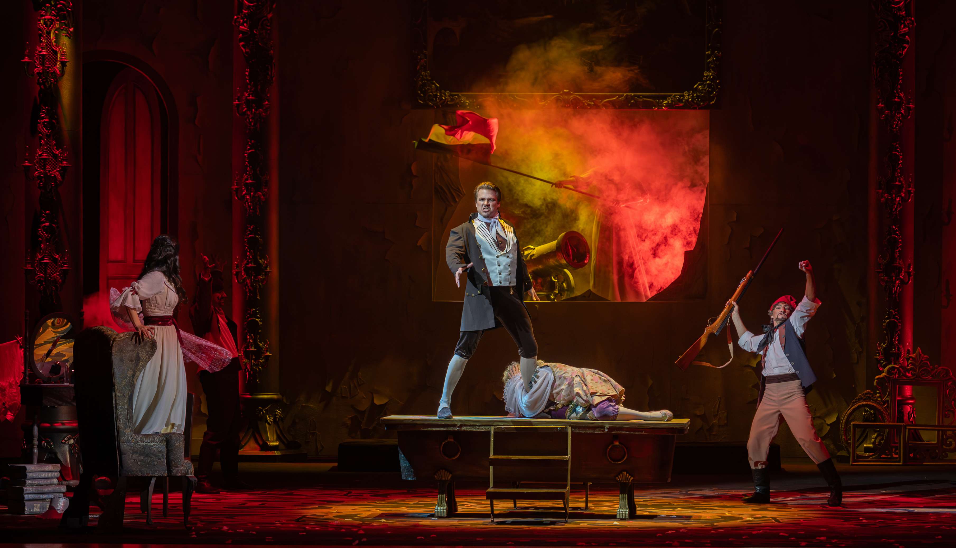 Главная суть этой работы, конечно, в подробной работе с артистами, в создании образов и в идеях, заложенных в опере и расшифрованных постановщиком. Так, первая картина, где Фигаро меряет метраж комнаты для установки кровати, происходит в несколько обшарпанном помещении с ванной в центре — видимо, патрон отвел чете новобрачных бывшее банное место замка (оставлять за скобками социальный исток комедии Бомарше Александров не намерен). Режиссер позволяет себе и другую вольность — переносит действие из Испании в предреволюционную Францию. Уже на увертюре по сцене бегают санкюлоты во фригийских колпаках и с революционными плюмажами (они и позже будут не раз мимически присутствовать, словно одергивая Графа и давая ему понять, что историческое время — не на его стороне), а в одной из хоровых сцен в открытом окне замка размахивают республиканским триколором.