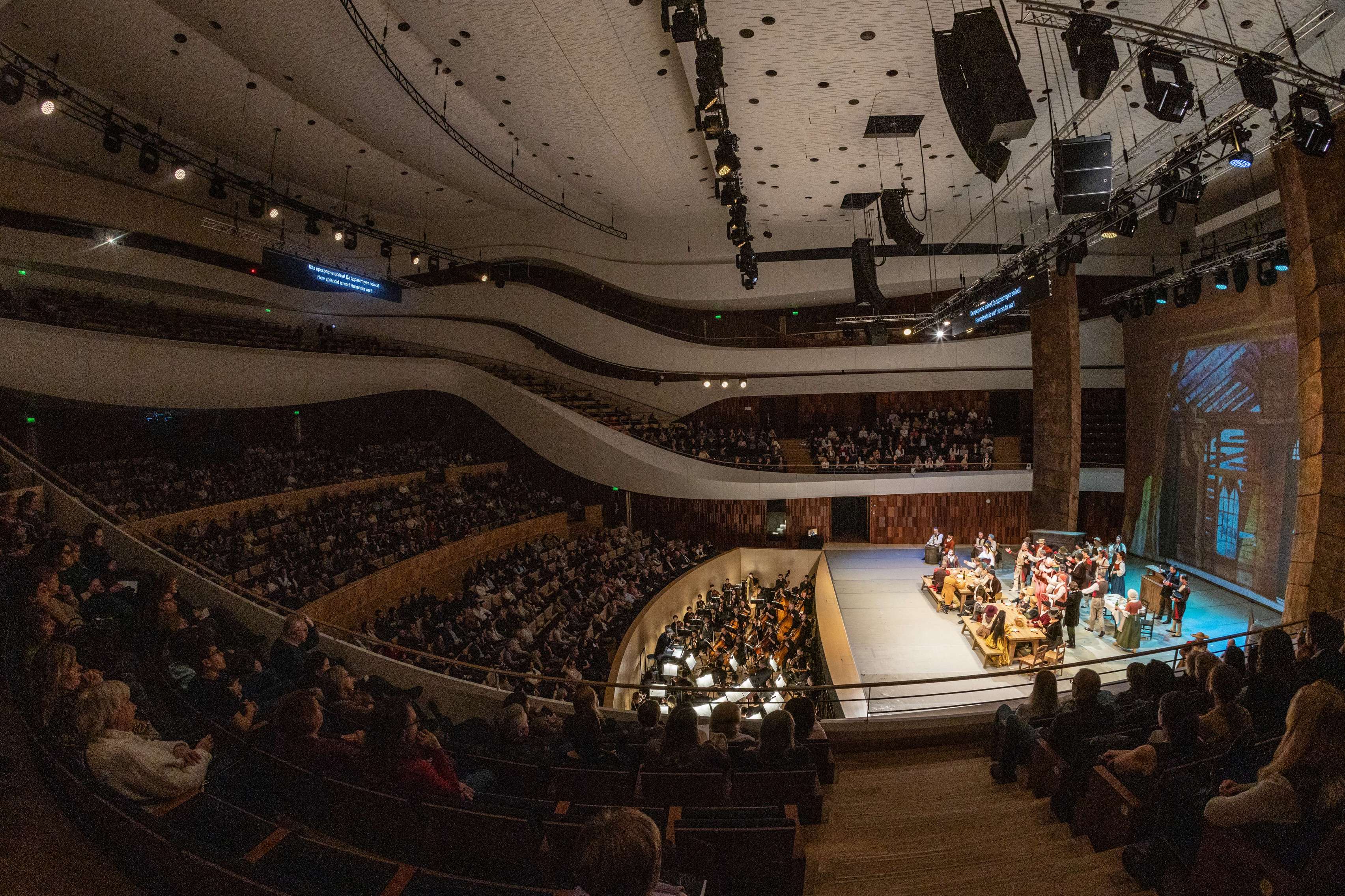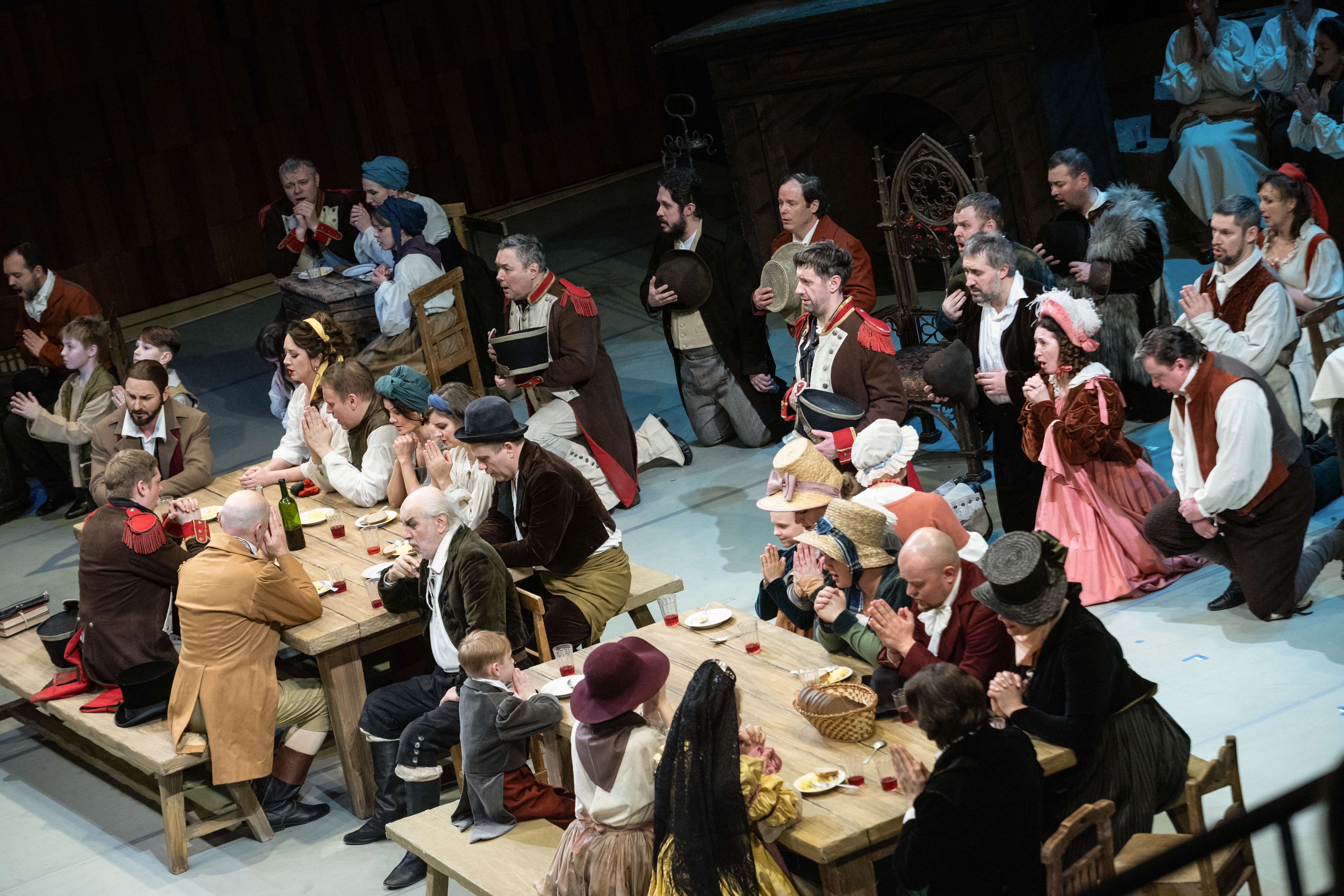 Показать роскошный и громоздкий спектакль в условиях «Зарядья» не представлялось возможным, поэтому Москве предложили адаптированный вариант (работа режиссера Анны Шишкиной и световика Александра Наумова): декораций и реквизита совсем немного, основной визуальный акцент приходился на видеозадники, воспроизводящие в том числе картинки Роллера, костюмы были полностью сохранены. При всех издержках прокатной площадки это все же был полноценный спектакль – со всеми мизансценами и народно-хоровыми эпизодами.
