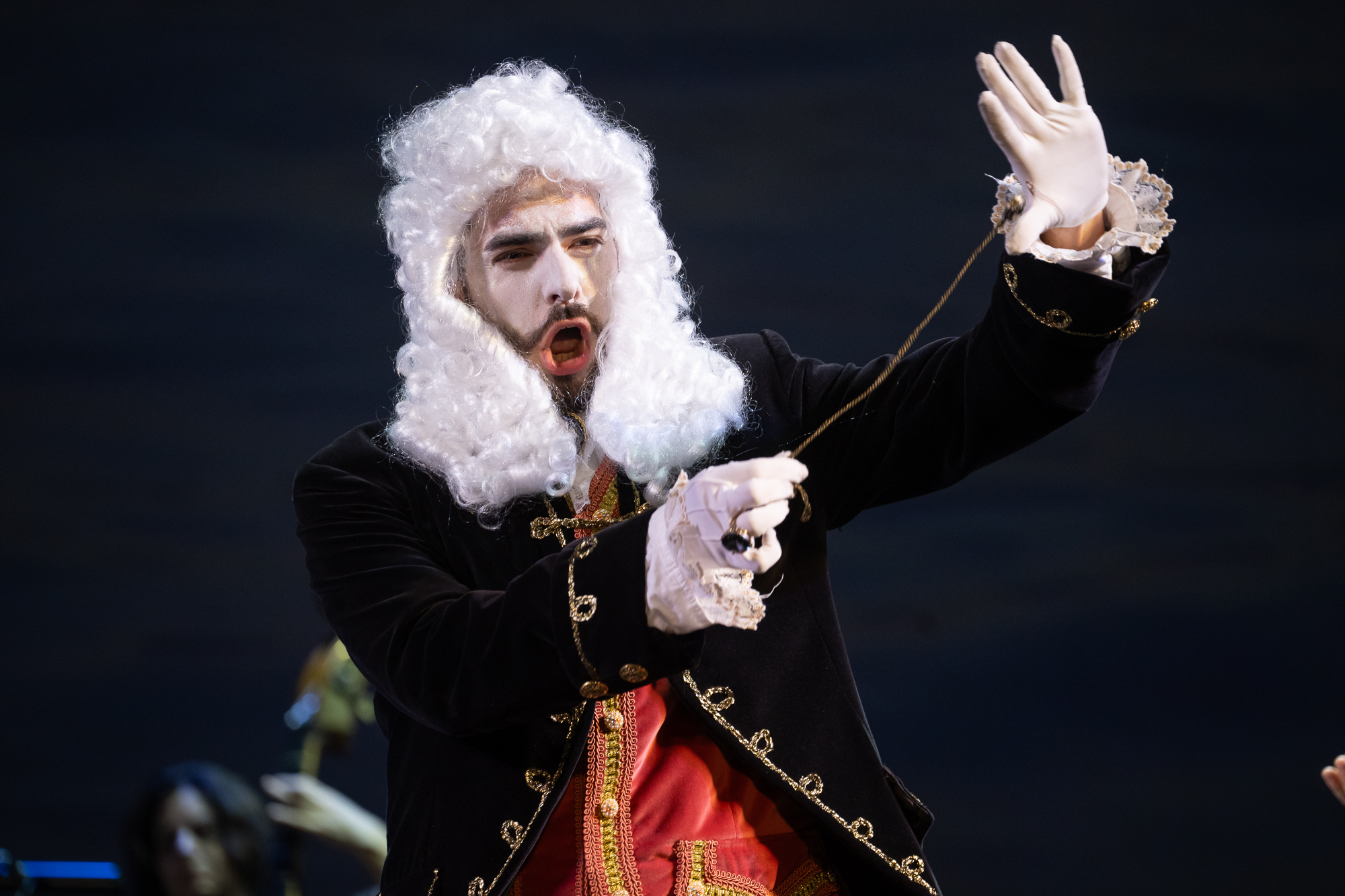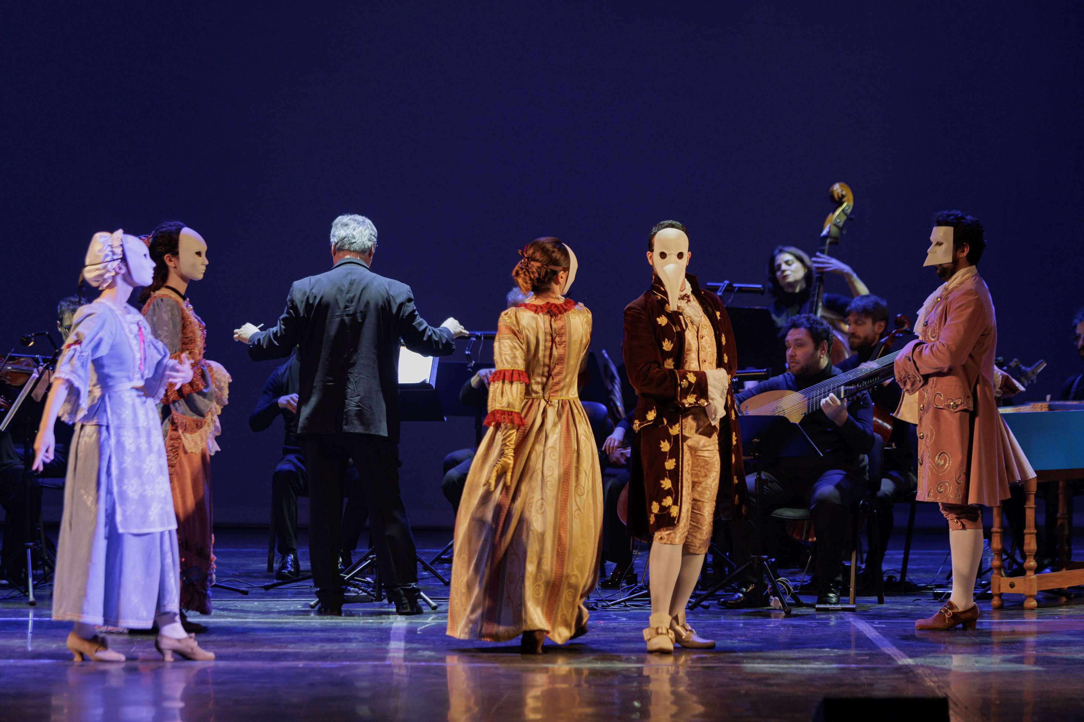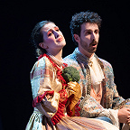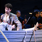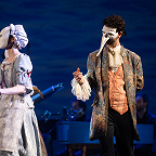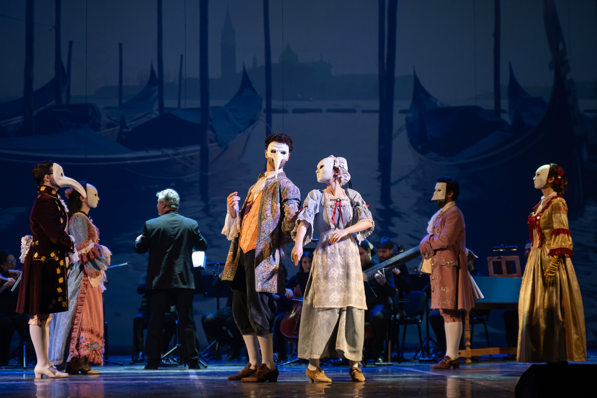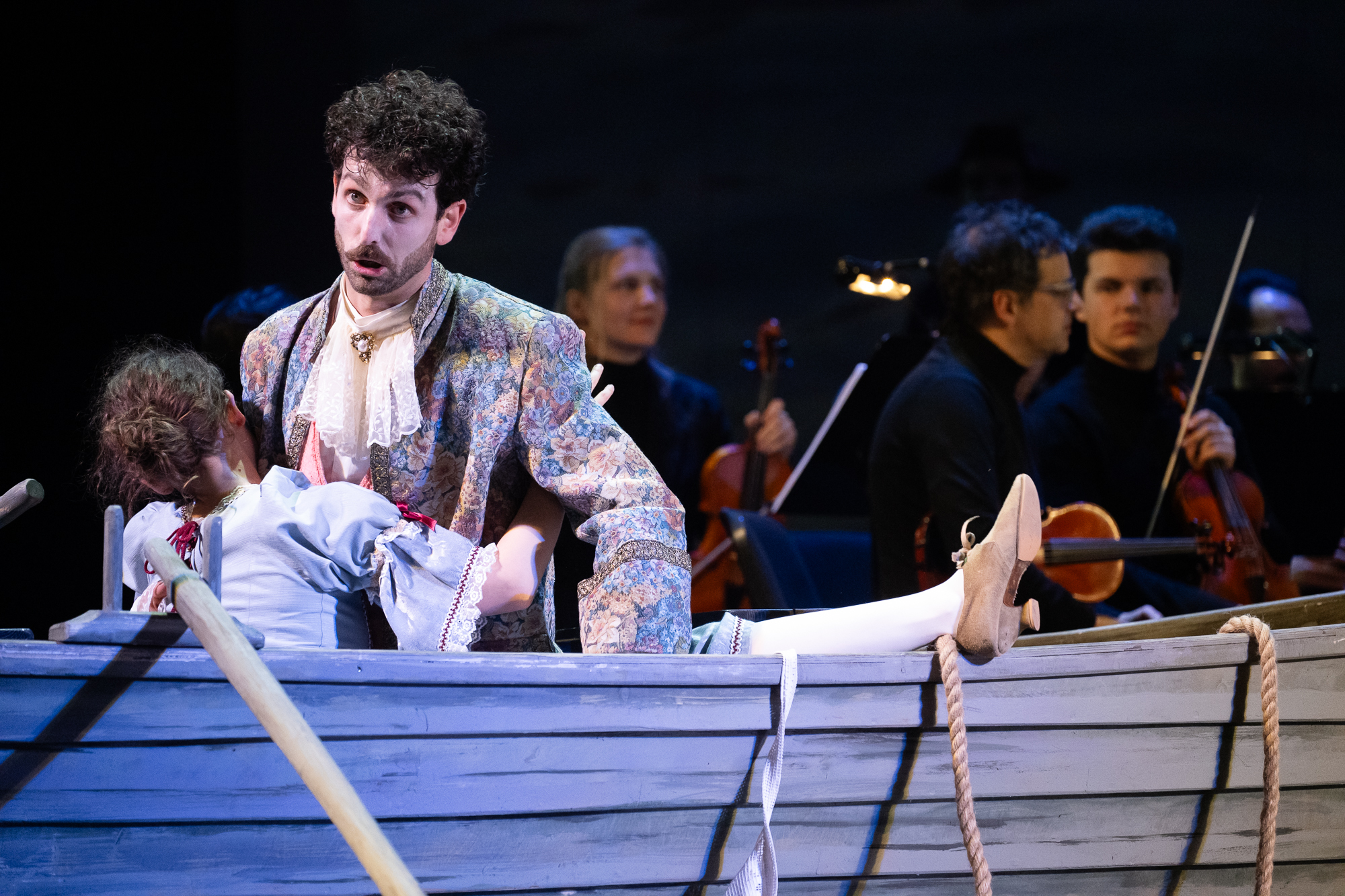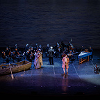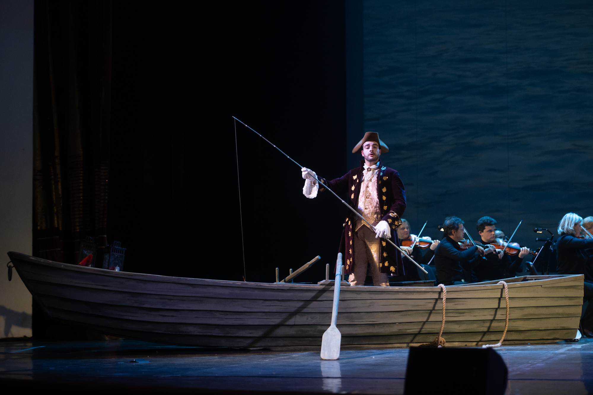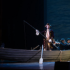 Сценическое оформление постановки скромно. На заднике сцены почти все время господствовало видео венецианской лагуны – действие оперы разворачивалось на благословенных берегах Адриатики. На авансцене слева – лодка в натуральную величину: в ней не раз будут барахтаться парочки героев, порой в весьма провокативных позах. Справа – пара стульев, с помощью которых режиссер периодически изображает запряженный конями экипаж для путешествия Нардо с Леной. Почти все мизансцены разыгрывались на самом переднем крае сцены, в непосредственной близости от зрителя, основную же часть пространства занимал оркестр, все время оказывавшийся за спиной у артистов, что иногда мешало точности и синхронности исполнения. Некоторые расхождения наблюдались не раз, правда, маэстро Энрико Казацца весьма оперативно их «разруливал», и непосвященным не было заметно ничего криминального.