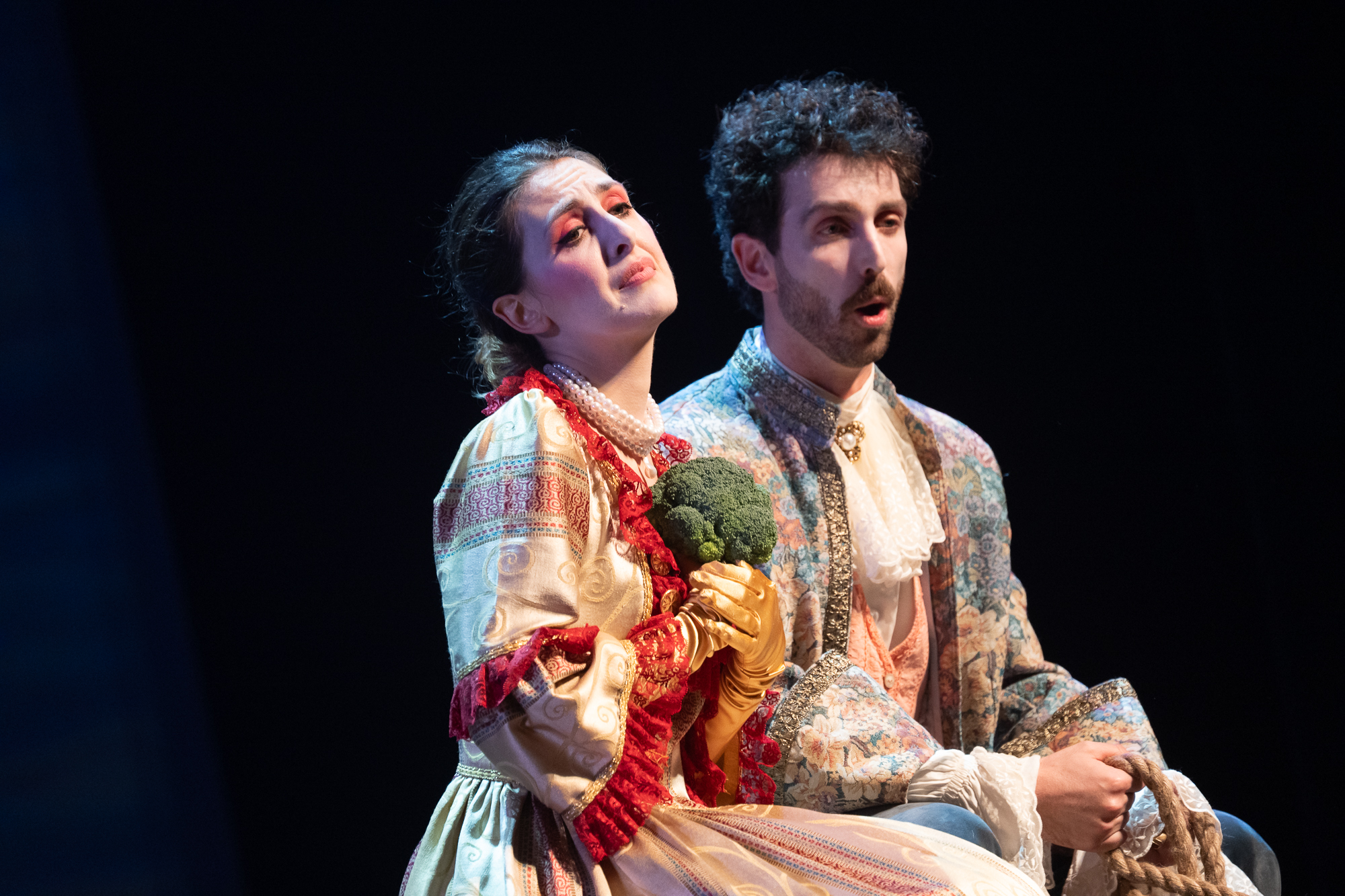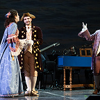 Режиссер Стефания Бонфаделли (сама в прошлом известная певица: Москва ее помнит по «Травиате» Франко Дзеффирелли 2003 года, показанной Театром Верди из Буссето в Большом) не придумывала никаких «концепций», а добросовестно разыграла с артистами комедию дель арте. Три пары персонажей шутят и лукавят, интригуют и забавляются, периодически меняясь друг с другом ролями. Назидательный папаша Дон Тритемио (Пьерпаоло Мартелла) со своими «непоколебимыми» принципами; парочка молодых влюбленных сластолюбцев (Евгения – Флориана Чичо и Ринальдо – Марсело Солис), вожделеющих друг друга, но лишенных возможности воссоединиться; хитроумная наперсница главной лирической героини Лесбина (Кристина Каролис), устраивающая личное счастье у нее за спиной; чудаковатый деревенский мыслитель Нардо (Франческо Босси), своими псевдоглубокомысленными сентенциями веселящий всех вокруг; его не менее ловкая, чем Лесбина, племянница Лена (Мария Елена Пепи), охмуряющая в итоге папашу Тритемио, – который, как оказалось, «самых честных правил» только на первый, поверхностный взгляд: вот список героев. Итог взаимодействия этого секстета – бесконечная кутерьма, движуха: именно легкость ее воплощения, тотальная игривость – главное достоинство спектакля синьоры Стефании.