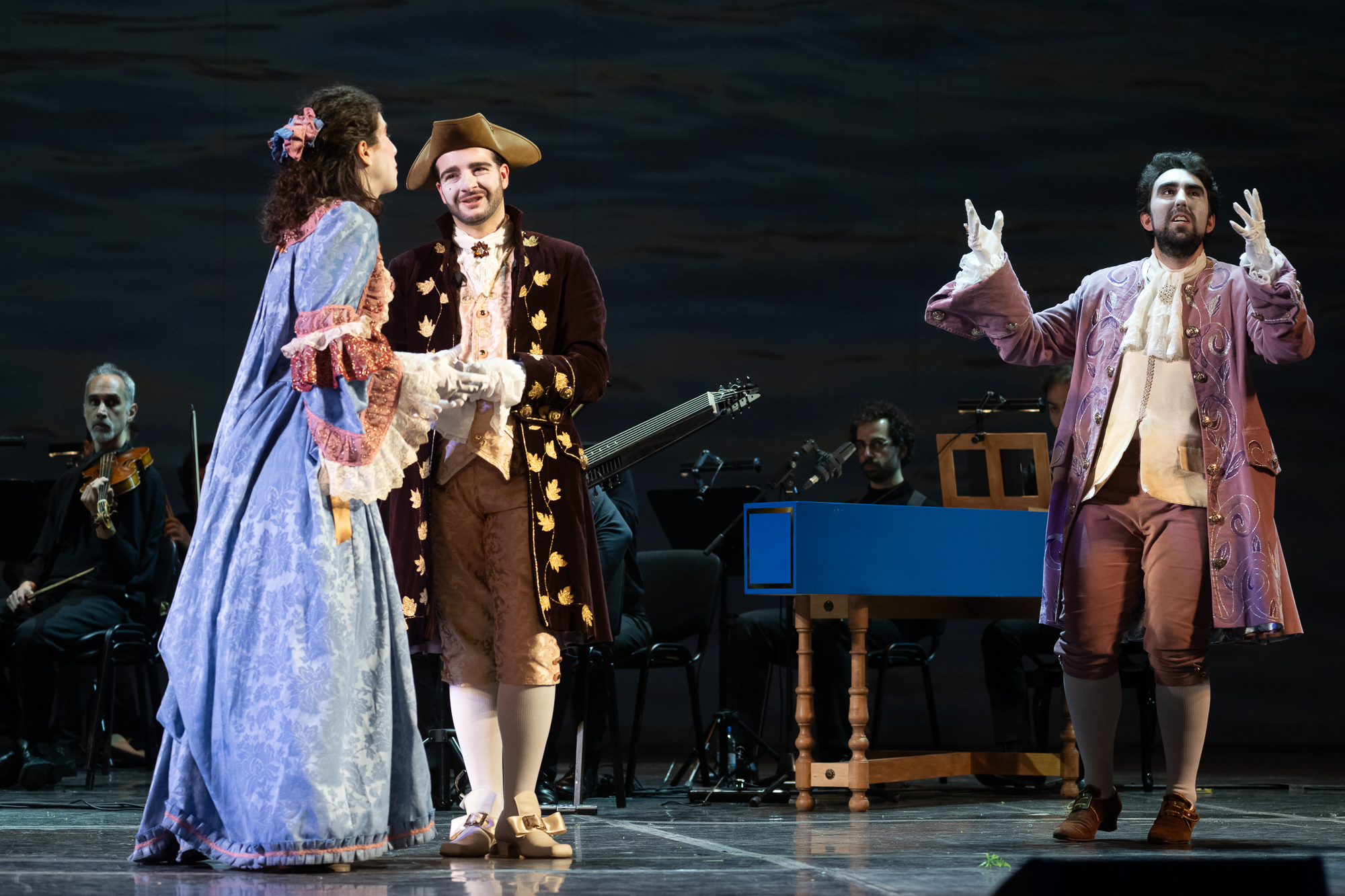 Исполнение оказалось очаровательным, полным шарма аутентизма: оперу разыгрывали музыканты и певцы, идеально владеющие итальянской барочной стилистикой. Аккомпанемент камерного оркестра был деликатен, но одновременно не лишен витальности, яркости – даже драйва и задорного куража. Солисты не демонстрировали некие невероятные голоса, но в «Деревенском философе» этого, наверное, и не нужно: сами же «инструменты» певцов весьма натренированны, гибки, в меру выразительны. Радовало то, что, в отличие от многих других проектов фестиваля в Сочи, исполнение было живым, без микрофонных «подпорок», и выяснилось, что акустика Зимнего театра вполне пригодна для естественной вокализации. Умелые голоса итальянских аутентистов производили особенное впечатление в сочетании с активной, предельно комедийной, порой утрированно гротескной актерской игрой.