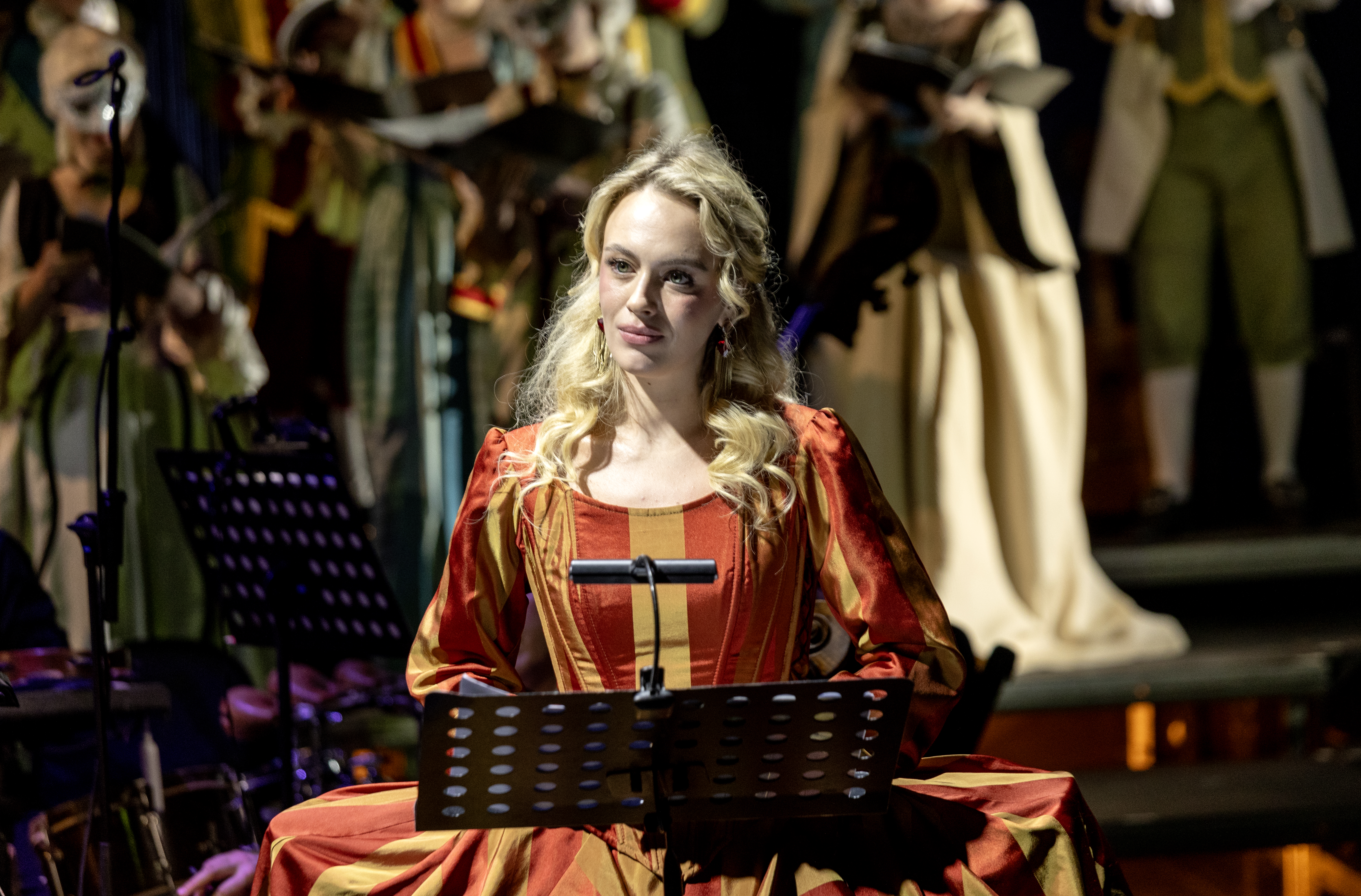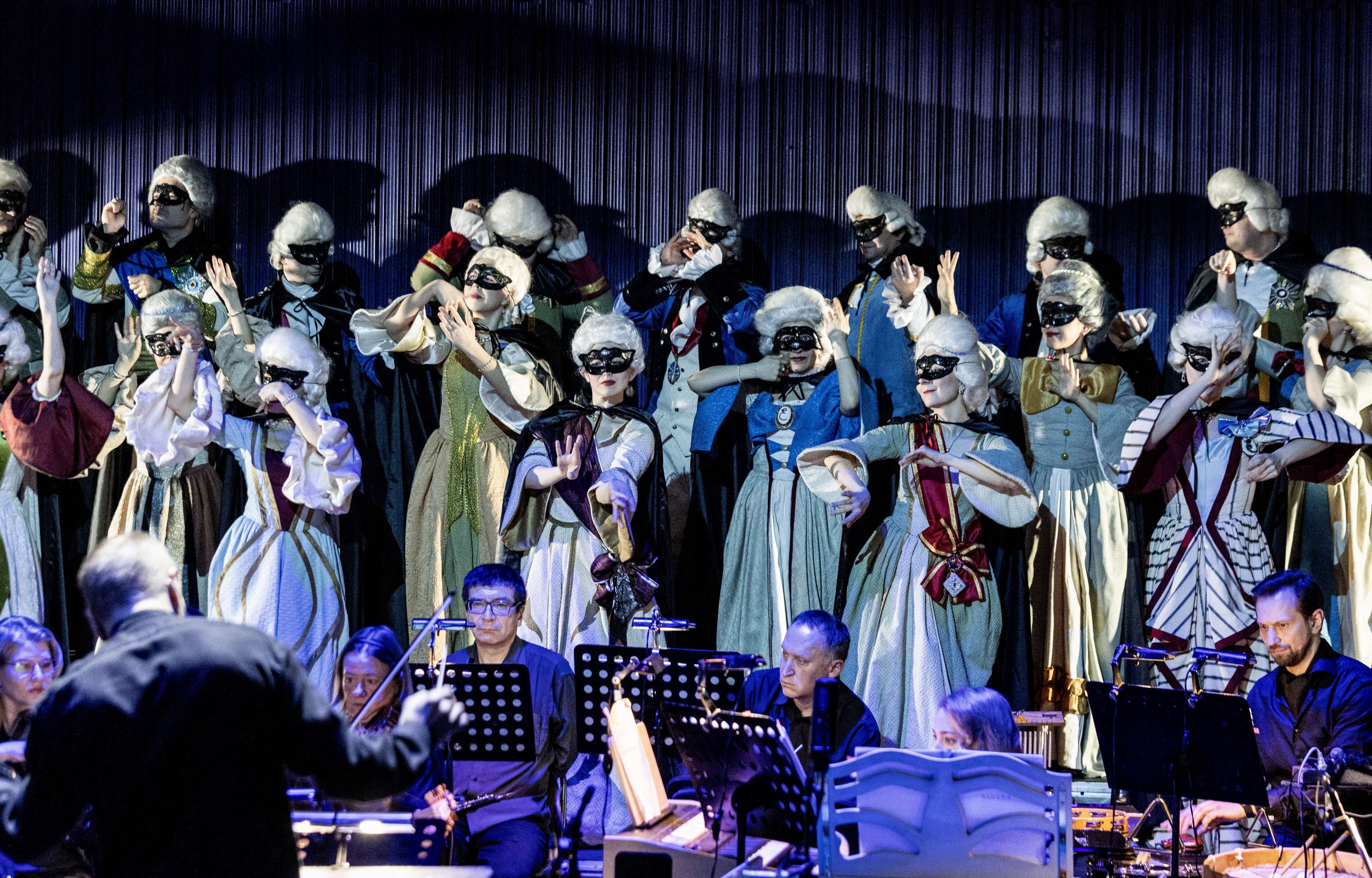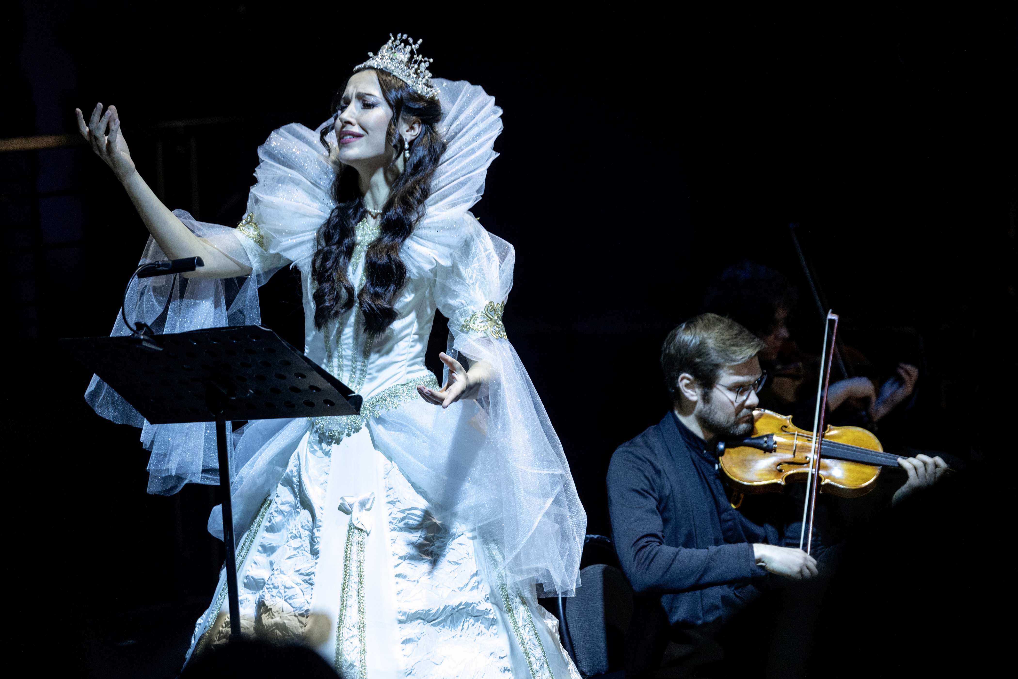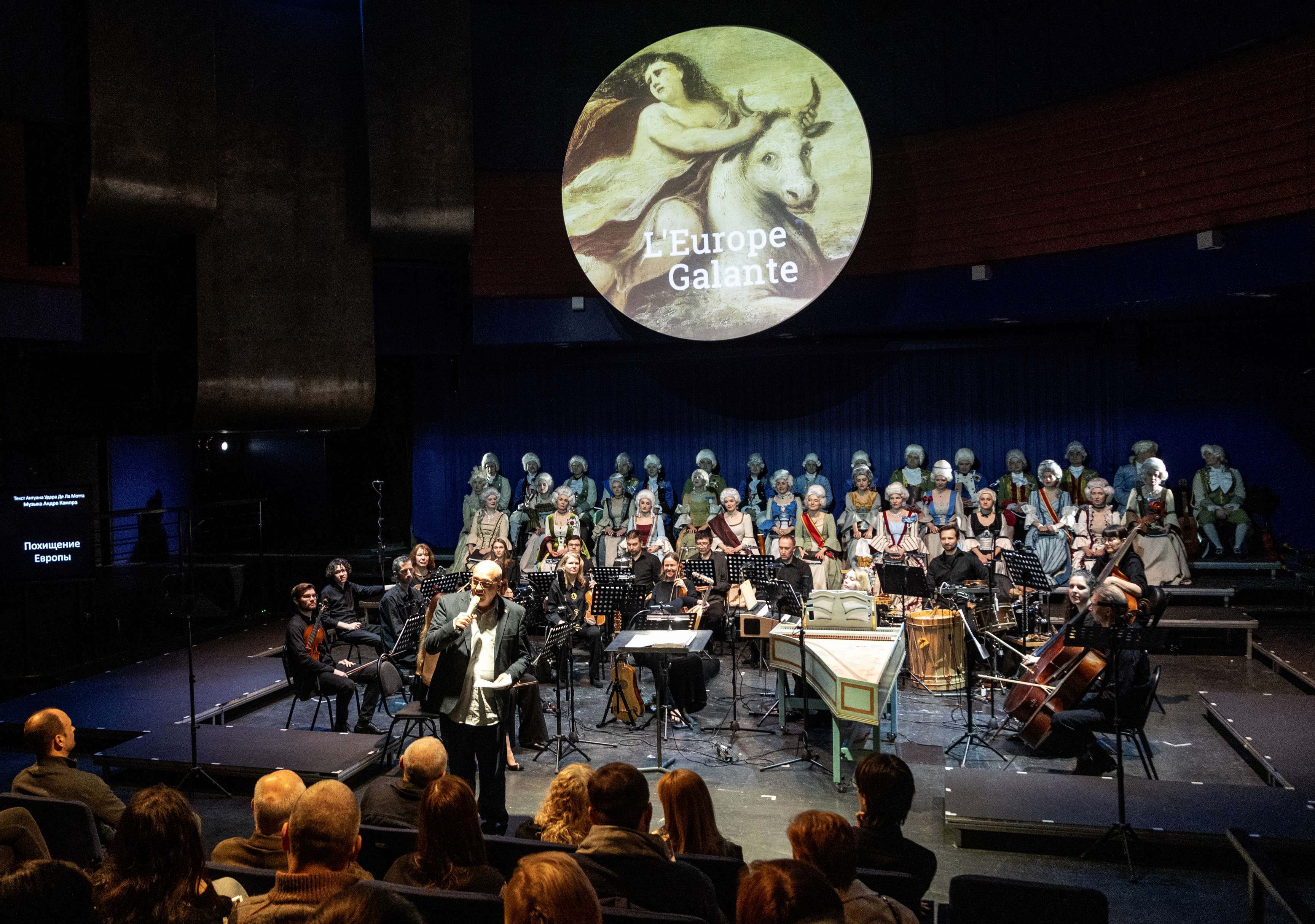 Сацевцы честно называют свою продукцию «спектаклем по мотивам оперы-балета», дав ей видоизмененное название: «Похищение Европы». Да и спектакль ли это в полном смысле слова? Балета нет вовсе, хотя музыка некоторых танцевальных дивертисментов и звучит, – остались лишь элементы пластики в торжественных проходах миманса. Сценографии, по сути, тоже нет – лишь видеопроекции, на которых публика лицезреет то величественные французские замки, то венецианскую лагуну, то полотна испанских живописцев. Есть роскошные костюмы, отсылающие к «галантному веку»: кринолины, парча, кружева, шелка, парики, камзолы, блеск страз. Правда, похоже, что они не вполне оригинальны, по крайней мере, костюм главной героини третьего фрагмента оперы, примадонны Олимпии, точь-в-точь как на главной героине в генделевской «Альцине» (та же золотистая чалма в жемчугах). Есть определенное мизансценирование, слегка оживляющее статику, но оно минимально, – в основном солисты стоят в линейку по обе стороны от дирижера (оркестр за ними) и исполняют свои партии по нотам с пюпитров. Соответственно, возможности сценической игры весьма ограничены.