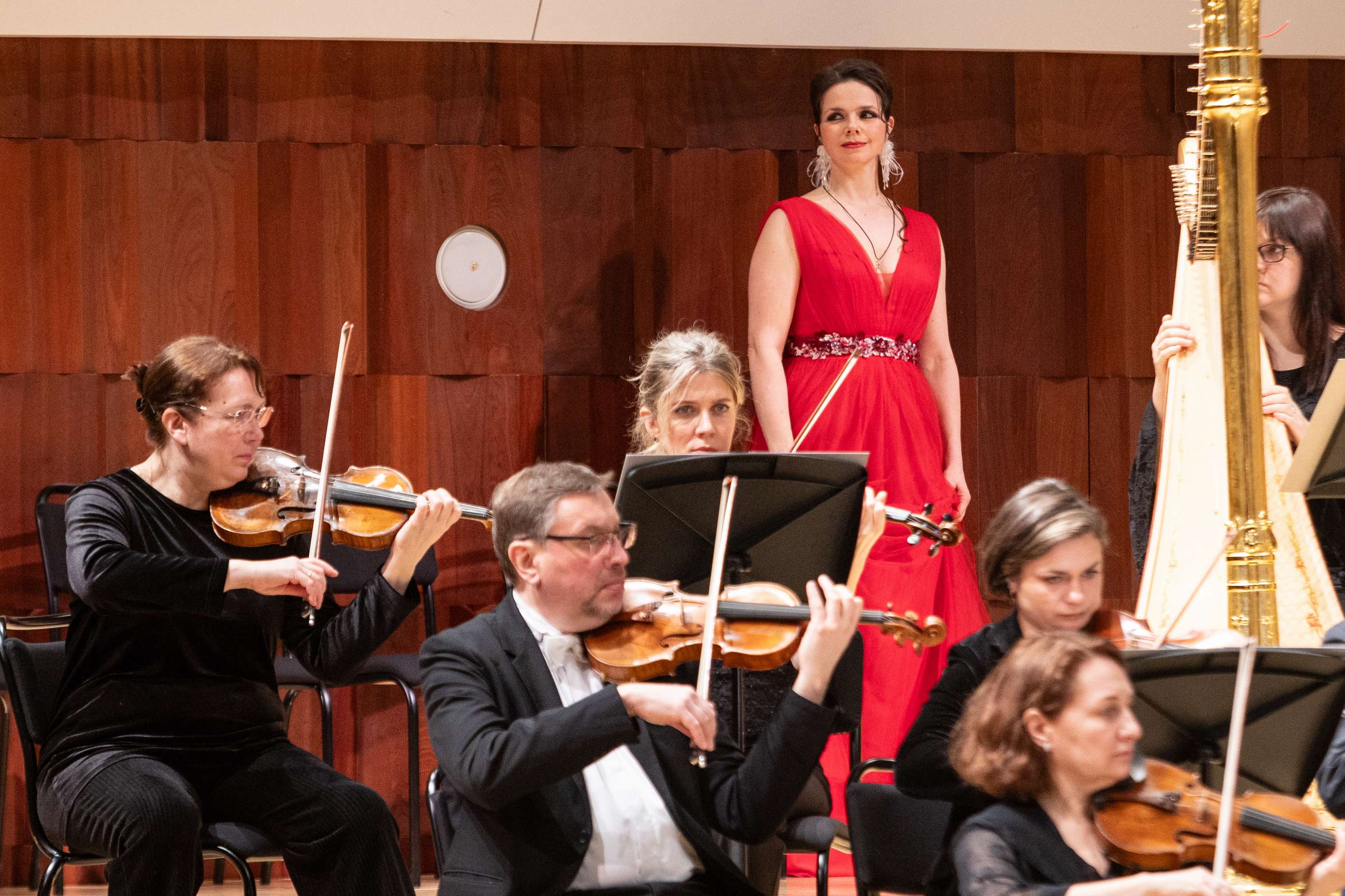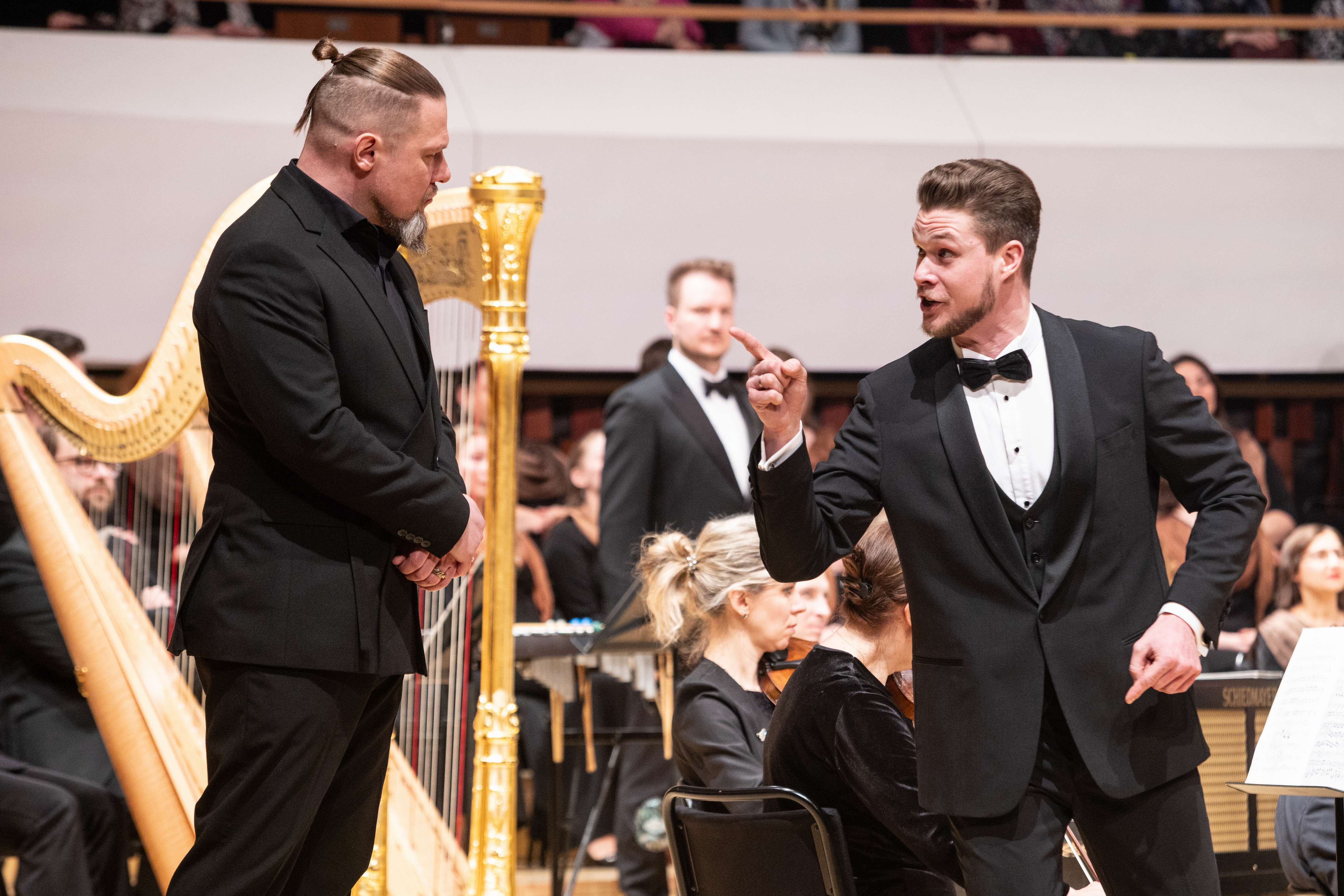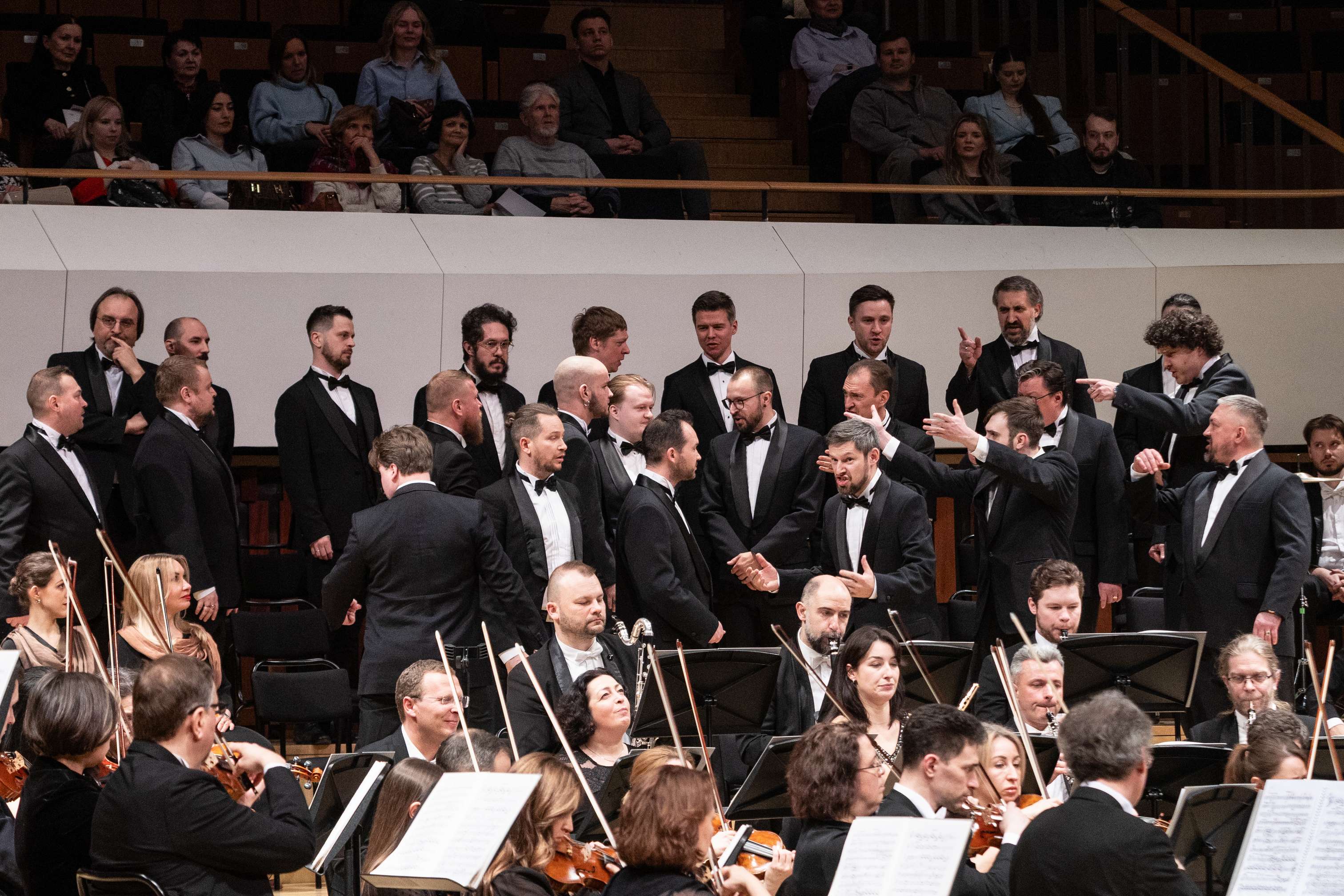 Да, не было костюмов и декораций, отсутствовали даже привычные по нынешним временам видеопроекции, тем не менее на сцене жил театр. Пусть его нужно было домысливать, но делать это было несложно благодаря яркому музыкальному воплощению. Солисты пели наизусть и играли на все сто, взяв мизансцены из сценических воплощений и изрядно добавив куража. Амелфа без конца грозила пальчиком Петушку за то, что он будит царя своими кукареку, братья-царевичи практически подрались на авансцене, царь Додон всамделишно плясал, выдавая веселящие зал коленца, а Звездочет так заинтересовался красотою Шемаханки, что демонстративно смотрел на нее сквозь царя как сквозь пустое место.