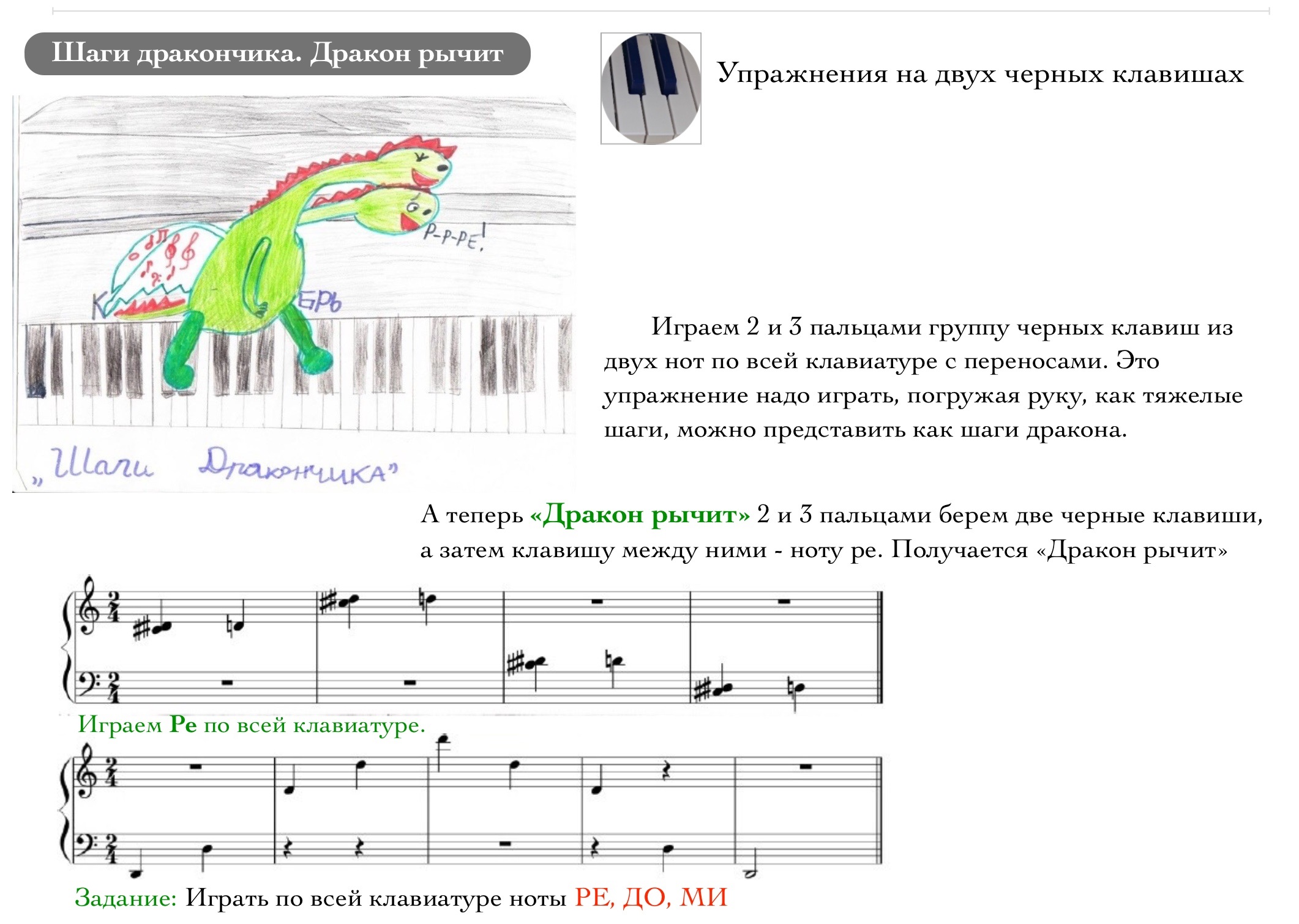 Упражнение «Цепкие пальчики» со стихами про кошачьи коготочки помогает сформировать цепкие кончики пальцев и крупные пианистические движения. А «шаги Дракончика» на двух чёрных клавишах не только развивают координацию, но и дают первое представление о весовой игре.