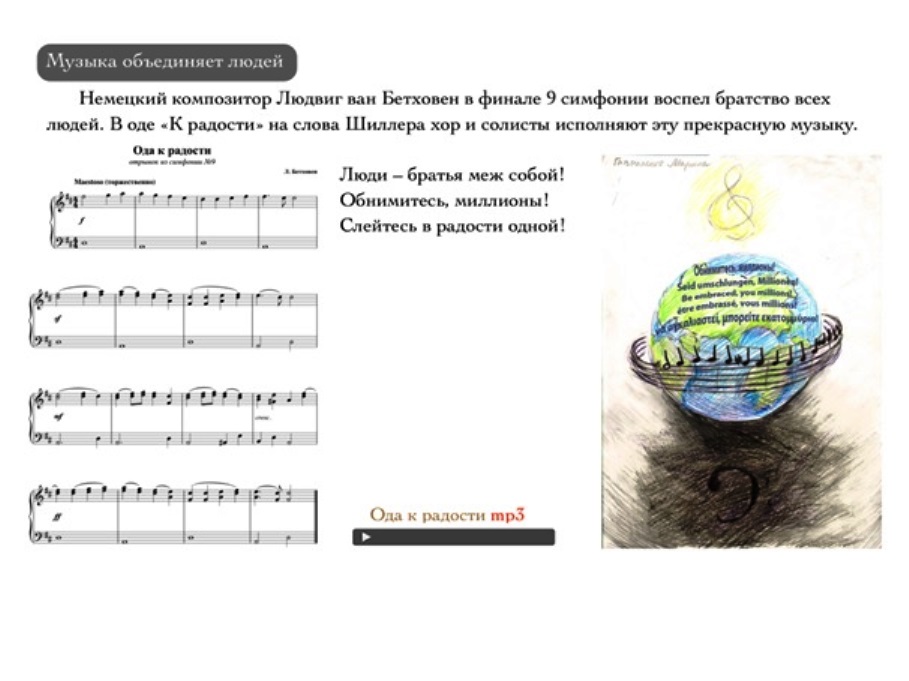 Визуализация образов помогает чувствовать и понимать классическую музыку. Темы симфоний Бетховена и Моцарта, русские народные песни, рождественские песнопения, кант «Как на матушке на Неве-реке, ирландская народная песня «Строим паруса», музыка из балетов П.И. Чайковского, Колыбельная И. Брамса, вступление к опере «Хованщина» М. Мусоргского «Рассвет на Москве» — эти и многие другие произведения звучат на уроках, сопровождаясь рисунками детей.
