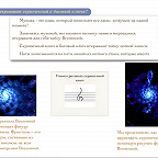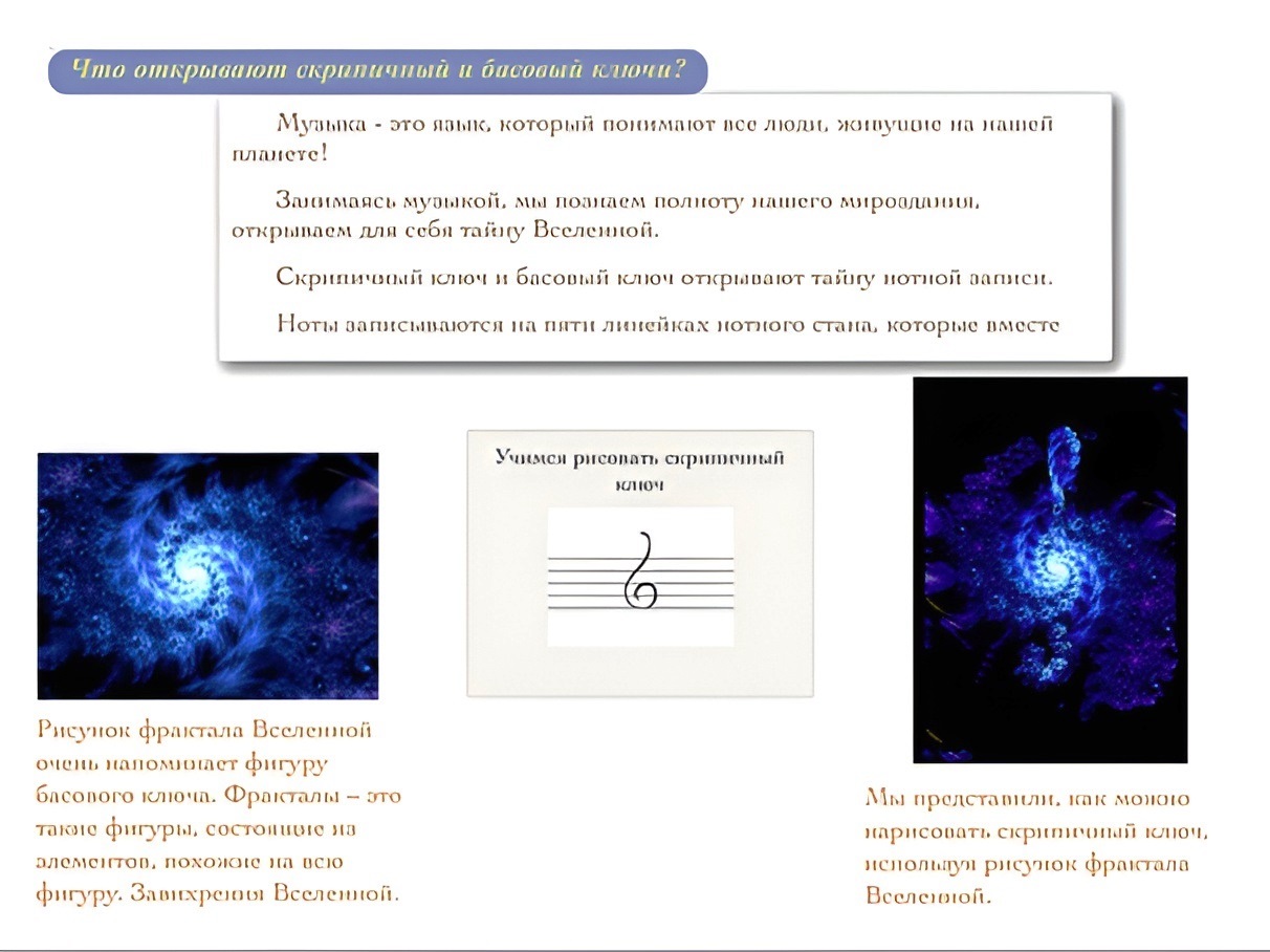 Материал объединяет музыку и космологию, демонстрируя связь между нотной грамотой и структурой Вселенной, что способствует развитию образного мышления и междисциплинарных связей. Основная цель – показать, что абстрактные музыкальные символы (ключи, ноты) имеют визуальное и концептуальное сходство с природными фракталами (например, завихрениями галактик). Так, фотография галактики визуально иллюстрирует «фрактал Вселенной» – спиральная структура напоминает завиток скрипичного ключа.