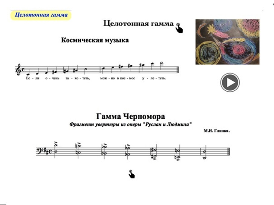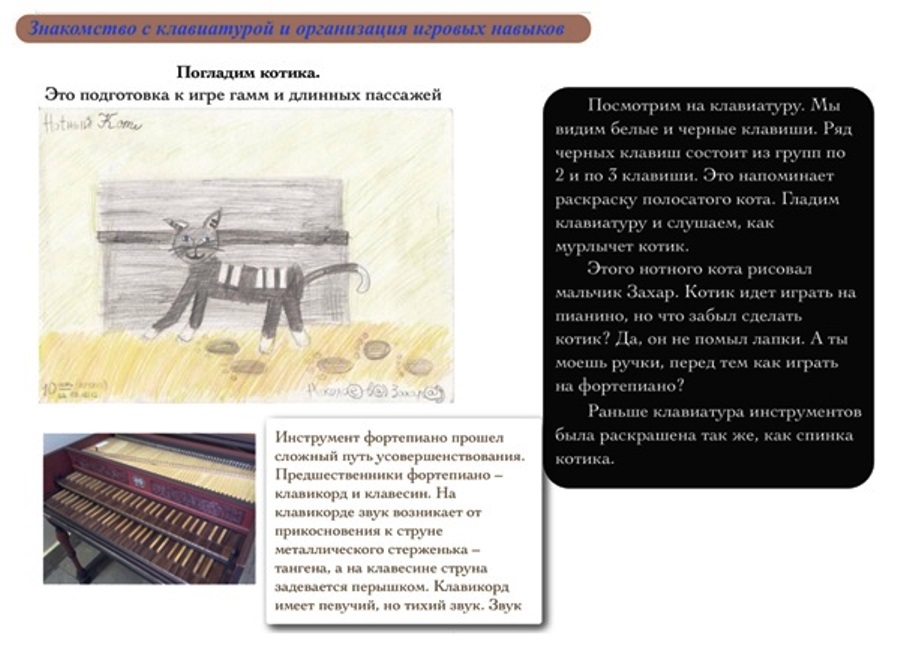 Важно, что с первых уроков ребёнок не просто повторяет заданное, а творит: импровизирует на трёх чёрных клавишах («Катание на облачке», «Кулачок-снежинка», колыбельная). На ракете – целотонной гамме – улетает в Космос, где в невесомости импровизирует космическую музыку. Один из приёмов – использование музыкального алфавита, который поют и одновременно играют на фортепиано, начиная с четвёртого пальца. Это способствует правильной организации руки с самых первых шагов.