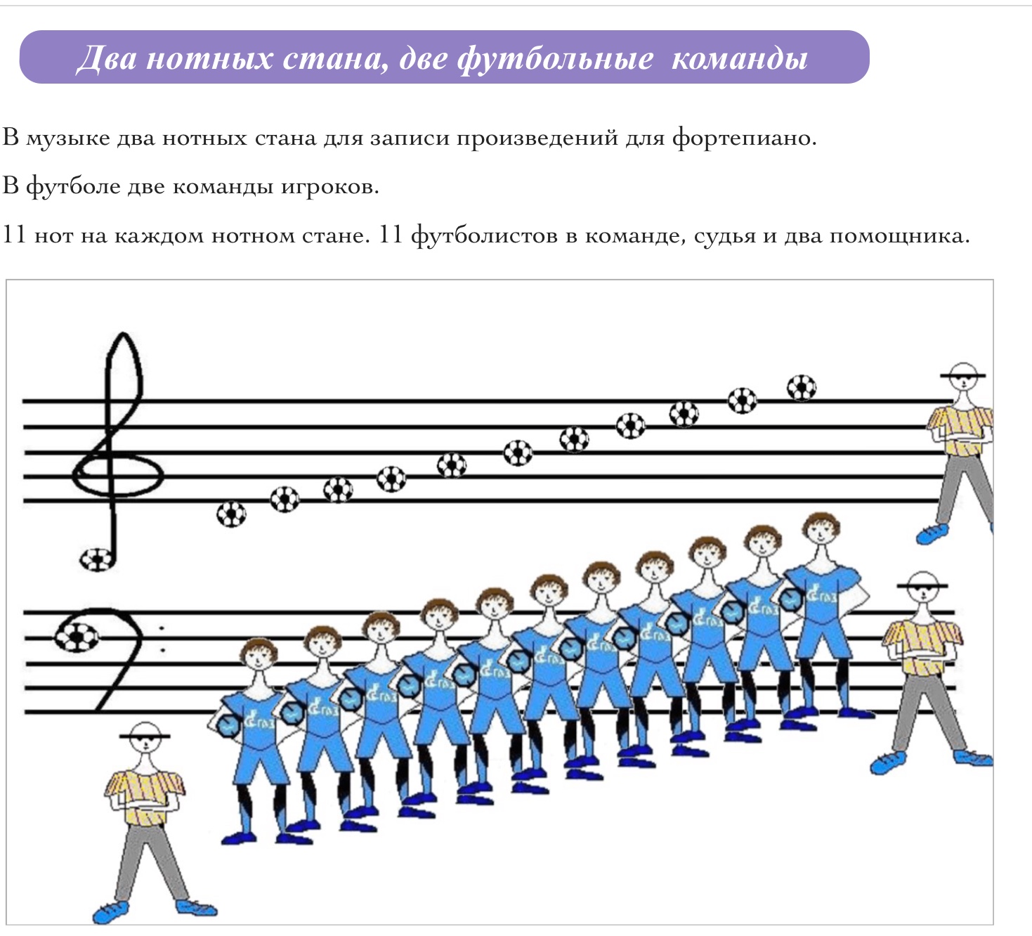 Показательно, что даже знакомство с клавиатурой и нотной грамотой по методике Ольги Сотниковой превращается в увлекательное занятие – открытие непредсказуемых и, зачастую, парадоксальных способов устройства мира. Автор использует яркие, понятные ребёнку образы. Например, футбол и нотный стан. Два нотных стана (скрипичный и басовый) сравниваются с двумя футбольными командами на поле. 22 ноты – как 22 игрока: каждая нота, как игрок на поле имеет свою «позицию».
