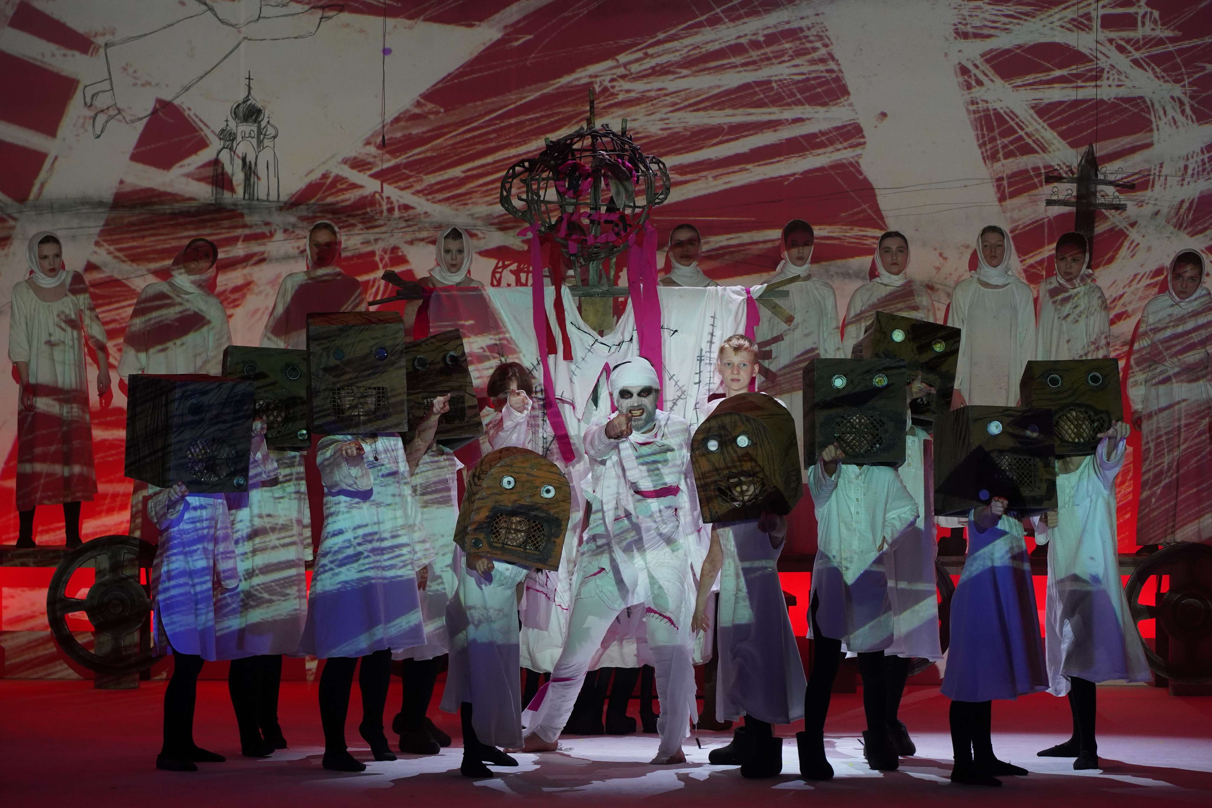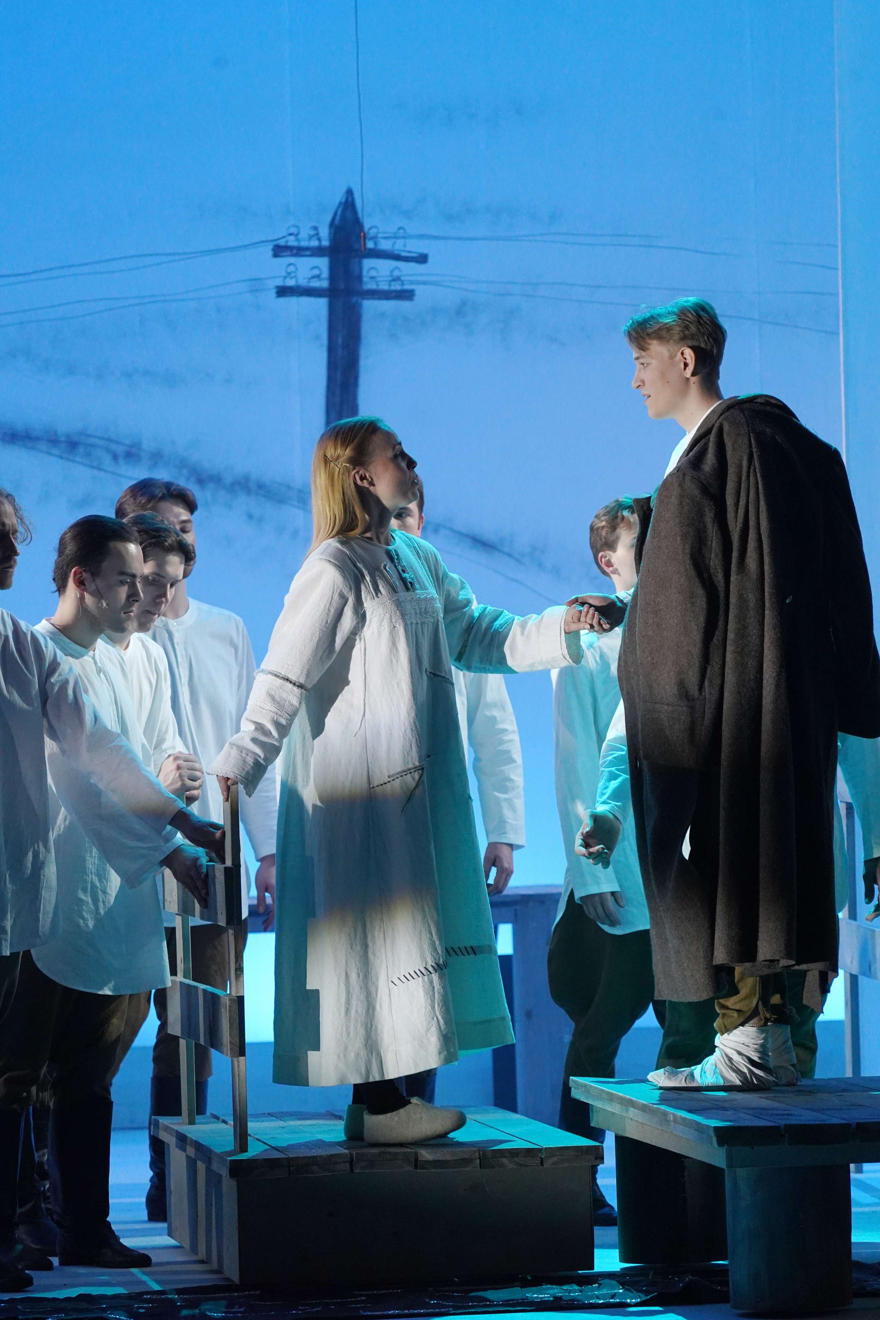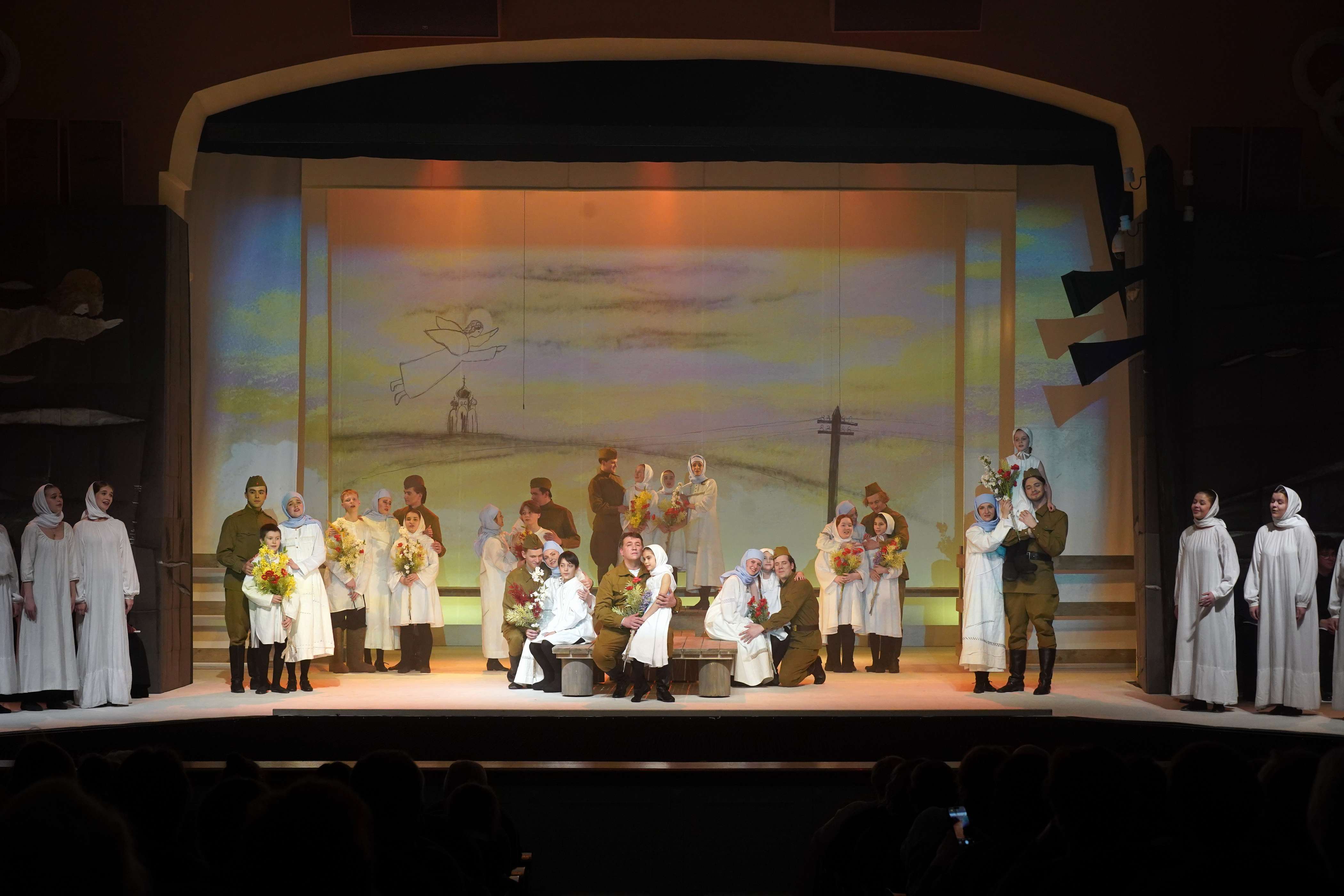 Песни в спектакле связывались одна с другой, подобно орнаменту на вышиванке или клеймам истории святых на иконе, рассказывая историю убитых надежд, разорванных любовей, превращения в ангелов, подготовке к встречам на небесах. Основанная на контрастных сопоставлениях тишины тыла, памяти мирной жизни и хаоса, кровавого абсурда и грохота фронта драматургия спектакля рождала полотно, в котором милые реальные сценки ритуалов, поданные, словно в дымке воспоминаний, обретали резонансы мистерии, страстей, соединяющих временное с вечным. С виду забавная «Дразнилка» с текстом «Ой ты, лихо-лиходей, лиходей, лиходей, не бросайся на людей» превратилась здесь в эпизод современного хоррора, где вместо голов у дразнящих детей оказались картонные коробки с жутковатыми глазищами. Чуть позже эти монстрики в акапельной песне «Пошел солдат» под мерные, глухие удары барабана будут подходить к не успевшим пожить солдатикам, один за другим, как по списку подкашиваемым пулями. «И ничего солдат не видел, а только видел лишь одно: жены багряный полушалок, ее счастливое лицо». В «Скажи, скажи, голубчик, скажи, кудрявый чубчик» лучезарное соло Ольги Васильевой завораживает своей девичьей силой, ищущей потерянную любовь. «Кудрявый чубчик» просыпается где-то вдалеке, отвечая «Нигде я не живу и песен не пою, я все думаю, думу думаю, никак я не усну», к чему подключается девичий ансамбль. Песня «Милый мой дружок» с ее сладкой, безмятежной, полной покоя мелодией дуэта влюбленных, в упоении исполняемых Елизаветой Майдановой и Семеном Фаттыховым с идеально найденной интонацией союза двух сердец, прерывается грубым вторжением смерти и мертвой паузой. После нее не могло быть другого номера, как «Почтальонка», с пронзительным меццо-сопрано Анны Смирновой, а после – грандиозная «Молитва» с зачином в виде знаменного распева, звучащего с закрытым ртом, но с каждой строкой вырастающая в плач тысяч о невинно убиенных. Сергей Ваганов здесь продемонстрировал феноменальный спектр своих уникальных драматических возможностей, декламируя на фоне хора «Зачем печалишься, душа моя»: «Не соревнуйся с лукавым. Не завидуй творящим беззаконие, ибо лукавый будет истреблен и не будет грешника. Избави меня от творящих беззаконие и от мужа крови спаси меня, ибо уже уловили душу мою. Скор будь, о, Утешитель, всемилостивец, не медли». В этом хоре пели солисты театра разных положений – от первачей до ансамблистов, соборно молясь о спасении на земле, этот мир утратившей, и театральная сцена оказывалась посильнее самых крепких стен храма.