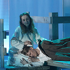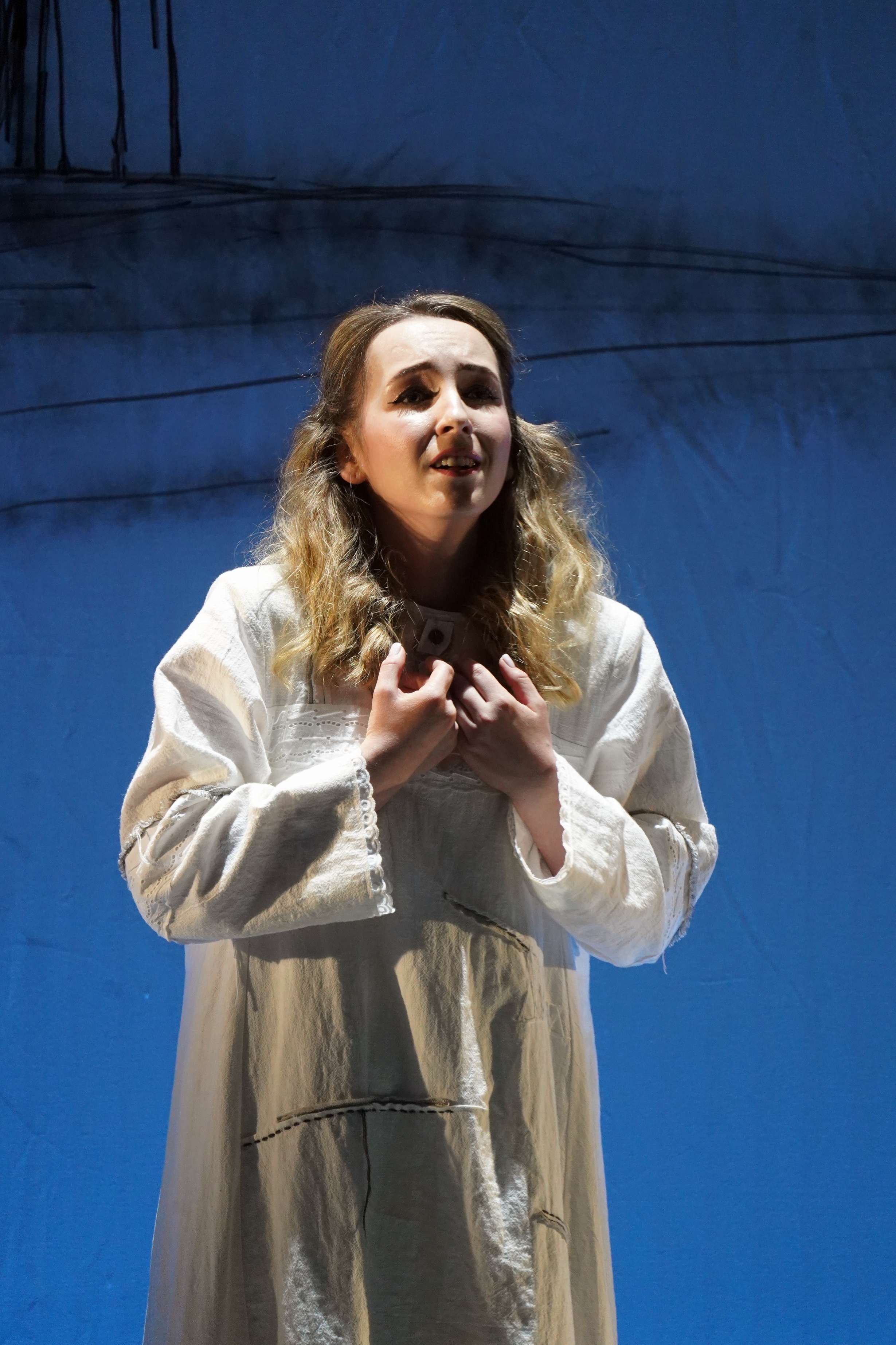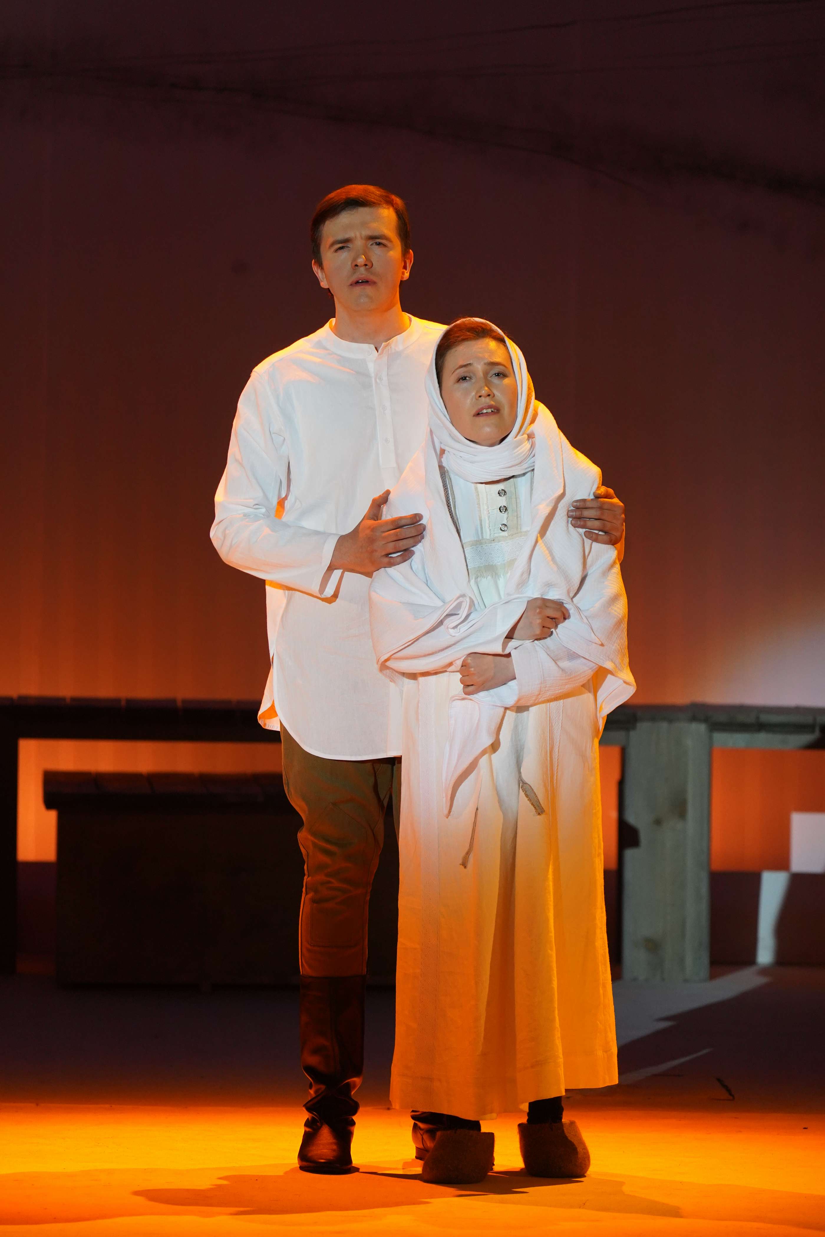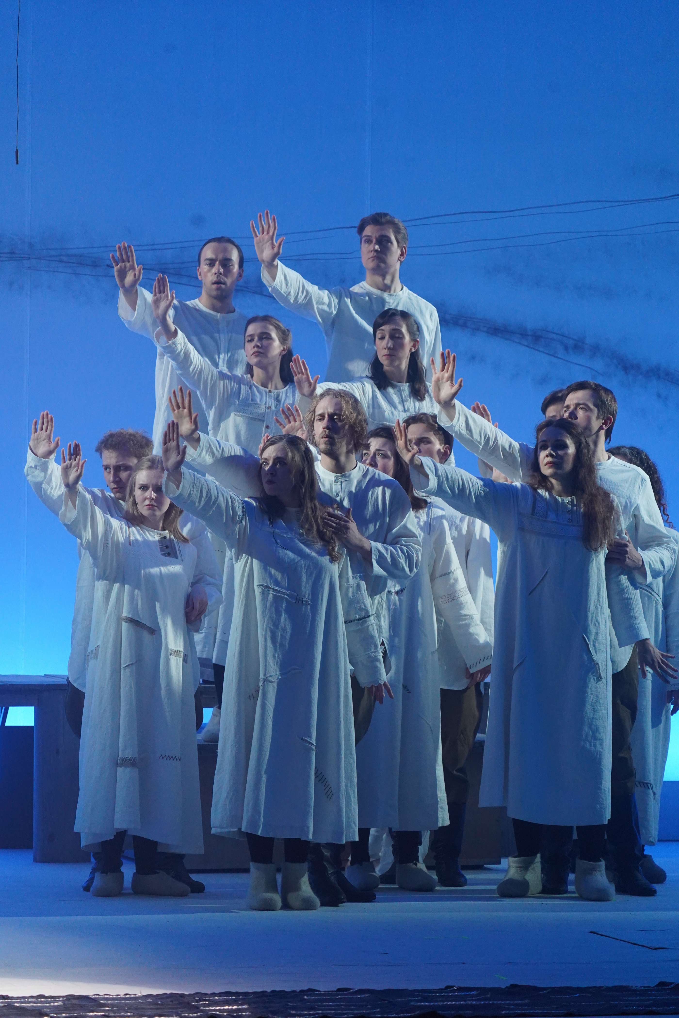 Песни в спектакле связывались одна с другой, подобно орнаменту на вышиванке или клеймам истории святых на иконе, рассказывая историю убитых надежд, разорванных любовей, превращения в ангелов, подготовке к встречам на небесах. Основанная на контрастных сопоставлениях тишины тыла, памяти мирной жизни и хаоса, кровавого абсурда и грохота фронта драматургия спектакля рождала полотно, в котором милые реальные сценки ритуалов, поданные, словно в дымке воспоминаний, обретали резонансы мистерии, страстей, соединяющих временное с вечным. С виду забавная «Дразнилка» с текстом «Ой ты, лихо-лиходей, лиходей, лиходей, не бросайся на людей» превратилась здесь в эпизод современного хоррора, где вместо голов у дразнящих детей оказались картонные коробки с жутковатыми глазищами. Чуть позже эти монстрики в акапельной песне «Пошел солдат» под мерные, глухие удары барабана будут подходить к не успевшим пожить солдатикам, один за другим, как по списку подкашиваемым пулями. «И ничего солдат не видел, а только видел лишь одно: жены багряный полушалок, ее счастливое лицо». В «Скажи, скажи, голубчик, скажи, кудрявый чубчик» лучезарное соло Ольги Васильевой завораживает своей девичьей силой, ищущей потерянную любовь. «Кудрявый чубчик» просыпается где-то вдалеке, отвечая «Нигде я не живу и песен не пою, я все думаю, думу думаю, никак я не усну», к чему подключается девичий ансамбль. Песня «Милый мой дружок» с ее сладкой, безмятежной, полной покоя мелодией дуэта влюбленных, в упоении исполняемых Елизаветой Майдановой и Семеном Фаттыховым с идеально найденной интонацией союза двух сердец, прерывается грубым вторжением смерти и мертвой паузой. После нее не могло быть другого номера, как «Почтальонка», с пронзительным меццо-сопрано Анны Смирновой, а после – грандиозная «Молитва» с зачином в виде знаменного распева, звучащего с закрытым ртом, но с каждой строкой вырастающая в плач тысяч о невинно убиенных. Сергей Ваганов здесь продемонстрировал феноменальный спектр своих уникальных драматических возможностей, декламируя на фоне хора «Зачем печалишься, душа моя»: «Не соревнуйся с лукавым. Не завидуй творящим беззаконие, ибо лукавый будет истреблен и не будет грешника. Избави меня от творящих беззаконие и от мужа крови спаси меня, ибо уже уловили душу мою. Скор будь, о, Утешитель, всемилостивец, не медли». В этом хоре пели солисты театра разных положений – от первачей до ансамблистов, соборно молясь о спасении на земле, этот мир утратившей, и театральная сцена оказывалась посильнее самых крепких стен храма.
