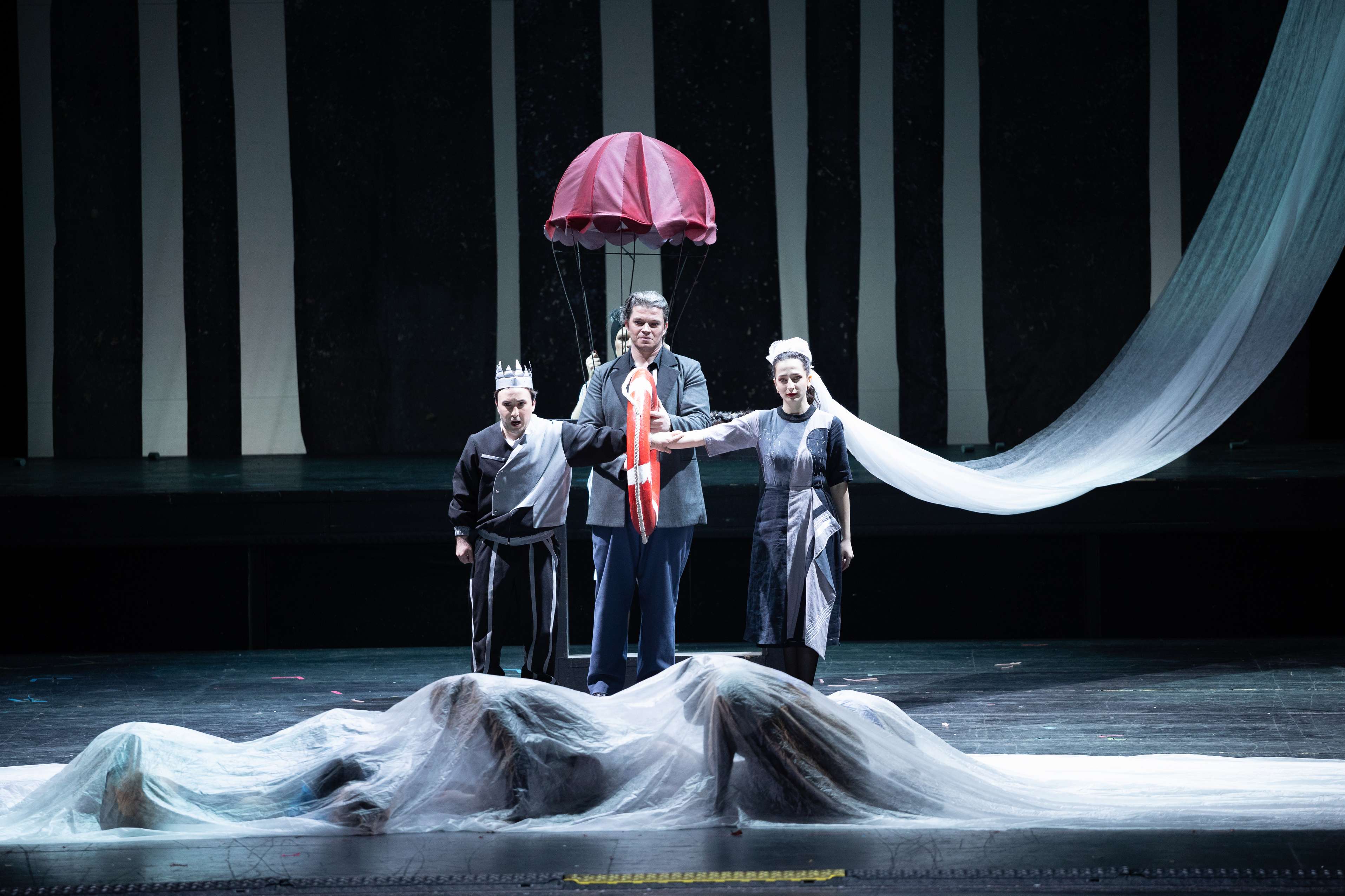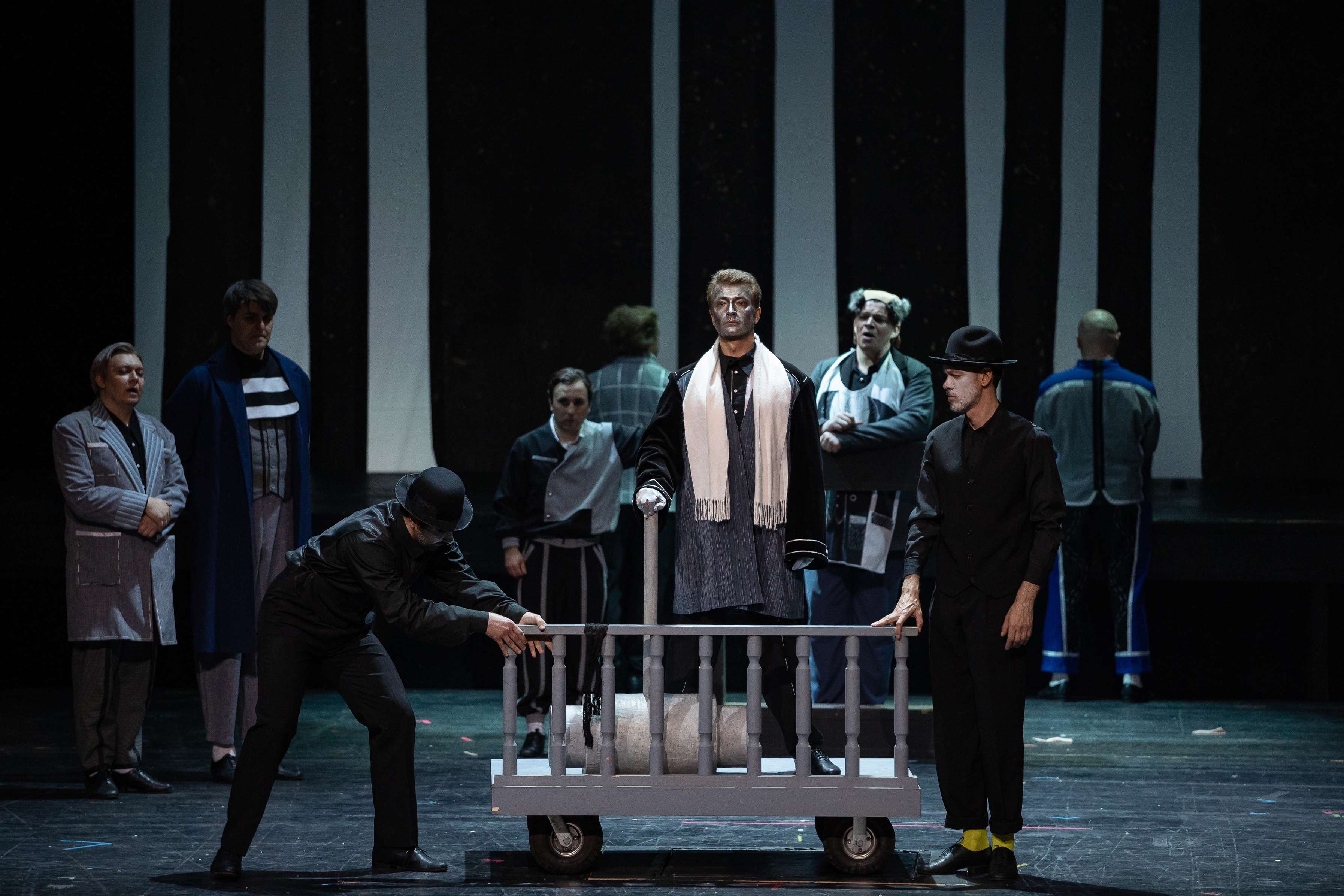 «Джанни Скикки» (начнем с него, поскольку хронологически это первый спектакль триады) режиссер Бахшиева делала со сценографом Василисой Кутузовой (она же создала костюмы, свет и видеоконтент). Оформление спектакля – пожалуй, самый разочаровывающий его компонент. Действие оперы, согласно либретто Джоваккино Форцано, происходит в ренессансной Флоренции, о которой лирический герой повествования Ринуччо восторженно поет в своей арии «Флоренция, как цветущее дерево». Но вместо золотисто-пастельного солнечного города на берегах Арно зритель видит унылое серо-черное пространство, почти пустую сцену, с колосников свисают серые «сталактиты» неясного предназначения, в центре же размещена некая ниша, по-видимому, один из кругов Дантова ада, куда должны угодить и уже почивший Буозо Донати, и его алчные родственники, и хитроумный плут Скикки. Идея считывается, но ее воплощение навевает скуку. То же касается и антиэстетичных, попросту уродливых костюмов сине-серо-черной гаммы: видимо, художник хотела показать душевную убогость героев, но, кажется, выявила отсутствие вкуса и чувства меры. Депрессивное оформление комической оперы – это, бесспорно, новое слово в российском театре. Если бы не остроумные находки видеоконтента (например, символы евро – в ожидании наследства и гигантская фига – при обнародовании завещания), было бы совсем невмоготу.