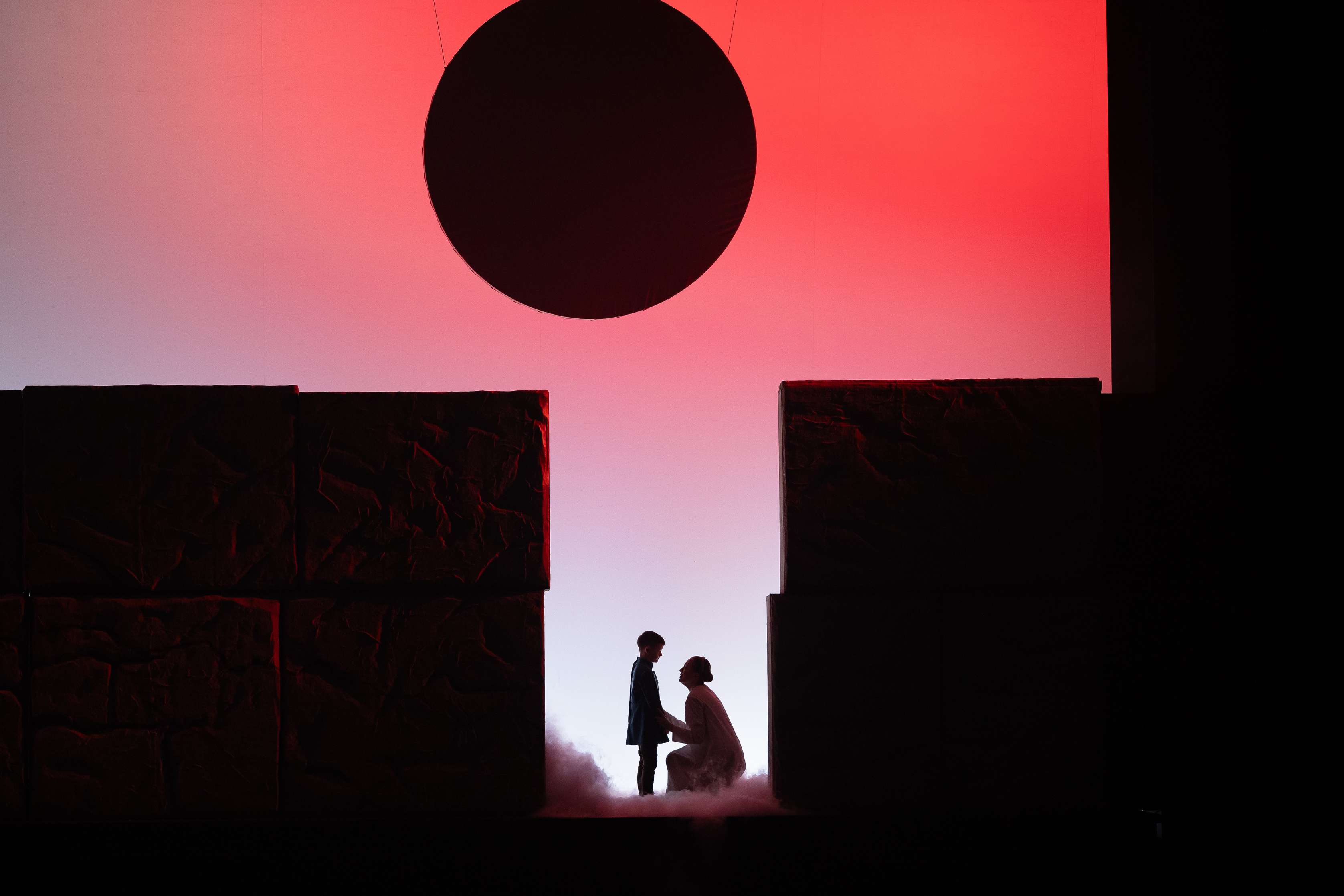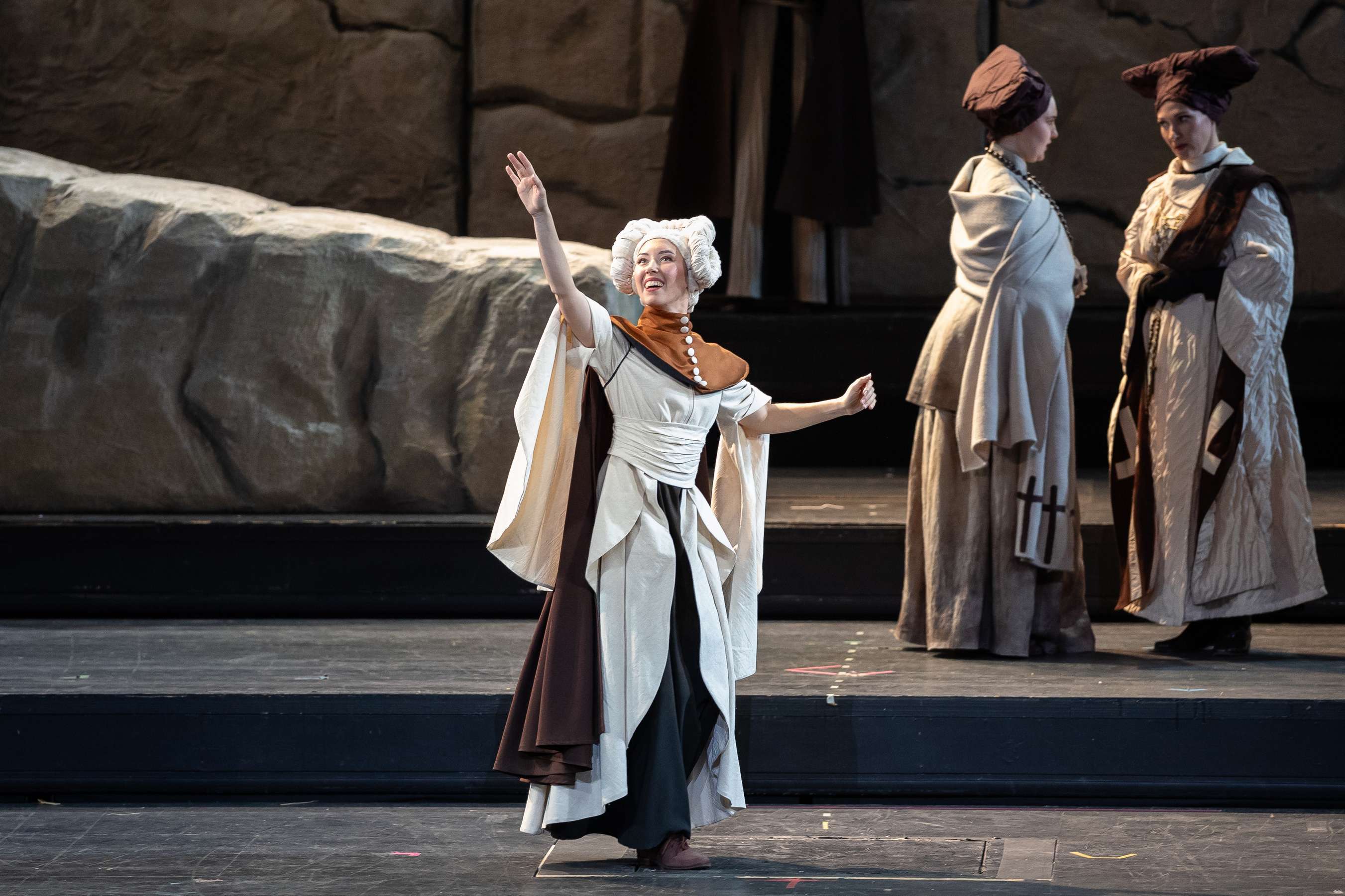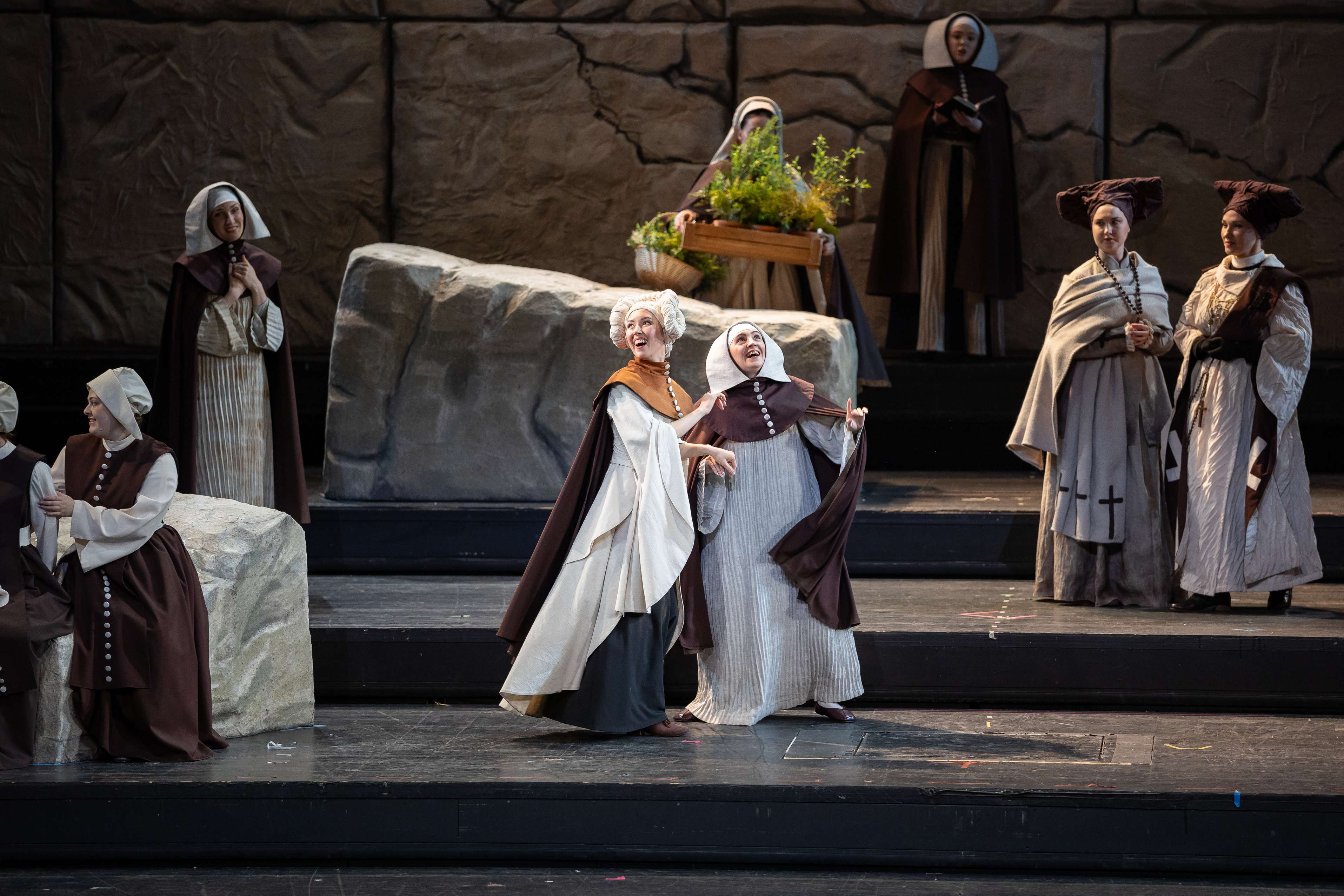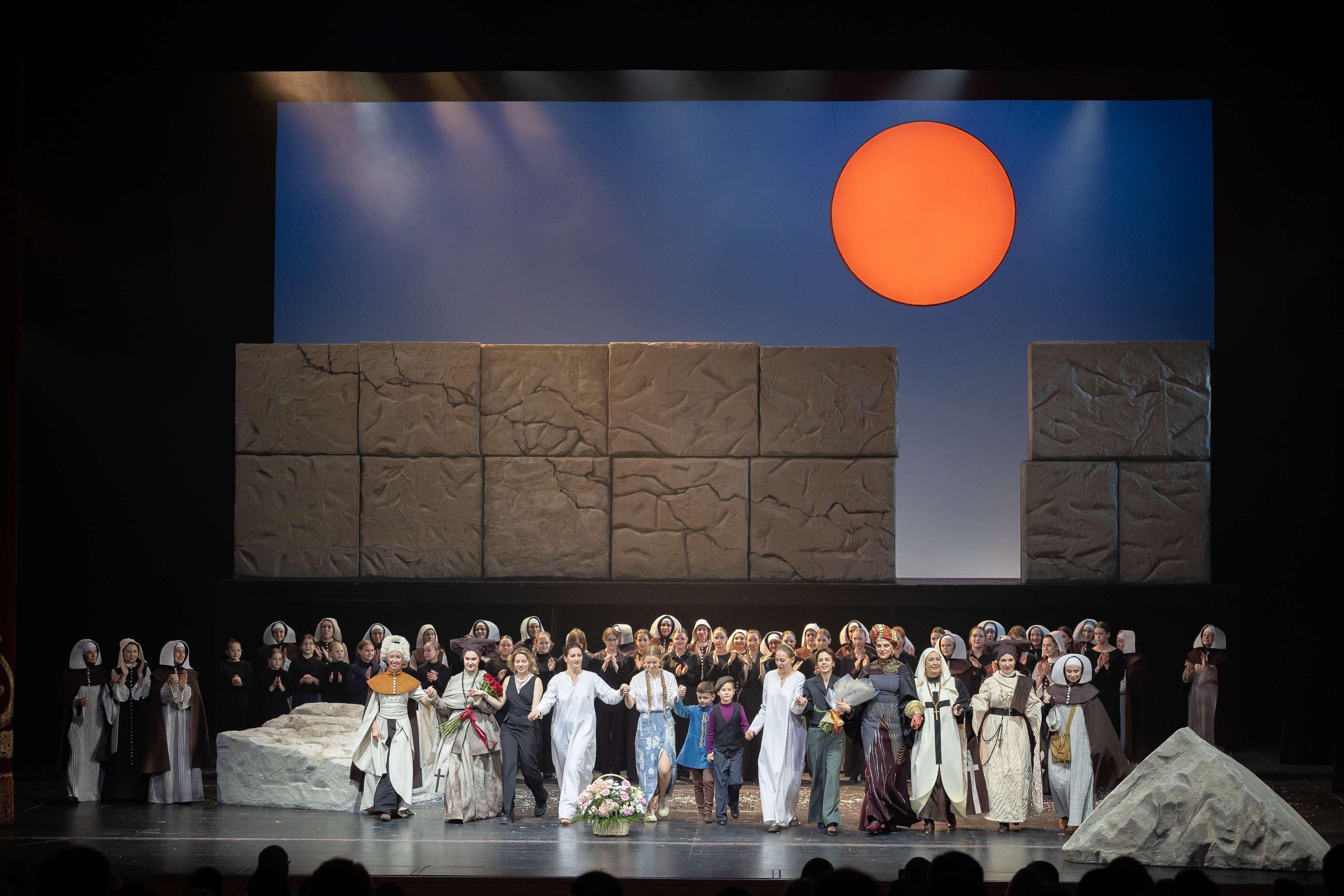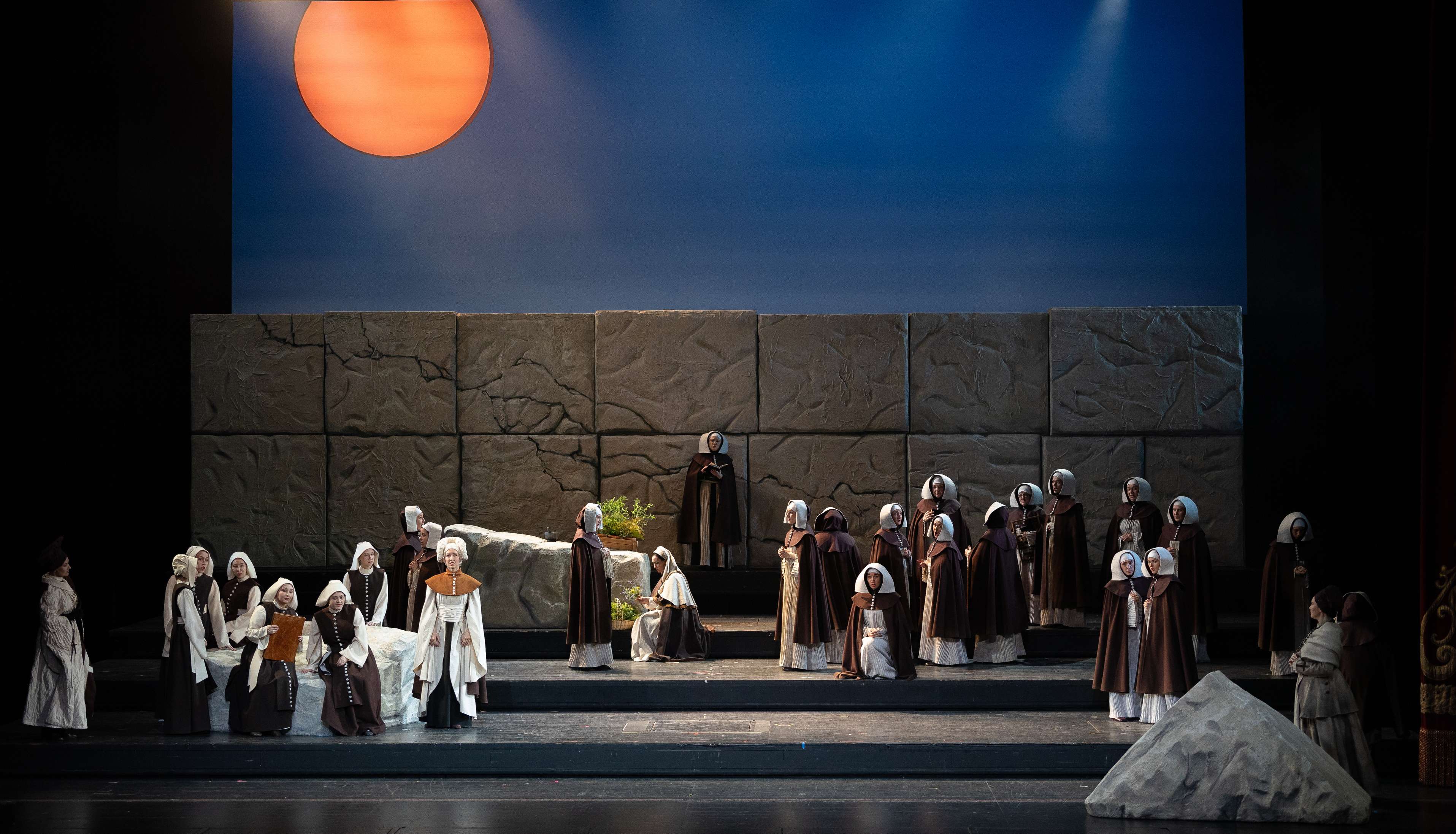 В «Сестре Анжелике» сценограф Манакова перегораживает сцену из кулисы в кулису мощной каменной кладкой монастырской стены – эти циклопические блоки, словно вынутые из египетских пирамид, навсегда разделили жизнь титульной героини на до и после. Брешь становится возможным пробить только в финале и только в предсмертных грезах Анжелики, когда в видениях она воссоединяется с умершим сыном. Огромное солнце – огненно рыжее, как апельсин, и нереально гигантское – прокатывается по небосклону от восхода до заката и становится свидетелем горестных мук, что терзают заточенную высокородную грешницу, свидетелем ее трагедии. Вневременные монашеские одеяния (костюмы Анастасии Сокольвак) создают вновь ощущение исторического решения (хотя и среди них есть необычные своей символикой облачения – например, бывшая пастушка Дженовьеффа имеет головной убор, напоминающий бараньи рога), однако, судя по Герцогине, одетой в чалму и имеющей на платье прихотливые узоры эпохи модерн, авторы спектакля не держатся за положенный по либретто XVII век, а вновь, как и в «Плаще», помещают действие во времена Пуччини – в начало ХХ столетия. Главный отрицательный персонаж оперы появляется из зрительного зала, размыкая закрытый мир монастыря иносказательно: Герцогиня – словно пришелец из невозможного места, оттуда, куда путь главной героине заказан. Режиссеру Пустоваровой удается выстроить все действие на резких контрастах (собственно, с контраста все и начинается, когда у монастырской стены героиня играет в догонялки со своим сыном, которого в действительности она никогда не видела с момента его рождения и последующего их разлучения, – и сразу после этого зритель оказывается в замкнутом монастырском дворике); неоценимым помощником в этом оказывается выразительный свет Секачёва.