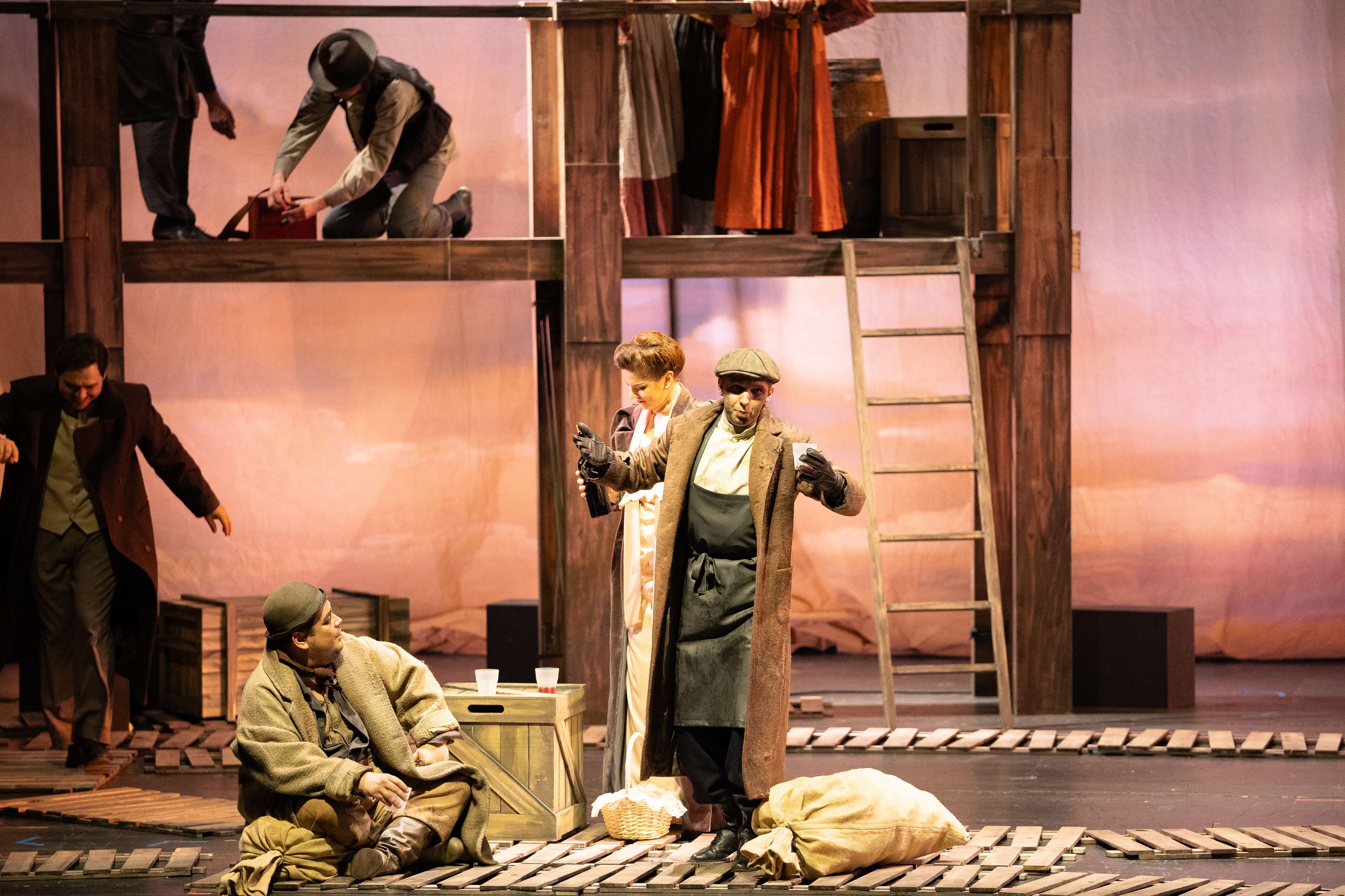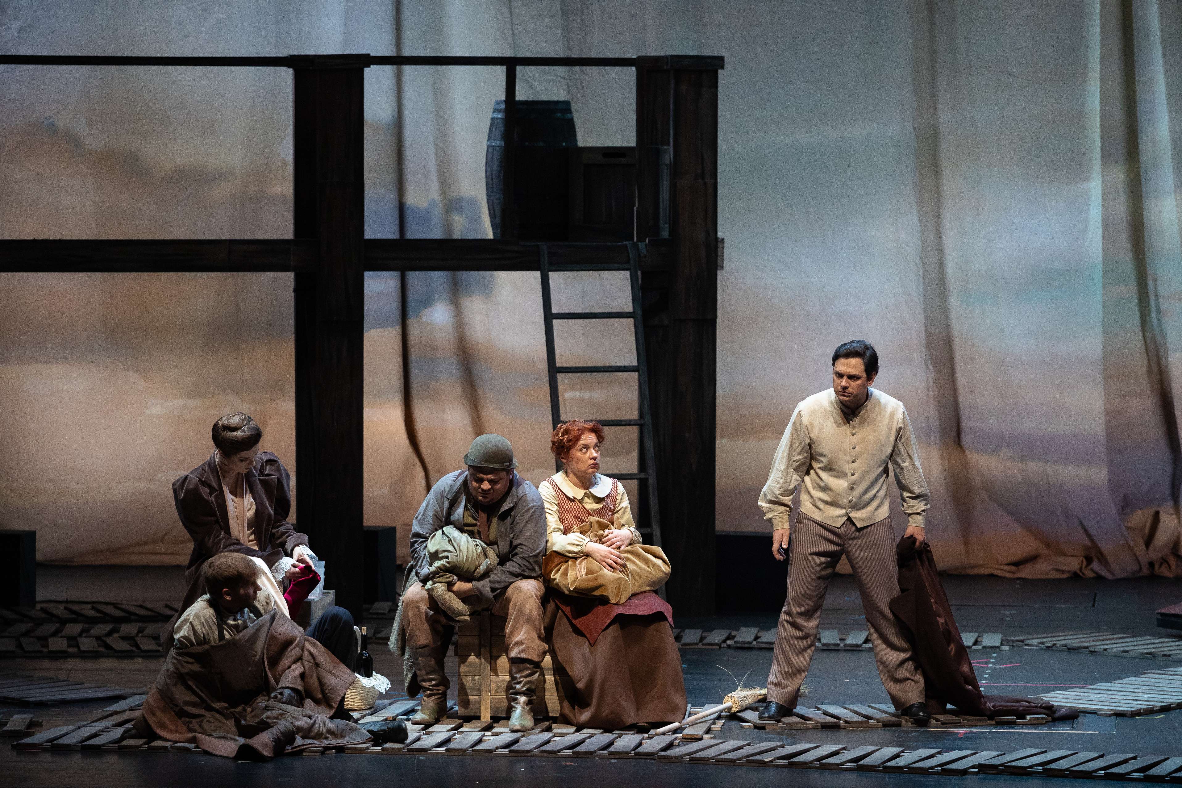 Если сценография Кутузовой скорее разочаровала, то юная художница Манакова (она тоже еще студентка ГИТИСа) нашла для двух первых опер адекватные и красивые решения. В «Плаще» это разбросанные по сцене деревянные мостки, на которых неуверенно балансируют герои зыбкого мирка натуралистичной пьесы Дидье Гольда (именно по ней делал либретто Джузеппе Адами), а также крыша затопленного дома – так художница изобразила баржу Микеле и Жоржетты: как аллегорию их навсегда ушедших под воду счастья и взаимопонимания. На заднике – огромный занавес, полный закатных красок, ярких и умиротворяющих, а потому обманчивых: когда Жоржетта обнаруживает под плащом труп своего возлюбленного Луи, Микеле срывает этот занавес, оказывающийся всего лишь бутафорией, как и их давно утраченная семейная идиллия, – на самом деле в их жизни давно царит холодная, темная, безрадостная и бесперспективная ночь. Костюмы героев (Стефания Филатова) говорят о начале прошлого века – благодаря этому спектакль воспринимается как классический. Режиссеру Дашуниной удалось создать напряженное действие, увлекающее своим ходом и цепко держащее внимание публики, подробно поработать с актерами над образами, каждый из которых колоритен. Особенно удались эпизодические характерные персонажи – Тинка (Никита Шаров), Тальпа (Ренат Латыпов), Фругола (Анна Костенко). Триада первачей убеждает вокально-драматическими решениями: богатое и сильное сопрано Евгении Бумбу (Жоржетта) – находка для веристской драмы, мощный баритональный тенор Ивана Волкова (Луи) идеален в воплощении раздирающих героя страстей, баритон-хамелеон Романа Николаева (Микеле), умеющий быть то сдержанно деликатным, то страстным, то мстительно холодным, – попадание в образ обманутого мужа-ревнивца.