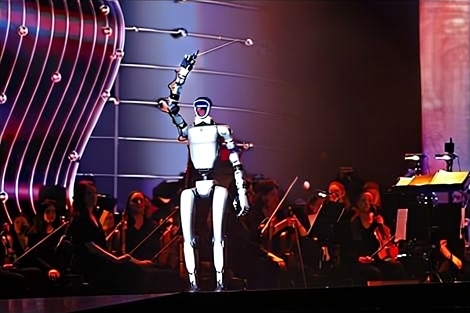 Изобретательно решены и концертные номера. Так, рахманиновская «Сирень» зазвучит в исполнении двух певиц — живой и некоей идеальной в виде ИИ-голограммы с искусственно сгенерированным голосом. Во Втором фортепианном концерте публика увидит в качестве солиста самого автора (для этого номера из старой записи с Филадельфийским оркестром было извлечено звучание игры самого Рахманинова, а за рояль «пригласили» его голограмму). Танцем рыцарей из балета Прокофьева «Ромео и Джульетта» продирижирует робот, представленный как Новус Железновус.