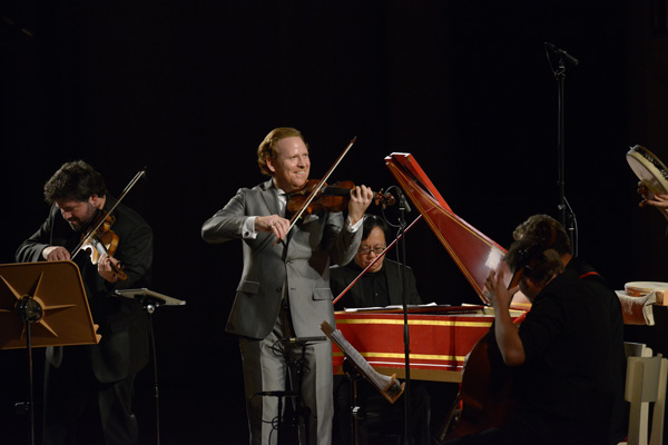 Практически перед всеми исполняемыми номерами Хоуп произносил небольшое вводное слово, придав черты познавательной лекции концерту в двух отделениях, включавшему как популярную, так и почти неизвестную у нас музыку. Наряду с Генделем и Вивальди было очень интересно услышать сочинения итальянца Андреа Фальконьери, славившегося в XVI веке своими любовными похождениями, музыку дрезденского композитора XVII века Иоганна Пауля фон Вестхофа, за тридцать лет до Баха сочинявшего партиты для скрипки-соло (Хоуп виртуозно исполнил его пьесы «Подражание колоколам» и «Подражание лютне»), или пьесу «Тамбурин» современника Баха – француза Жан-Мари Леклера, в которой игравший в коллективе Хоупа ударник Михаэль Мельтцер устраивал самые настоящие фокусы, заставляя бубен вращаться по полу словно живой волчок, точно попадающий в ритм. Остальные участники интернационального камерного ансамбля (скрипач Симос Папанас, виолончелист Никола Моска, лютнист Эмануэль Форни и клавесинистка Наоки Китайя) показали себя не менее виртуозными мастерами и чуткими музыкальными партнерами.