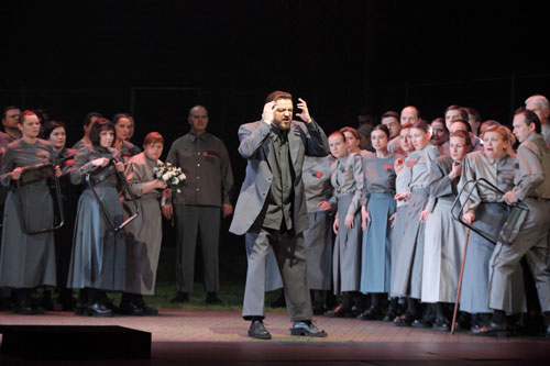 Владислав Сулимский, который знает эту партию вдоль и поперек, поскольку на протяжении нескольких сезонов с большим успехом поет ее в Мариинском театре, рассказал, что привнес много своего в сценическую трактовку роли. Смакуя актерскую игру, он словно вспоминал о героях Достоевского, «вчитывая» знаменитое «тварь я дрожащая или право имею» в вердиевский текст, размыкая его уже в XXI век. Сопрано Татьяна Мельниченко отлично решала все режиссерские задачи, размашисто раскрашивая вокальную партию смелыми штрихами – от шепотов до крика. Ну а смерть Макбета, который перед этим успел еще ужаснуться видениям двенадцати королей в виде граффити, и вовсе произошла фактически на фоне магриттовской рамы: был человек с его странными желаниями или его не было?