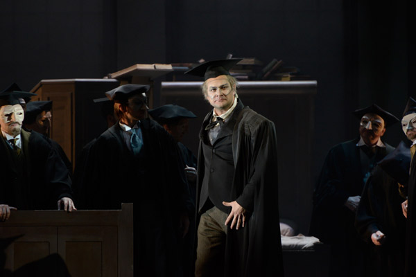 При всей своей приземленности опера Гуно затрагивает, безусловно, и метафизический слой, пусть исключительно в условно-оперном антураже. В российских оперных театрах до последнего времени «Фауст» влачил существование как концентрация всего самого консервативного и косного, что только может быть на оперной сцене, – пошлые фокусы позера Мефистофеля, бытовые подробности с бюргерскими бутафорскими пивными кружками, бессмысленно толкущаяся на сцене массовка, нафталинный провинциализм нравов условно немецкого городка. В Мариинском театре подобная архаичная постановка «Фауста» шла до конца 1990-х. Гениальным Мефистофелем был в свое время великий бас Булат Минжилкиев, наследник великой шаляпинской традиции актерского пения, на которого в этом спектакле ходили. С тех пор «Фауст», эта одна из самых кассовых опер, исчезла из репертуара Мариинского более чем на десять лет.