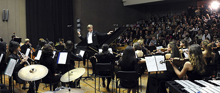 На снимках: Симфонический оркестр УМК и дирижер А. Шабуров; Д. Мацуев вручает грамоты фонда «Новые имена» учащимся УМК; квартет виолончелей УМК; руководитель оркестра «Лицей-камерата» с 1963 года В. Усминский; профессор музыкальной академии Мусашино (Токио), «Института Голандски» в Принстоне, приглашенный профессор Джульярдской школы музыки, Нью-Йоркского университета, выпускник десятилетки И. Итин и заведующая фортепианным отделением М. Олле; Ю. Башмет на репетиции оркестра УМК