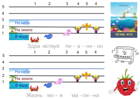«Мы структурировали нотный стан, разделили его на такие зоны, которые привычны нашему сознанию, – рассказывает Антон Александрович. – Получилась аналогия того, как устроен мир: мы стоим на земле, внизу, под ногами, у нас вода, над головой – небо. В каждой из этих зон мы поселили друзей, так называемых героев. Секрет успеха: структурирование и легкие для восприятия ассоциации, которые вписываются в эту структуру. Мы берем только скрипичный ключ, первую октаву – для начинающего все должно быть постепенно. В воде у нас живет резвый кит, на земле фантазер Фа, в небе Ля – лягушка на Луне. Не очень много лягушек на Луне вы, наверное, встречали, но это небольшое противоречие неплохо запоминается, как показала практика. И мультяшная тема очень нравится детям. А далее – изображения этих героев мы кладем на клавиши фортепиано и на нотный стан, и – ученики начинают играть. Следующий этап – постановка руки, и здесь мы придумали различные подходы, игры по сути: кормить «друзей», путешествовать с ними, спасать и, через игровые ситуации, правильно ставить руки на клавиши, играть всеми пальцами, оттачивать мастерство.