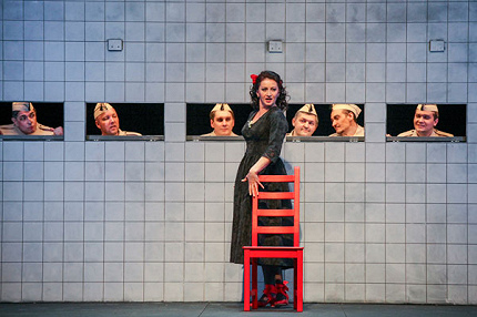 В пермской «Кармен» Исаакяна присутствовала жесткая концепция, или, по меньшей мере, сквозная идея. В московской главным формообразующим элементом стали работы Пикассо – из числа тех, что связаны с темой корриды. В самарском спектакле скорее можно говорить о более или менее локальных арках и точечных решениях, многие из которых, однако, по-настоящему впечатляют. Взять хотя бы эпизод с появлением работниц в первой картине, решенный в неожиданно белых тонах и почти что балетной пластике. Мы видим девушек в большой душевой комнате, где они совершают омовение, но без всякой «обнаженки»: в этой сцене явно больше эстетства, нежели эротизма. Однако «фишка» еще и в том, что солдаты и прочие праздные зеваки, в отличие от зрителей в зале, наблюдают за ними, по очереди прикладываясь к замочной скважине. Зато когда чуть позже в том же пространстве окажется Кармен – уже одна, без товарок, – то ее они смогут созерцать сквозь внезапно обнаружившиеся в стене небольшие окошки вроде тюремных…