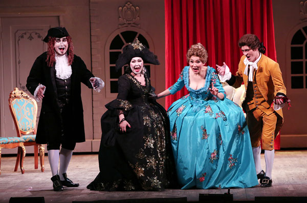 В перемену сценографии вовлечены артисты хора: в пасторальную «пейзанскую» среду они ассимилируются превосходно, и их профессиональная слаженность достойна того, чтобы это отметить. Хоровой пласт оперы невелик, но из-за расширения функций артисты хора – практически перманентная единица спектакля. С той же легкостью, с какой они переставляют «кубики» сценографии (части фасада замка, необходимую мебель и кадки с цитрусовыми деревьями), режиссером вплетается и множество игровых мизансцен: они акцентируют поворотные моменты сюжета, оттеняя комическое.