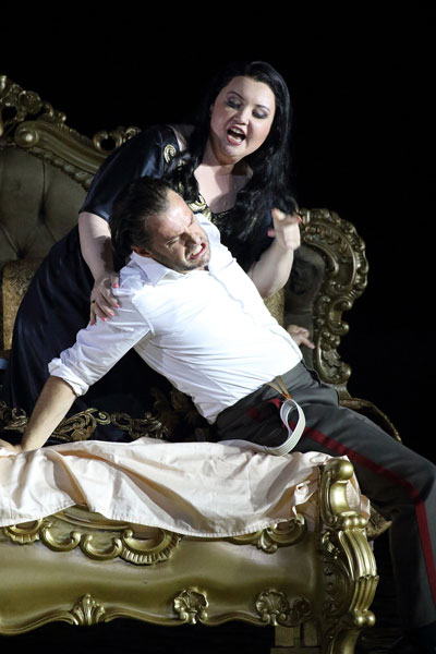 На трех сторонах-панелях – «дворцовые» панно: это фото из семейного альбома. Боковые панели способны раскрываться, как страницы книги, создавая новые сюжетные пространства, а задняя панель в нужные моменты открывает нишу – еще один (верхний) уровень, «обживаемый» как массовкой хора, так и солистами. На плацу сцены постоянно идет «позиционная рекогносцировка», которую - ничего не остается, как считать за мизансцены. Театральная мебель выдвигается лишь по мере необходимости. Это постамент с черным гробиком Нина, из которого он в виде призрака «эффектно» вылезает в финале первого акта, и вспомогательные постаменты-горочки для «знатных» персонажей. Это и кровать-сексодром: на ней картинно, словно в пластическом этюде, выясняя непростые и далеко зашедшие отношения, «резвятся» Семирамида с Ассуром. Это и массивный стол в кабинете Ассура, дикаря-варвара в военной форме и топором в руке. Так что режиссер-американец с драматургом-немцем Даниэлем Менне постарались от души – спасибо, что довольно осмотрительно!