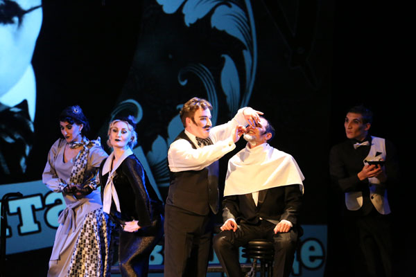 В этом спектакле схлестнулись стильная дагерротипная сценография (переносящая действие оперы в Америку межвоенного периода с его черно-белым немым кинематографом и эстетикой строгого и одновременно фешенебельного ар-нуво: на уроке пения Розина исполняет, конечно же, Summertime Гершвина) и лихой «замес» буффонной стихии, полной «идиотизмов», изрядно веселящих публику, когда доктор Бартоло со своими подручными ворожит над не то еще живым, не то уже бездыханным пациентом, «домоправительница» Берта, изливаясь душевными муками в известной арии, в порыве отчаяния прибивает выскочившую из-под стола упитанную мышку и легким движением руки отправляет ее в кастрюлю с супом, а Фигаро рекламирует свою цирюльню «видеопрезентацией», совмещенной с дефиле обслуживаемых ушлым парикмахером дамских типажей. Эта на первый взгляд странная встреча высекает подлинную искру – рождается дух настоящего комического спектакля, прочитанного свежо (что само по себе непросто в этом заигранном до дыр сюжете), но ни в чем не погрешившего против замысла авторов оперы. Чепинога филигранно работает с каждым персонажем, получающим яркий, запоминающийся рисунок роли, – в итоге постановка полна актерских удач: это не только фееричный Бартоло неподражаемого геликоновца Дмитрия Овчинникова, но и вальяжный Фигаро-ловелас Сергея Майданова, и колоритнейшая Берта Элеоноры Кипренской, сумевшей в эпизодической роли встать вровень с протагонистами (оба – артисты филармонии).