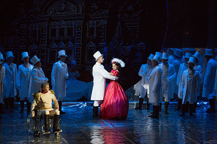 Мертвенное синее пространство первого акта, иллюстрирующее лед в душе героя, сменится зелено-черным ларинским балом с бильярдным столом по центру. Намек на то, что «наша жизнь – игра», могущая окончиться и трагически, реализуется в выдержанной в той же гамме сцене дуэли. Та превратится в бело-черный петербургский бал, где по щиколотку в воде, щедро разбрызгивая по сцене фонтаны, солисты, хор и балет будут уверять публику, что сердечный лед героя наконец-то растоплен и жди половодья чувств. Идея проста, как дважды два. Но в какие претенциозные и пестрые одежды – в прямом и в переносном смысле – она оказалась разряжена!