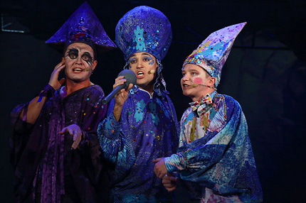 Спектакль Стрежнева и сценографа Павла Каплевича ярок и динамичен, как сама музыка Журбина, построен на контрастах и парадоксах. Кишащему скопищу бессмысленно и беспрестанно веселящихся полулюдей-полурептилий противостоит светлая пара любящих сердец – в их образах угадывается что-то даже не античное, а древнеславянское. Их антиподы – угрюмый циник Харон и неумолимая, как черная дыра, Фортуна. В слаженном ансамбле артистов, безгранично музыкальных и виртуозно реализующих замысловатую пластику Сергея Смирнова, выделяются харизматичные Никита Кружилин (Орфей) и Игорь Ладейщиков (Харон) – очень разные, оба откровенно красивые, с невероятными, редкими для мюзикла сильными и богатыми голосами.