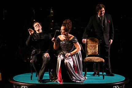 Однако идея оркестра на сцене влечет и определенные музыкальные издержки. Потому что, когда дирижер не видит певцов, а те могут видеть его лишь на экранах мониторов, каковые сами же постоянно друг от друга заслоняют, тот или иной «раскосец» практически неизбежен. Понятно, что больше всего его будет у того состава, который меньше репетировал с оркестром и дирижером. А если его столько, как на втором представлении (это был один из тех случаев, когда пресловутый «закон второго спектакля» сработал по полной программе – и не только в музыкальном плане), то для кого-то, кто побывал только на нем, это может заслонить все достоинства постановки и исполнения. Впрочем, расхождения между солистами и оркестром, увы, имели место и на других спектаклях – и с самим Федосеевым, и с Валерием Кирьяновым. Последний в целом провел оперу на весьма достойном уровне, а более подвижные в те или иные моменты темпы способствовали и более динамичному тонусу спектакля.