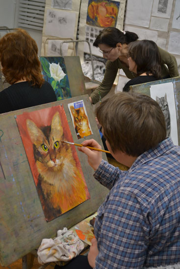 Подготовительные отделения – явление повсеместное, а вот работа с людьми разных возрастов, разных профессий, но единых в стремлении овладеть навыками передачи красоты средствами живописи в настоящее время встречается редко. Необыкновенно дружественная и творческая атмосфера складывается у педагогов с взрослыми учениками студии изобразительного творчества «Палитра». Эти обучающиеся, приходя на уроки в школу, становятся самыми требовательными и самыми благодарными учениками.