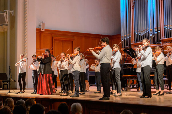 На снимках: Объединенный ансамбль скрипачей МГОДШИ «Измайлово» выступает в Большом зале Московской консерватории; И. Фомичева